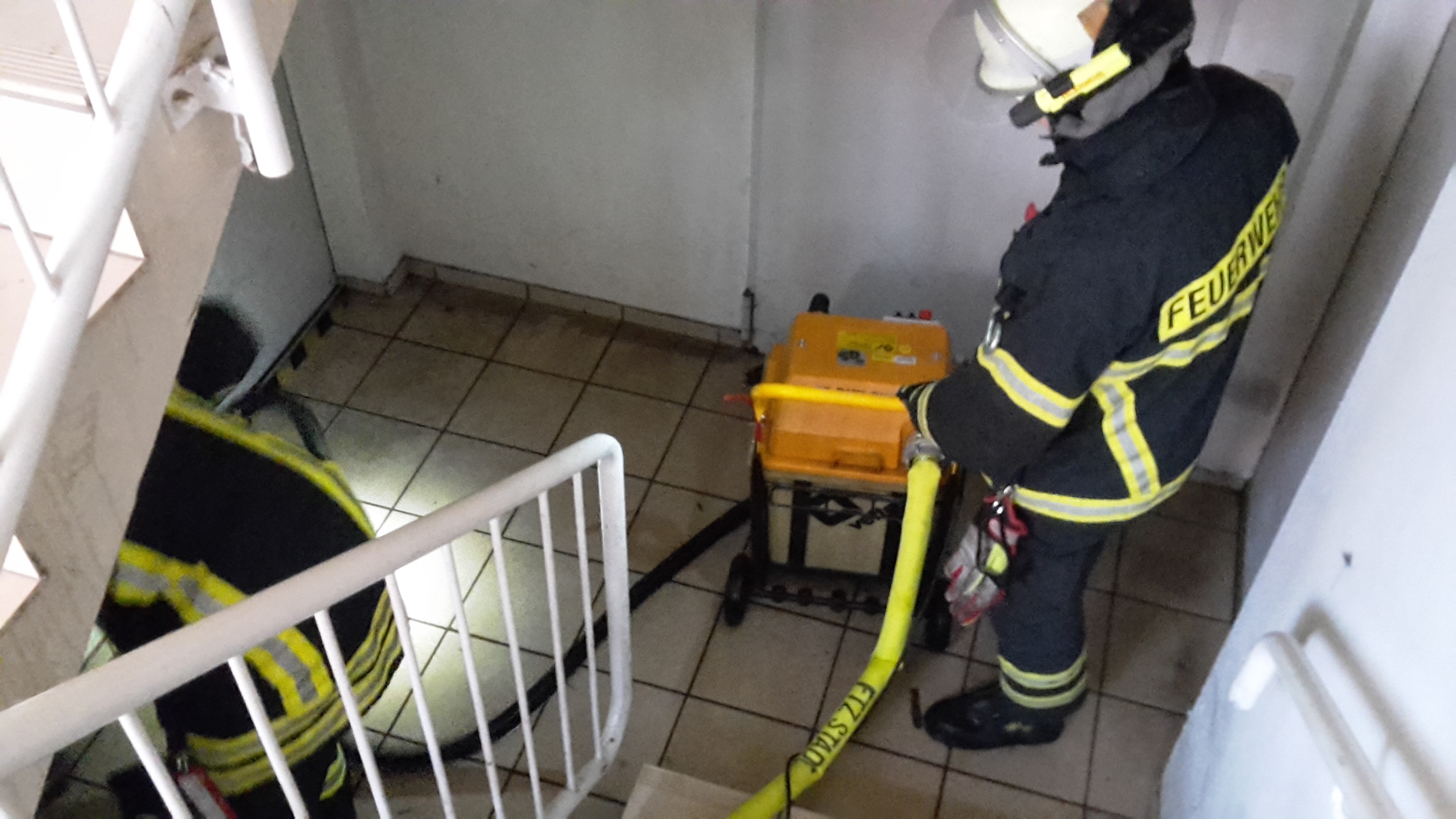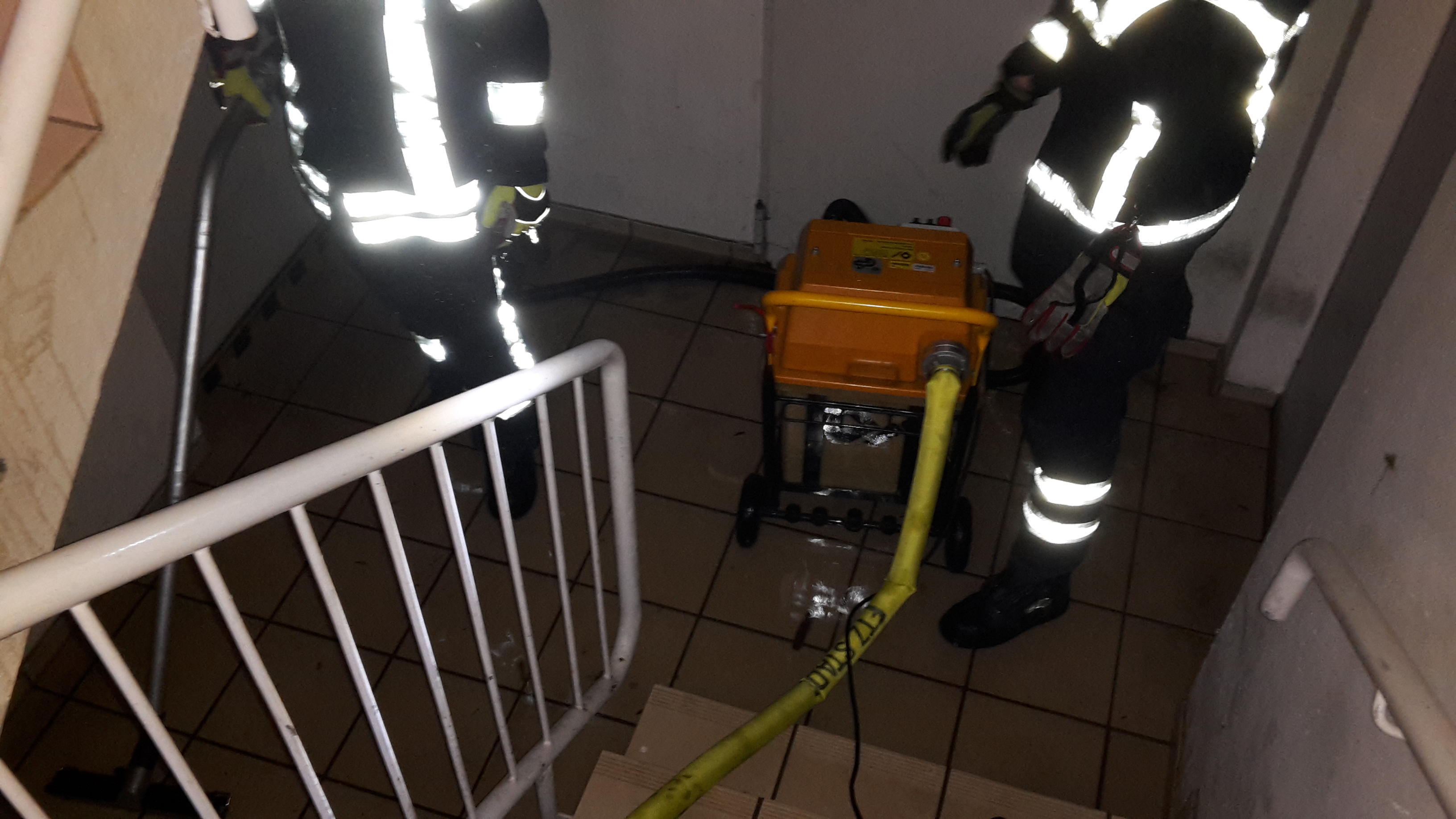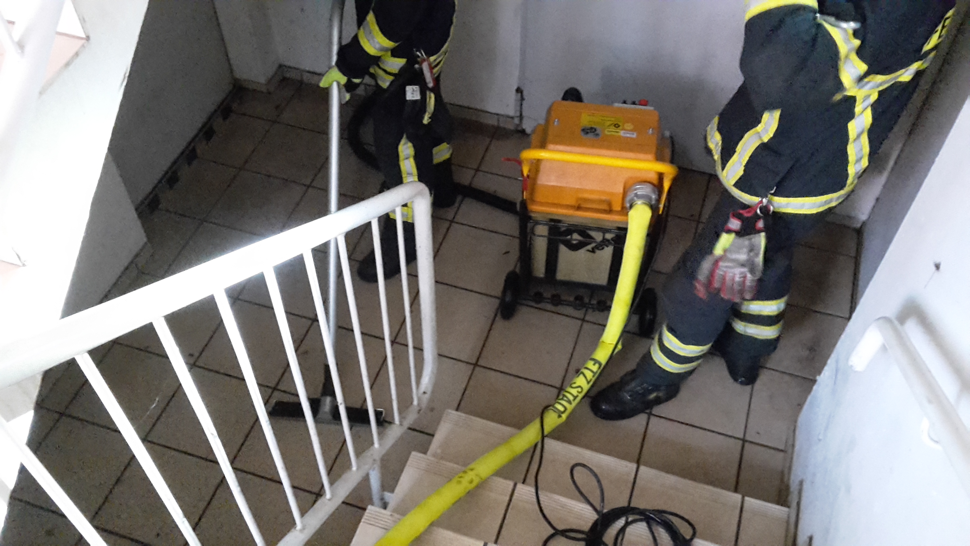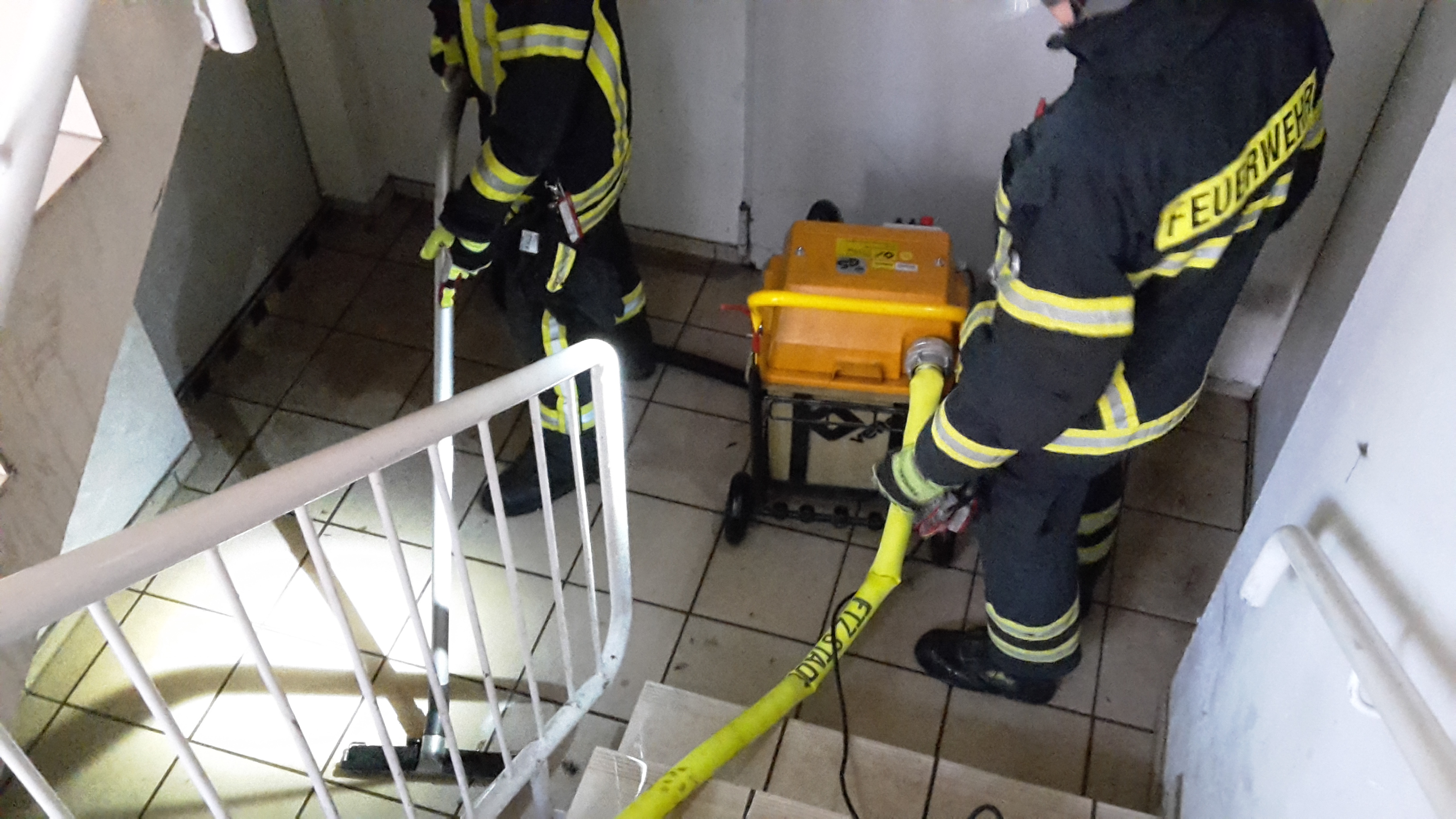 Zunächst wurden die Einsatzkräfte vom Zug I der Ortsfeuerwehr Buxtehude in die Vogelbeerenstraße alarmiert. Ein Bodenablauf konnte den Regen nicht mehr aufnehmen. Durch den tief gelegenen Hauseingang eines Mehrfamilienhauses waren die Wassermassen schließlich zur Treppe gelaufen. Etwa zehn Zentimeter Wasser standen im Kellerbereich des Treppenhauses. Mit einem Wassersauger wurde die Flüssigkeit abgepumpt.