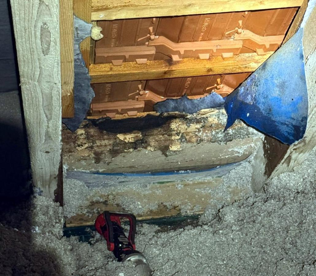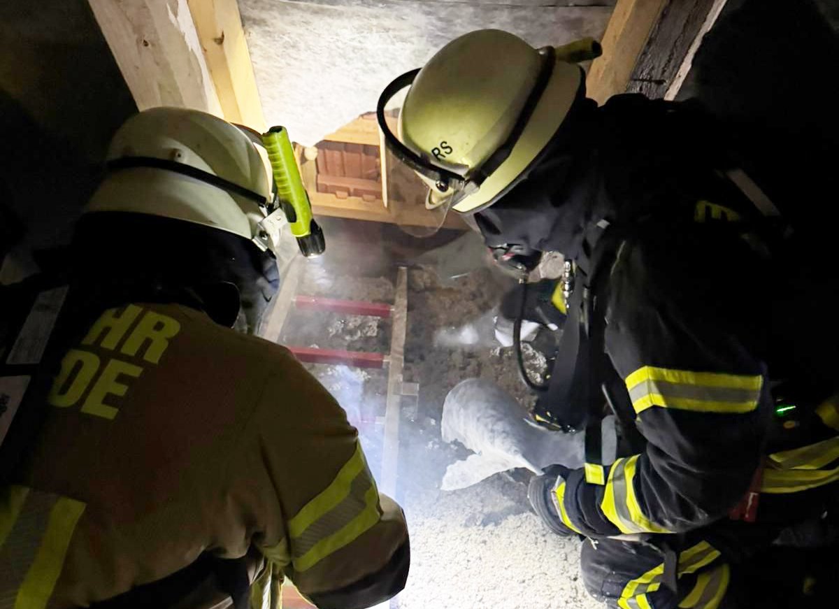 Vor Ort konnten die Einsatzkräfte von außen zunächst keine Feststellung machen. Erst eine Lageerkundung an der Brandmeldeanlage ergab eine Auslösung eines Melders im Bereich des Dachstuhls. Dort waren die Räumlichkeiten bereits leicht verqualmt und ein Brandgeruch war feststellbar. Die Einsatzkräfte gingen mit C-Rohr und Wärmebildkamera vor, um die genaue Brandstelle zu suchen. Diese konnte dann in einem Bereich zwischen Dacheindeckung und Dampfsperre festgestellt werden. Auf einer nur wenige Quadratzentimeter großen Fläche glimmte die Holzfaserdämmung. Diese wurde dann entnommen und das Feuer konnte schnell abgelöscht werden.