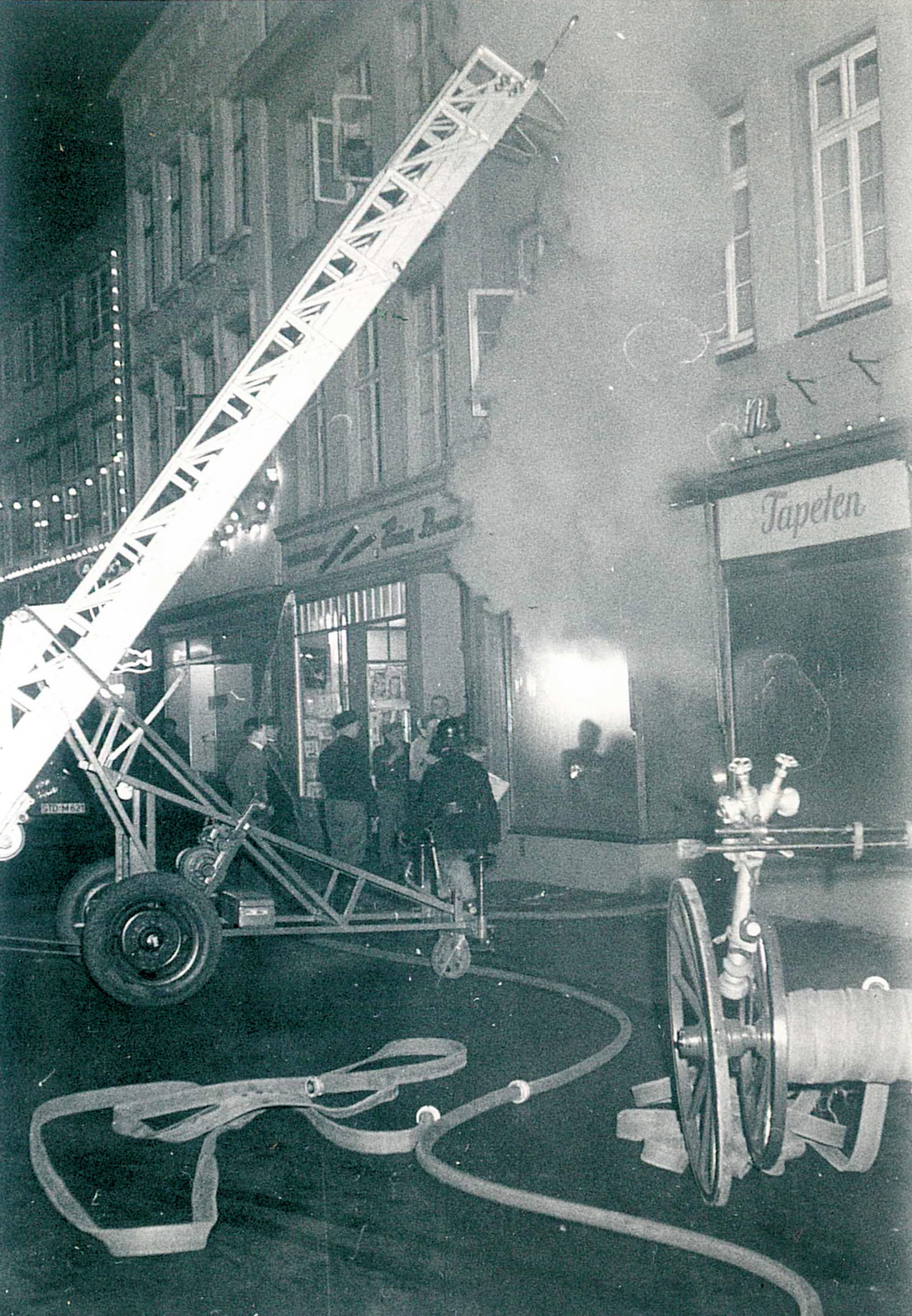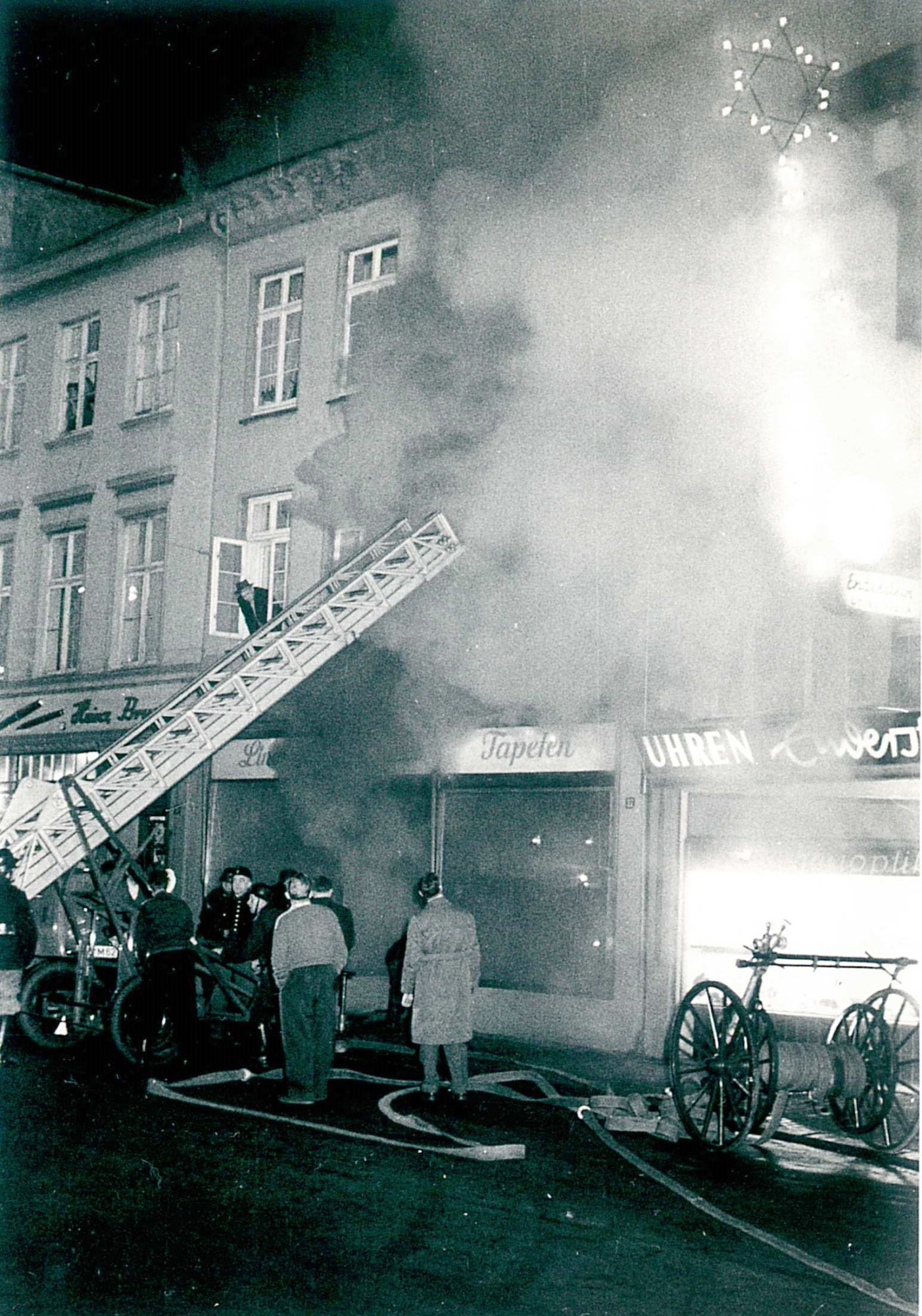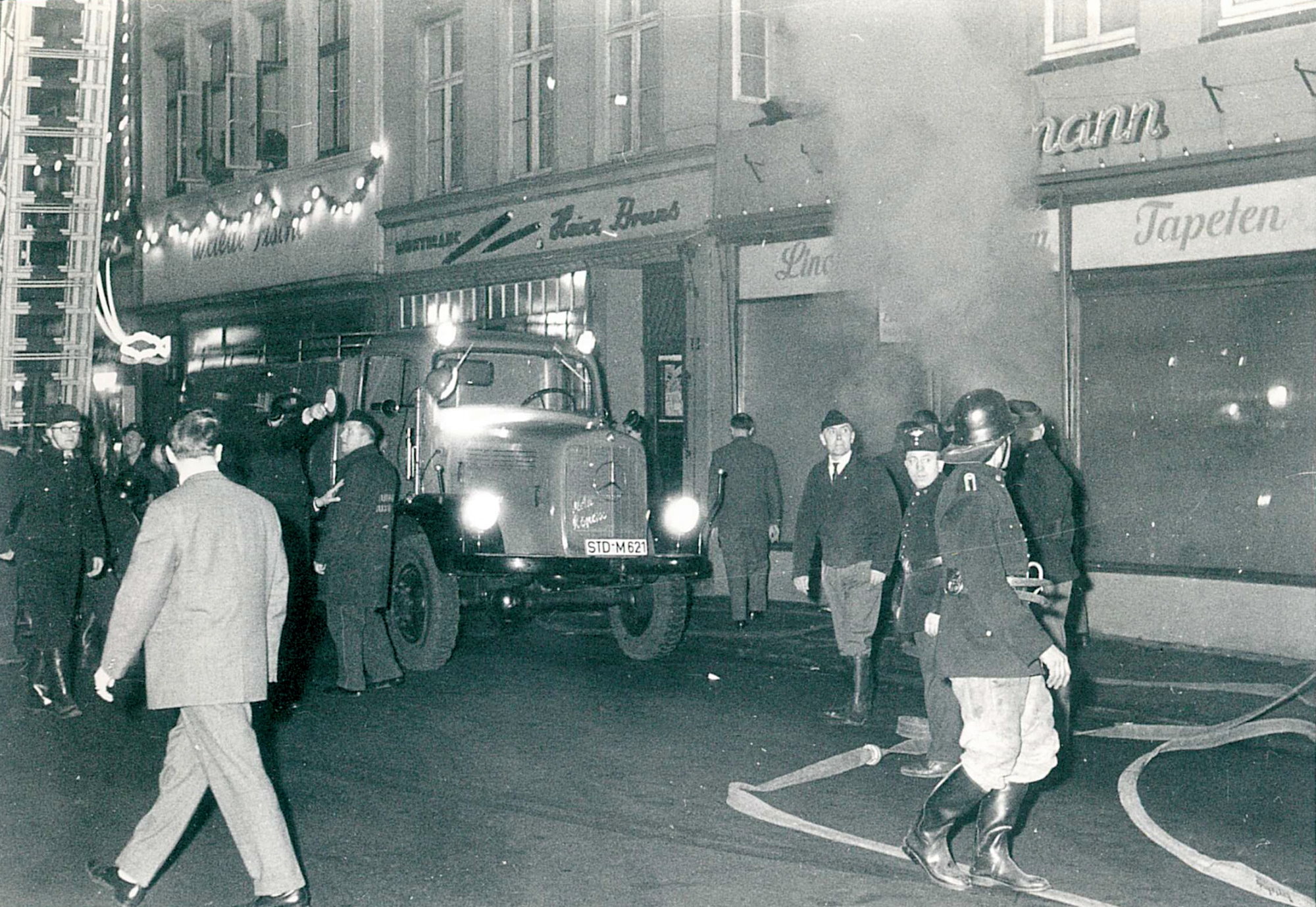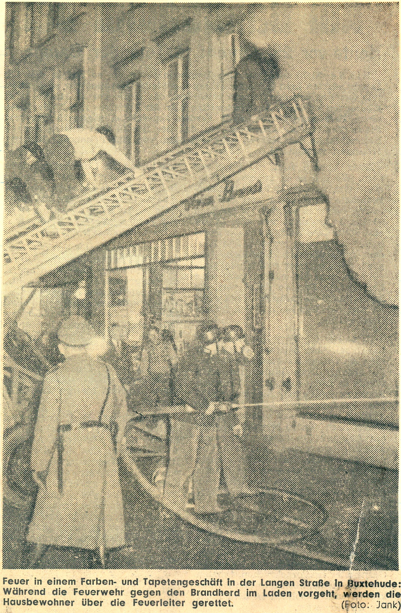 Glücklicherweise wurde das Feuer im Farbengeschäft am Samstag 12.12.1959 am Rathausplatz noch rechtzeitig entdeckt, es hätte weitaus schlimmer enden können. Gegen 17 Uhr hatte ein Bewohner des Wohn- und Geschäftshauses den Brand im Ladengeschäft bemerkt und den Notruf gewählt. Der eilig herbeieilende Ladenbesitzer hatte noch vorm Eintreffen der alarmierten Feuerwehrkräfte der Buxtehuder Feuerwehr mit einem Handfeuerlöscher versucht die Flammen zu ersticken.