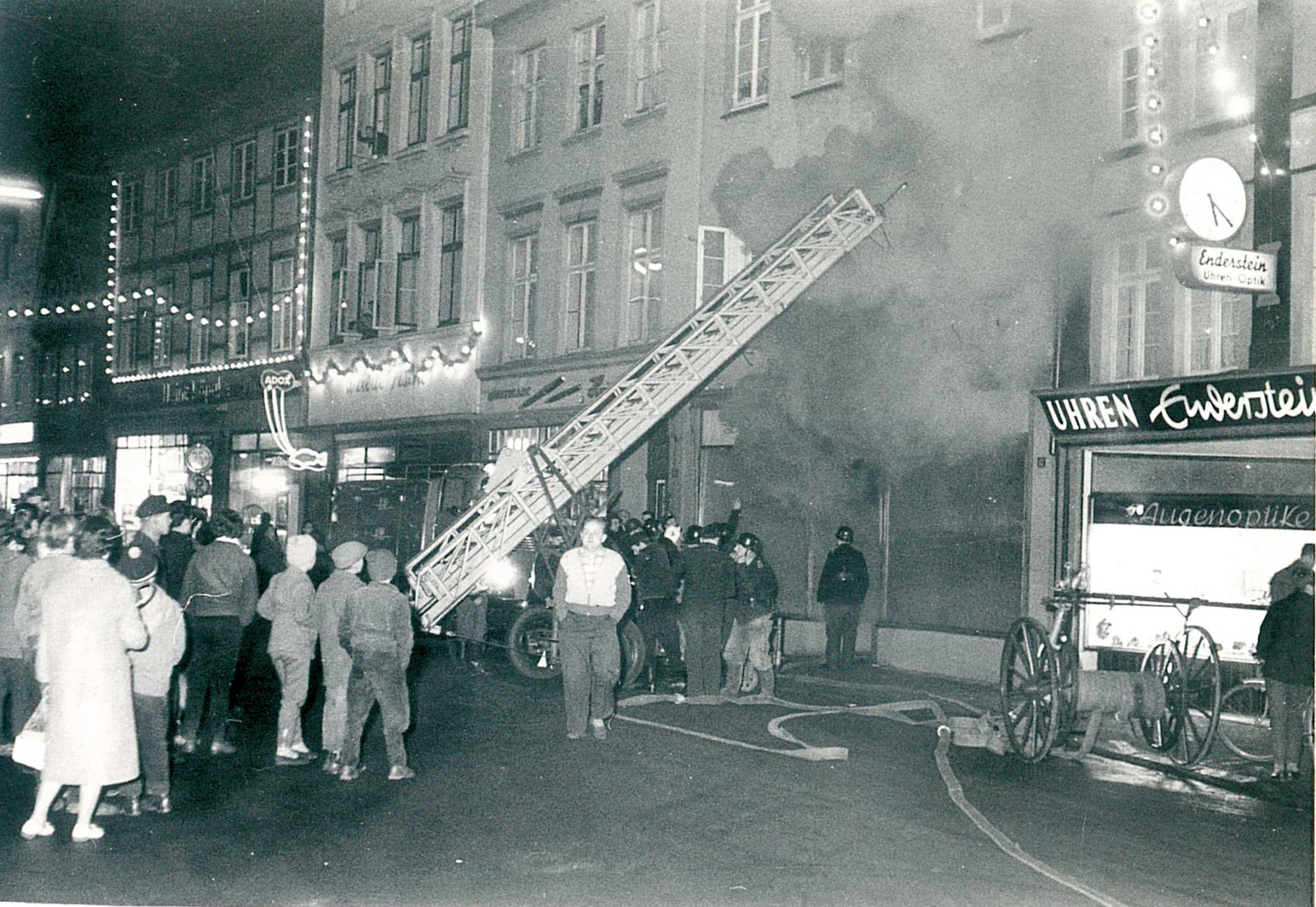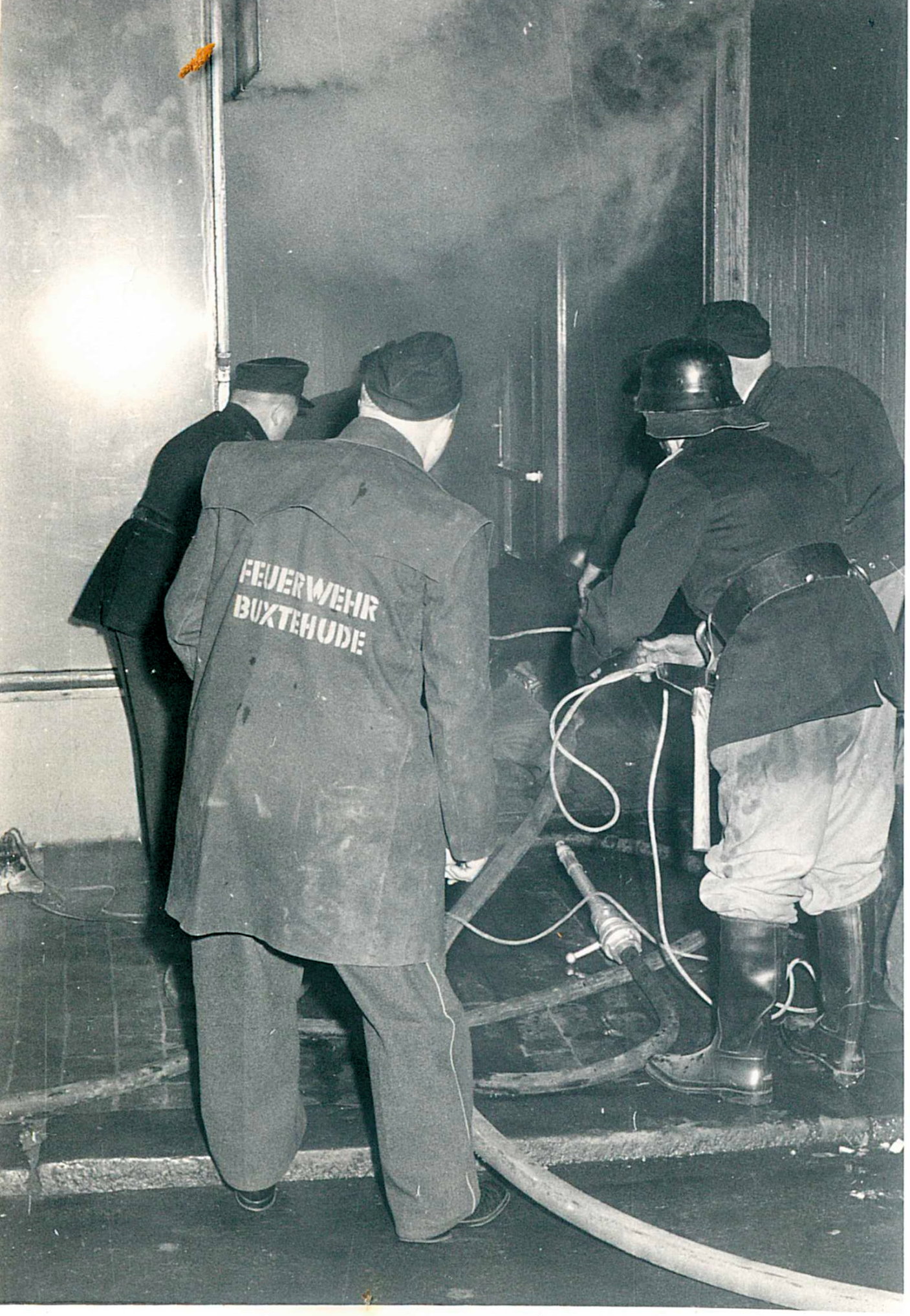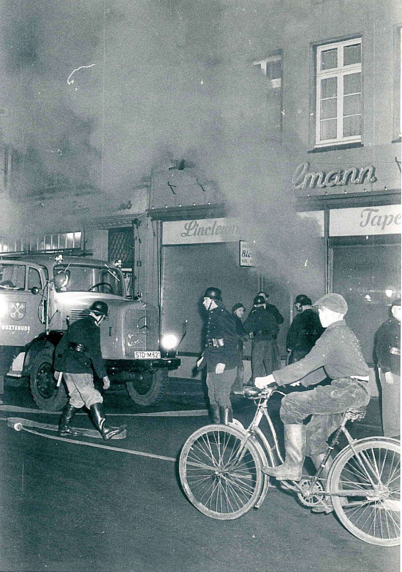 Glücklicherweise wurde das Feuer im Farbengeschäft am Samstag 12.12.1959 am Rathausplatz noch rechtzeitig entdeckt, es hätte weitaus schlimmer enden können. Gegen 17 Uhr hatte ein Bewohner des Wohn- und Geschäftshauses den Brand im Ladengeschäft bemerkt und den Notruf gewählt. Der eilig herbeieilende Ladenbesitzer hatte noch vorm Eintreffen der alarmierten Feuerwehrkräfte der Buxtehuder Feuerwehr mit einem Handfeuerlöscher versucht die Flammen zu ersticken.