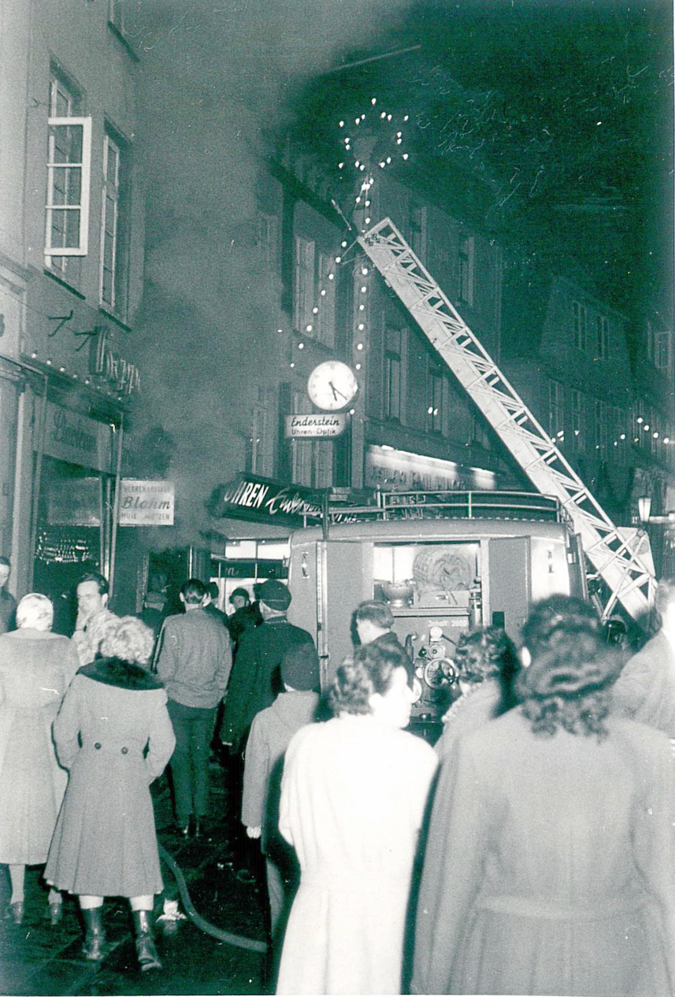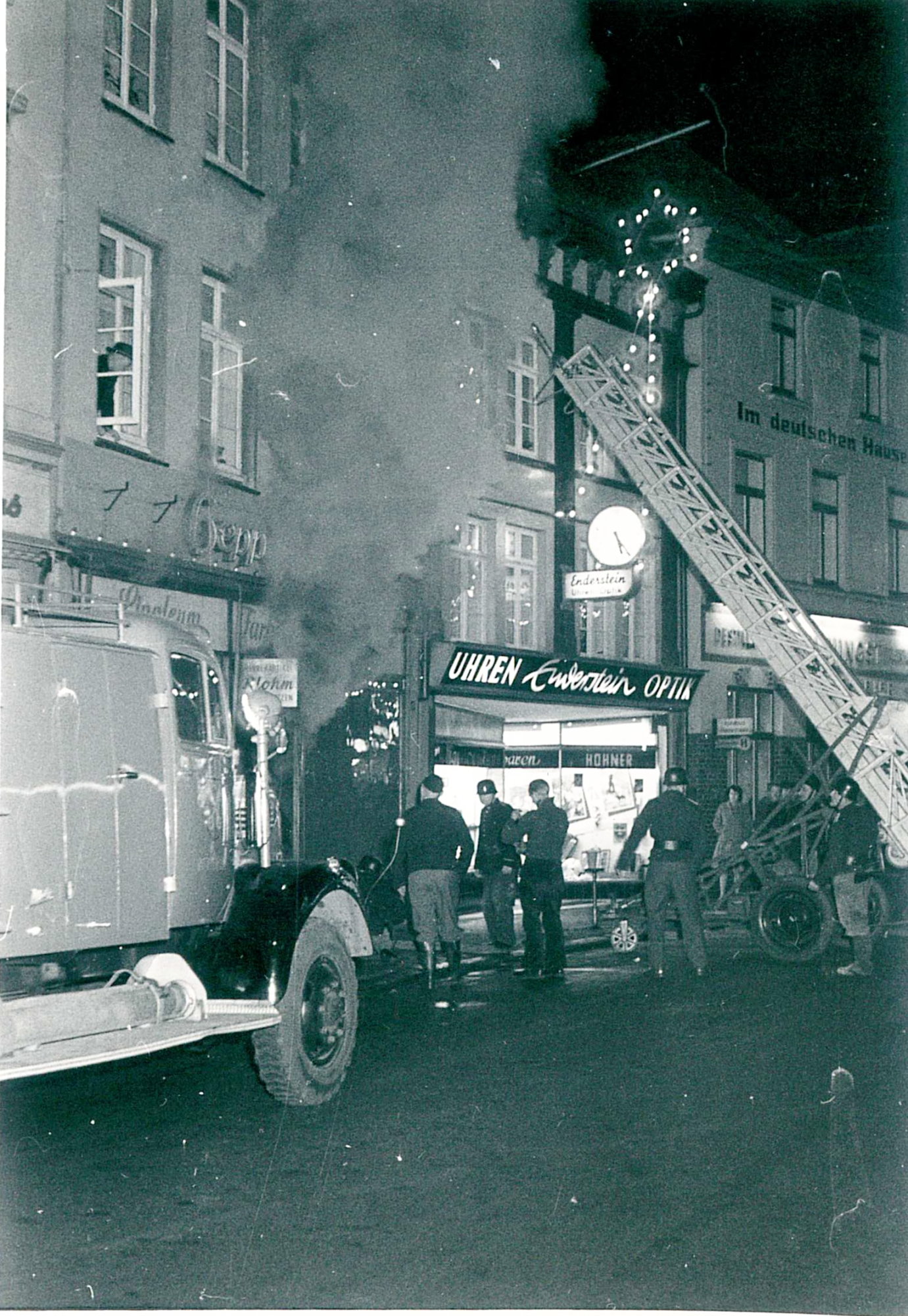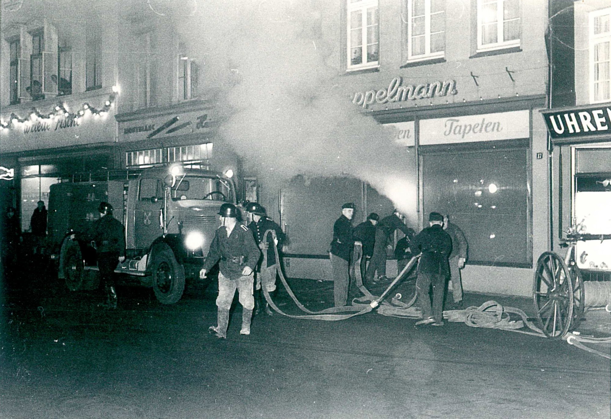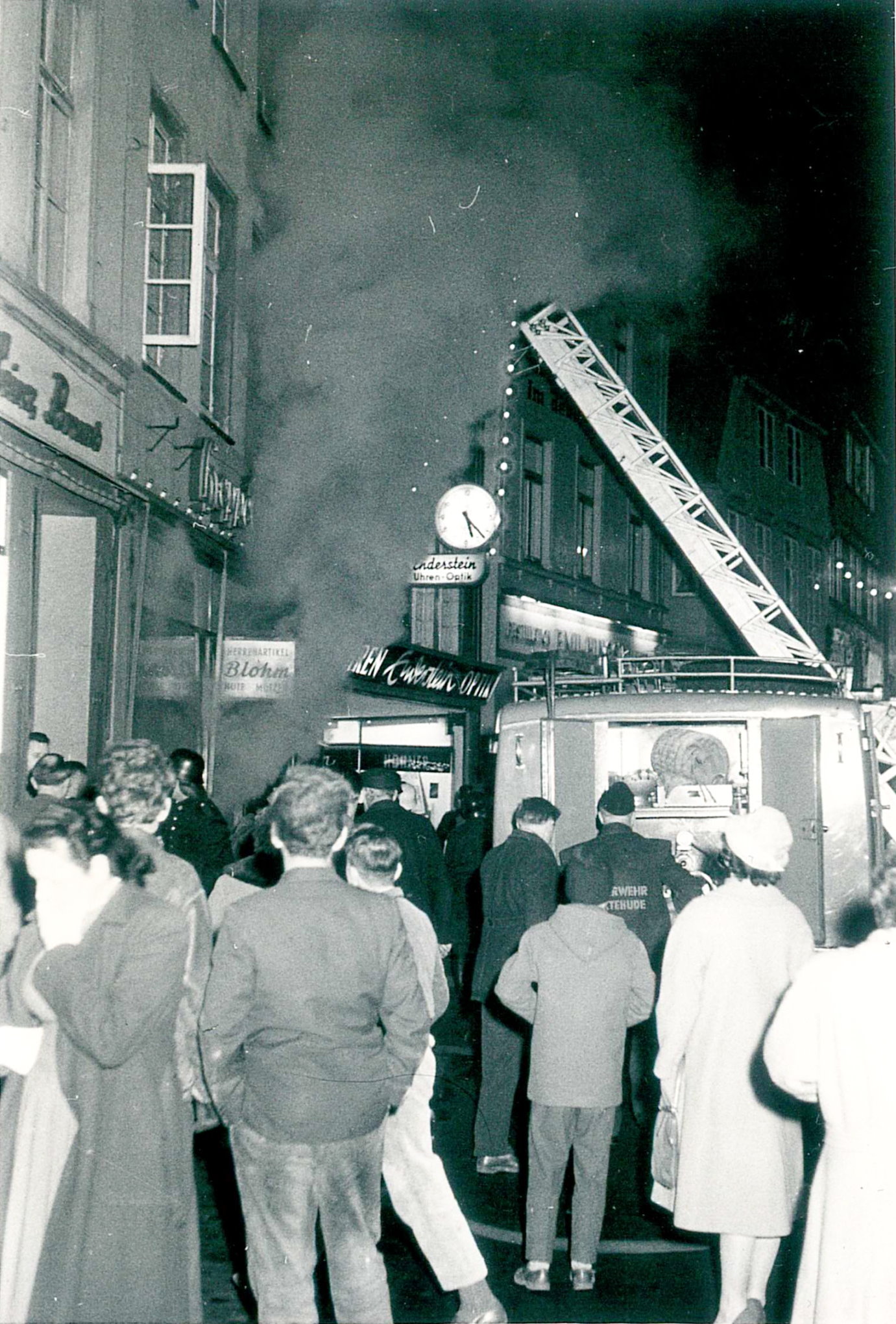 Glücklicherweise wurde das Feuer im Farbengeschäft am Samstag 12.12.1959 am Rathausplatz noch rechtzeitig entdeckt, es hätte weitaus schlimmer enden können. Gegen 17 Uhr hatte ein Bewohner des Wohn- und Geschäftshauses den Brand im Ladengeschäft bemerkt und den Notruf gewählt. Der eilig herbeieilende Ladenbesitzer hatte noch vorm Eintreffen der alarmierten Feuerwehrkräfte der Buxtehuder Feuerwehr mit einem Handfeuerlöscher versucht die Flammen zu ersticken.