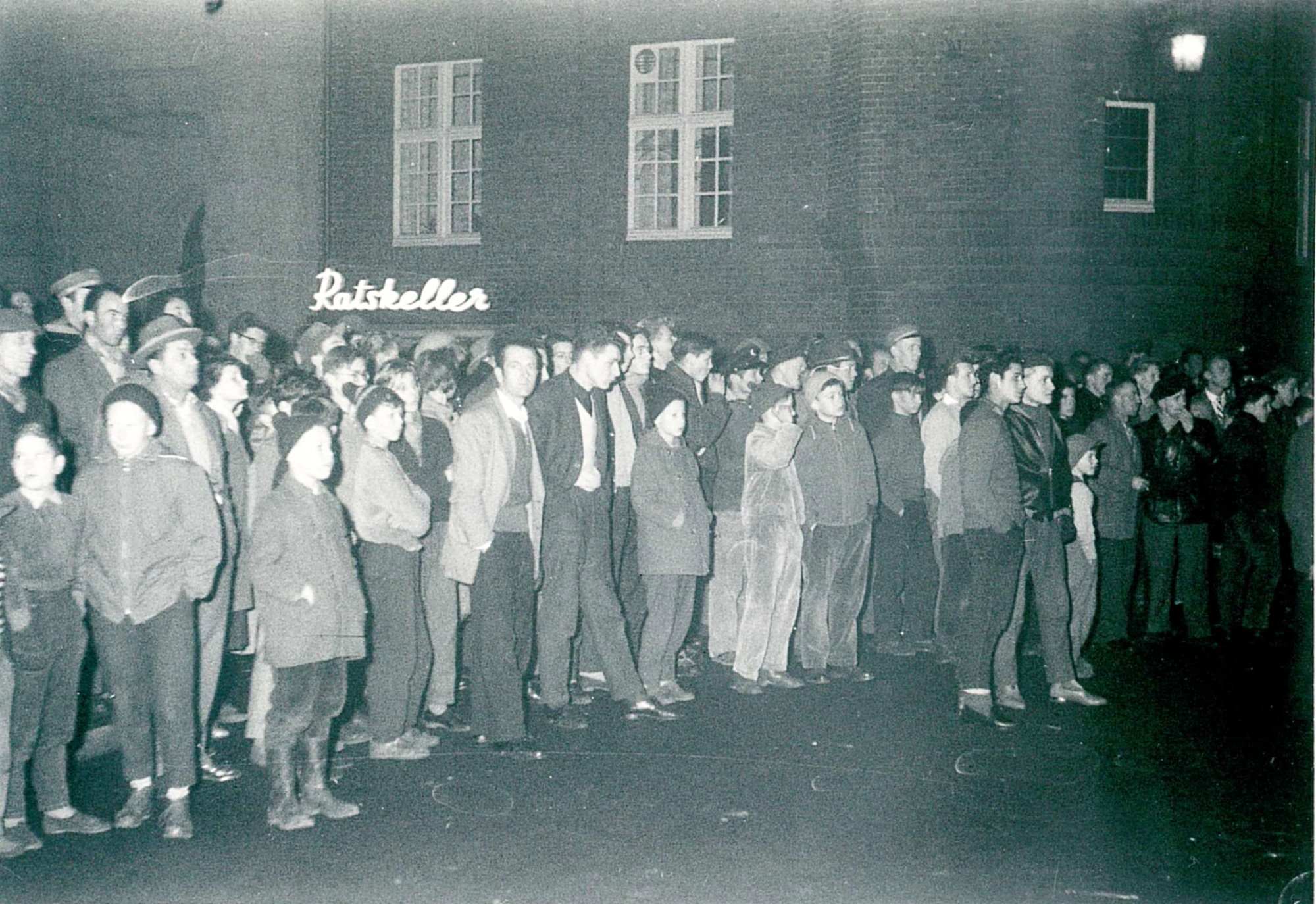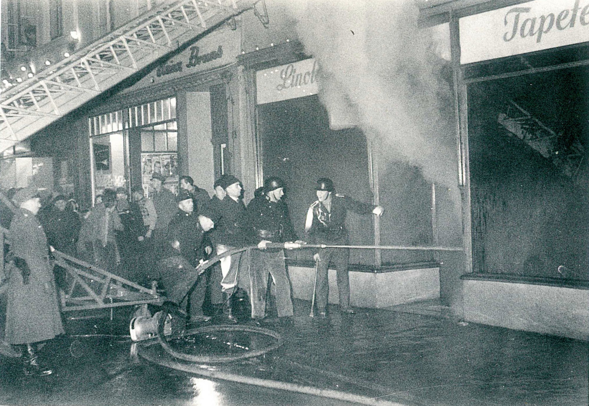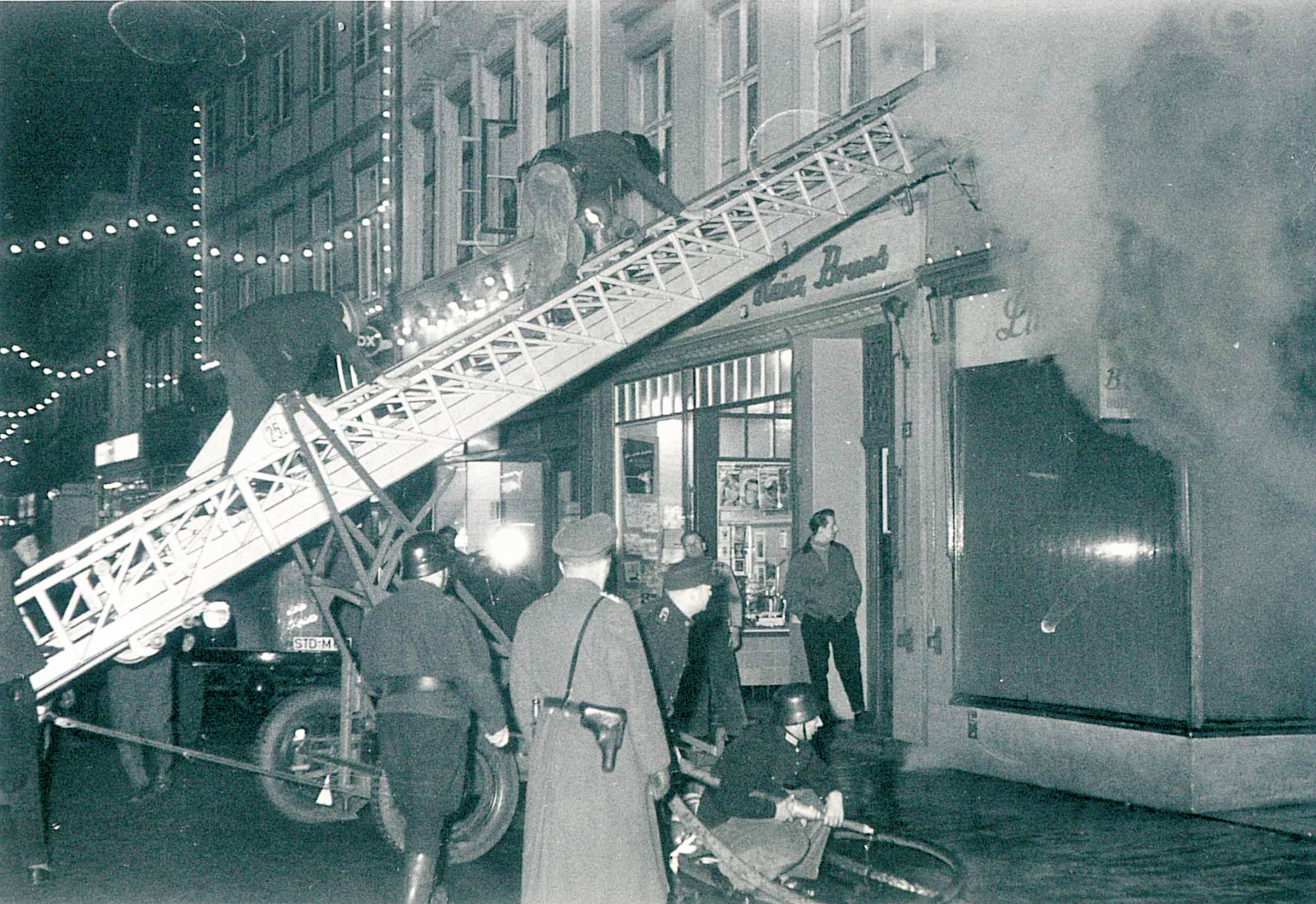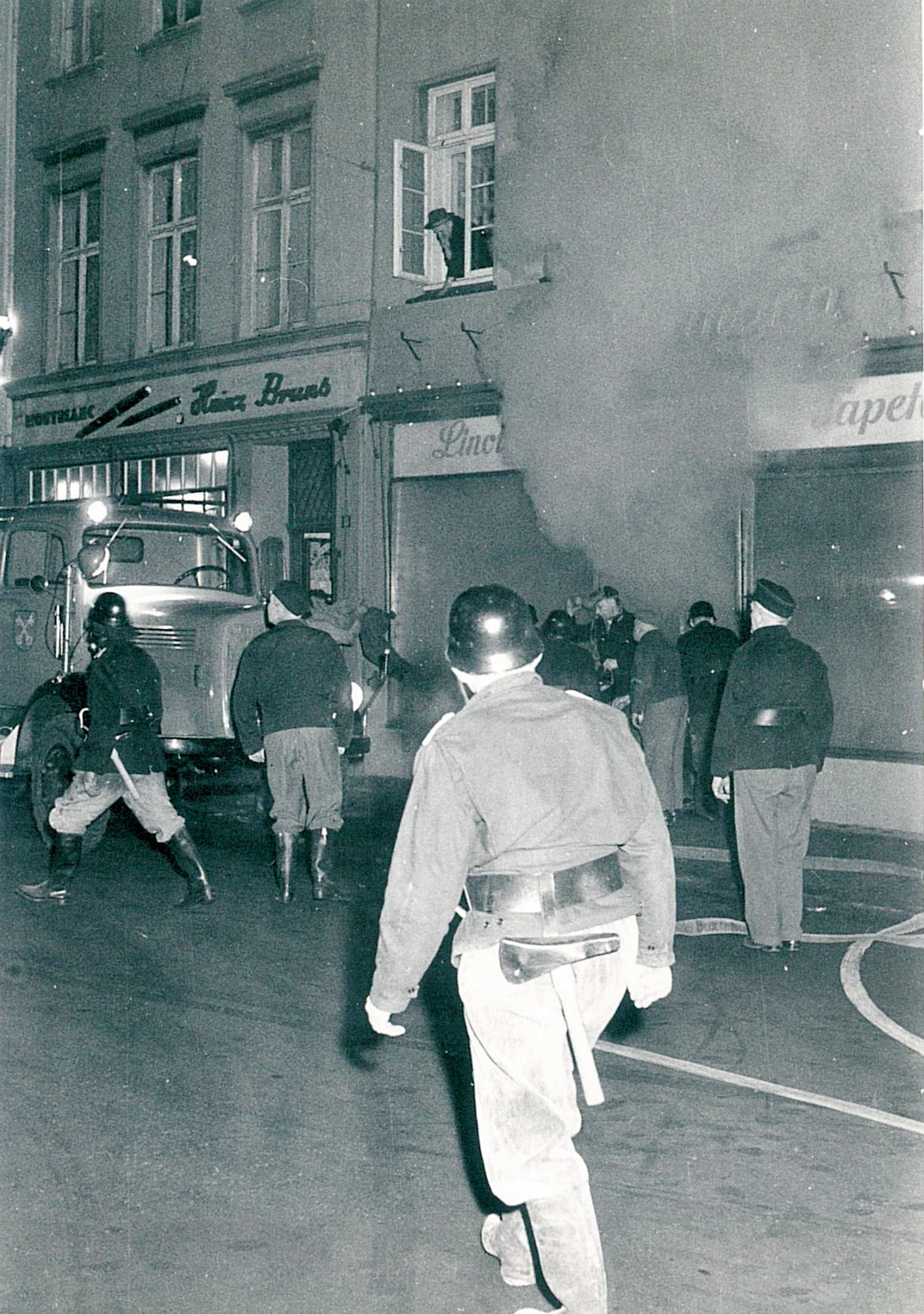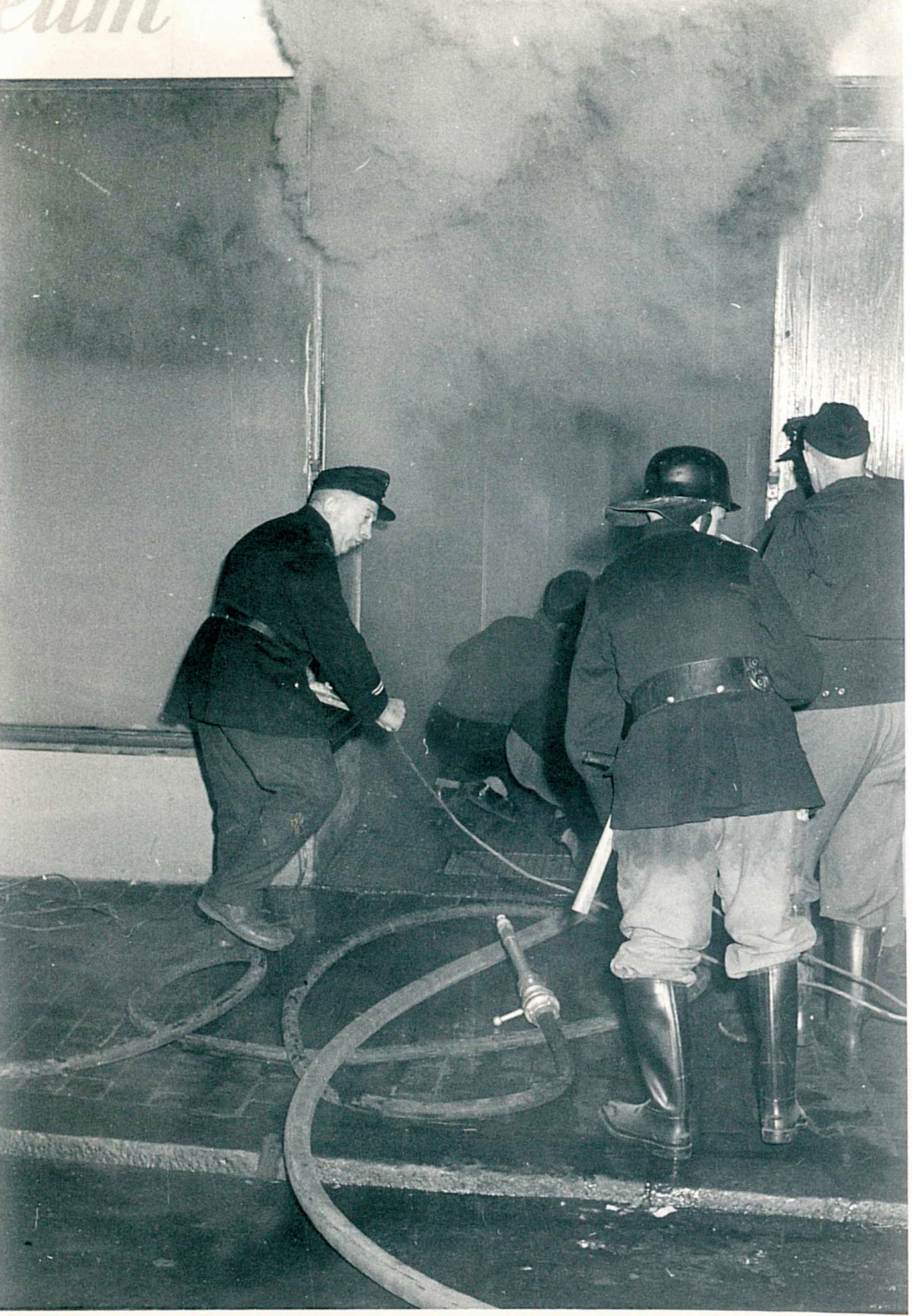 In wenigen Minuten war der Marktplatz schwarz von Menschen, die mit Spannung die Arbeit der Feuerwehr beobachteten. Während ein Rohr vor dem Ladeneingang in Stellung gebracht wurde und die Wehrmänner durch Zertrümmern der Ladenscheiben versuchten, dem noch unbekannten Brandherd näherzukommen, wurden aus dem ersten Stockwerk, aus der Werkstatt des Schneidermeisters Antonowitsch, Kleiderbündel und Inventar aus dem Fenster auf die Straße geworfen und dort in Sicherheit gebracht. Die große Magirusleiter wurde ausgefahren und an das Haus gestellte Feuerwehrmänner stiegen in das erste Stockwerk und retteten die Bewohner des ersten Geschosses, die nicht mehr durch das Treppenhaus ins Freie gelangen konnten. Aus dem raucherfüllten Ladeninnern, aus dem dicker Ölrauch drang, ertönten nacheinander mehrere Detonationen, die auf geplatzte Lack- und Farbendosen zurückzuführe waren. Im Schutze von Gasmasken versuchten Feuerwehrmänner ins Ladeninnere vorzudringen und zunächst die Wände abzukühlen und ein Ausbreiten des im hinteren Gebäudeteil brennenden Feuers zu verhindern.