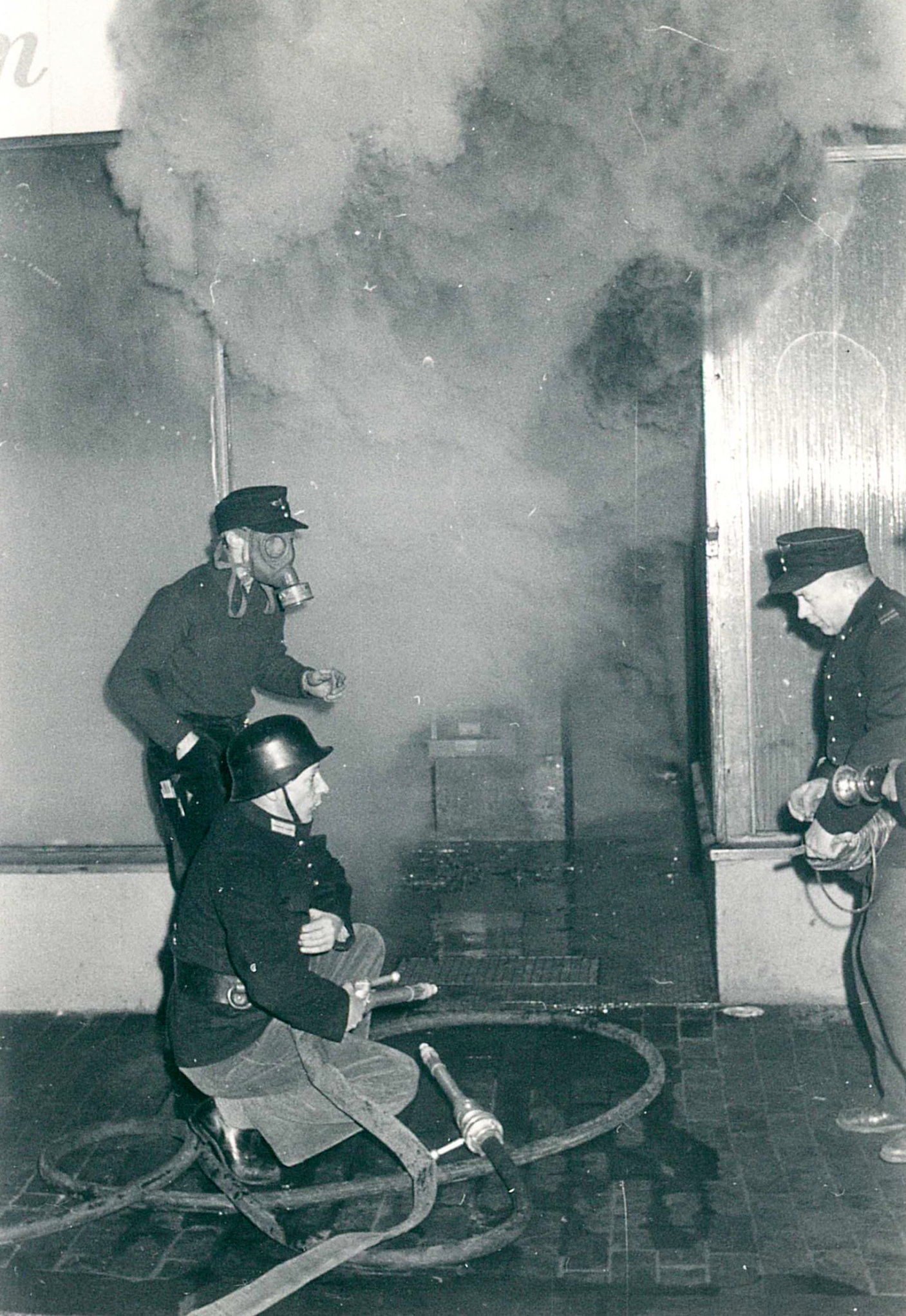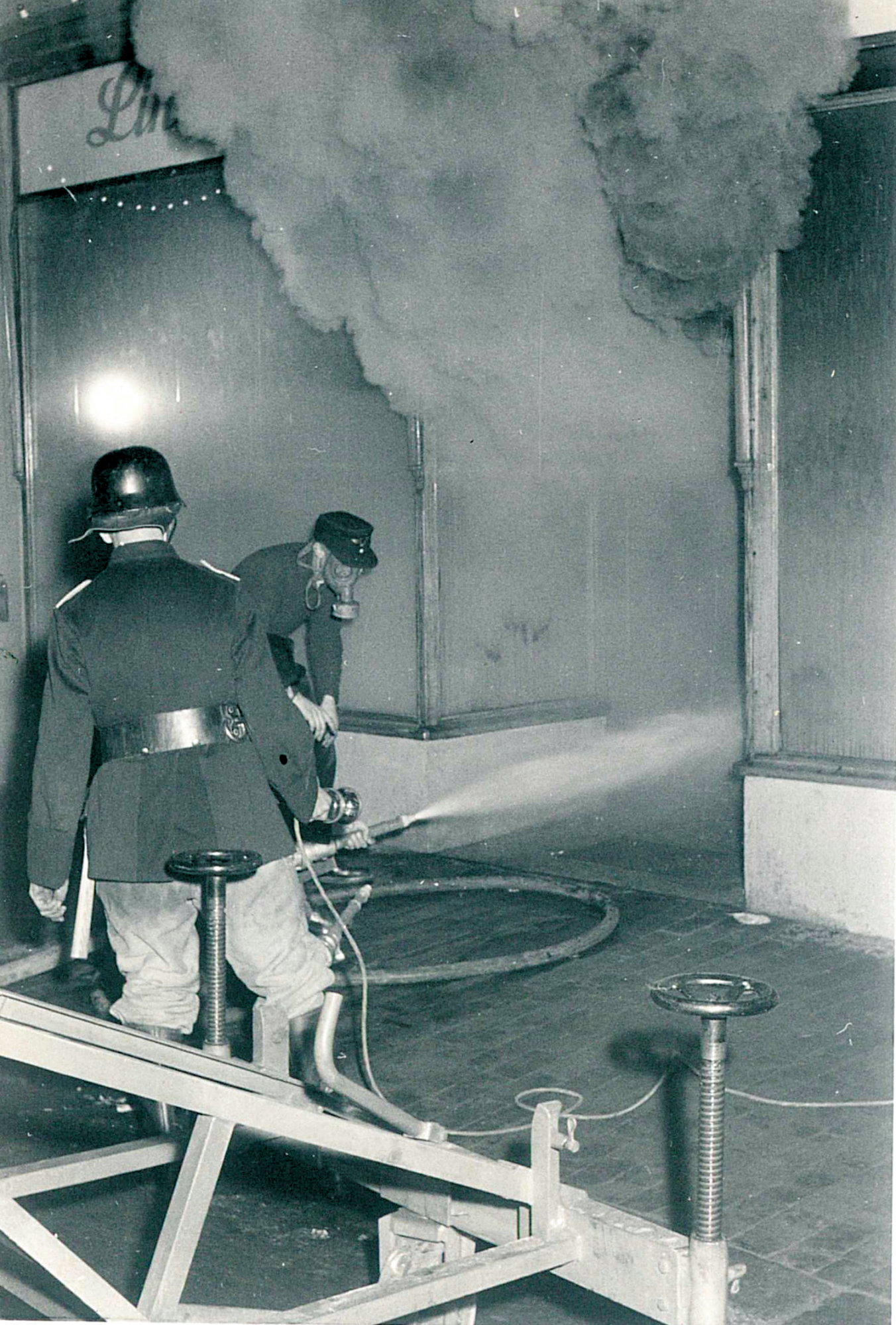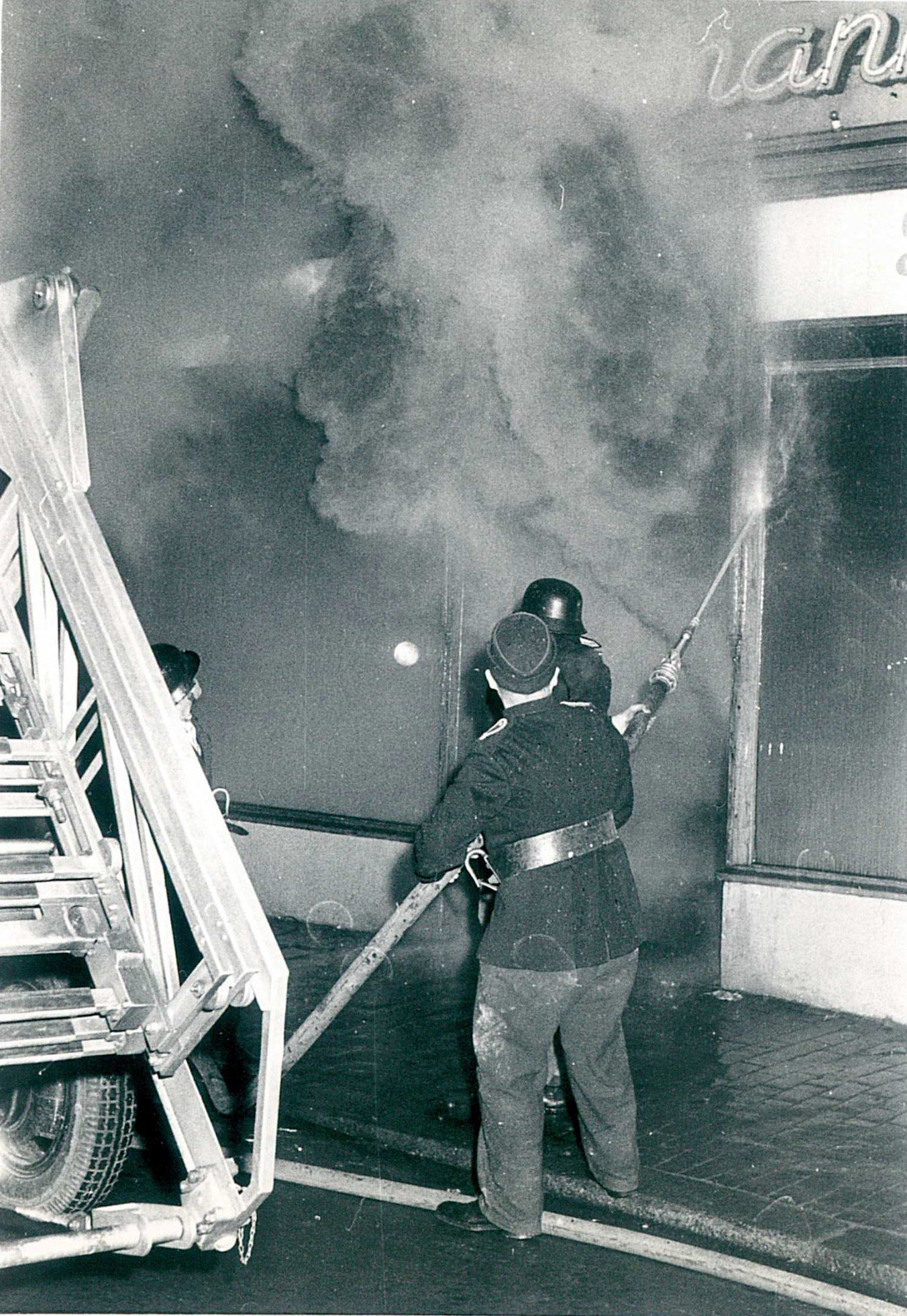 Aus dem Farbengeschäft waren derweil kleinere Detonationen zu hören, die auf geplatzte Lack- und Farbdosen zurückzuführen waren. Noch wussten die Feuerwehrmänner nicht, was sie im Inneren erwarten würde. Mit Gasmasken ausgerüstet tasteten sie sich vorsichtig hinein. Sie kühlten zunächst die Wände, um ein weiteres Ausbreiten der Flammen zu vermeiden.