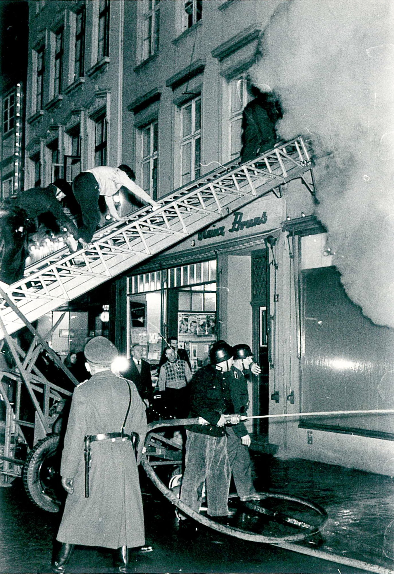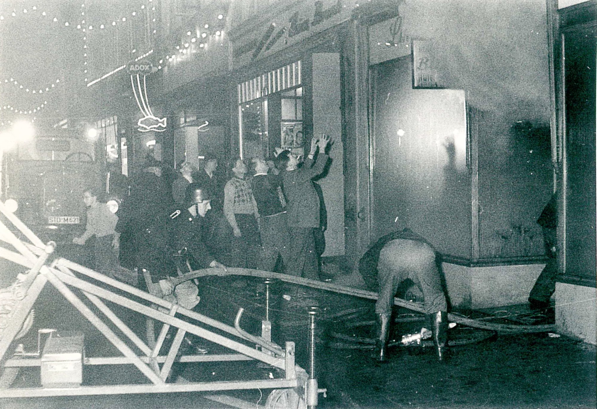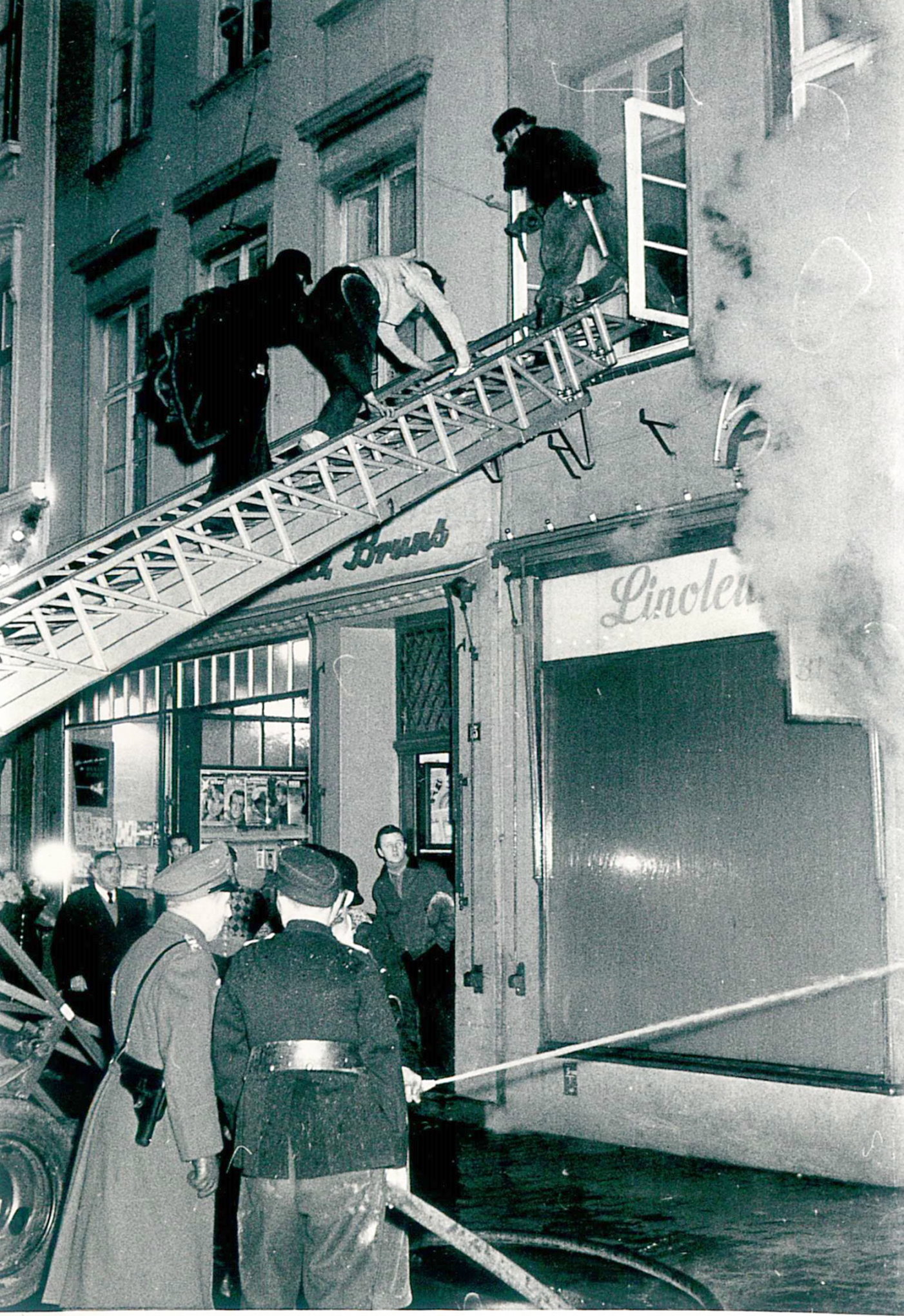 Auch von der Viverstraße aus versuchte die Feuerwehr, an den Brandherd heranzukommen. Es stellte sich bald heraus, daß das Feuer in dem Farbenmischraum entstanden war, der vom Laden durch eine Sperrholzwand getrennt war. Von der Hofseite drangen Feuerwehrmänner über ein Hausdach und eine Feuerleiter in das zweite Geschoß des Hauses vor, um dort noch befindliche Bewohner, die wegen des Rauches nicht herunterkommen konnten und in Gefahr waren zu ersticken, zu bergen, während schon die Flammen durch die Geschoßdecke schlugen. Feuerwehrmann Alfred Lipsky holte über die Leiter die 93jährige Einwohnerin Frau Libutzki aus der Wohnung herunter. Die Gerettete und auch ihr Retter mußten mit leichter Rauchvergiftung ins Krankenhaus eingeliefert werden.