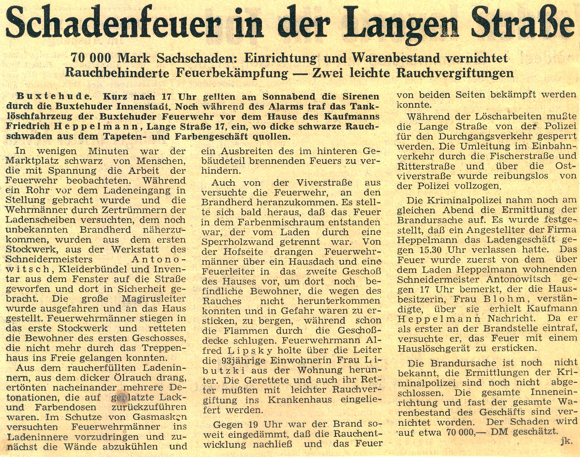 Buxtehude. Kurz nach 17 Uhr gellten am Sonnabend die Sirenen durch die Buxtehuder Innenstadt. Noch während des Alarms traf das Tanklöschfahrzeug der Buxtehuder Feuerwehr vor dem Hause des Kaufmanns Friedrich HeppeImann , Lange Straße 17, ein, wo dicke schwarze Rauchschwaden aus dem Tapeten- und Farbengeschäft quollen.