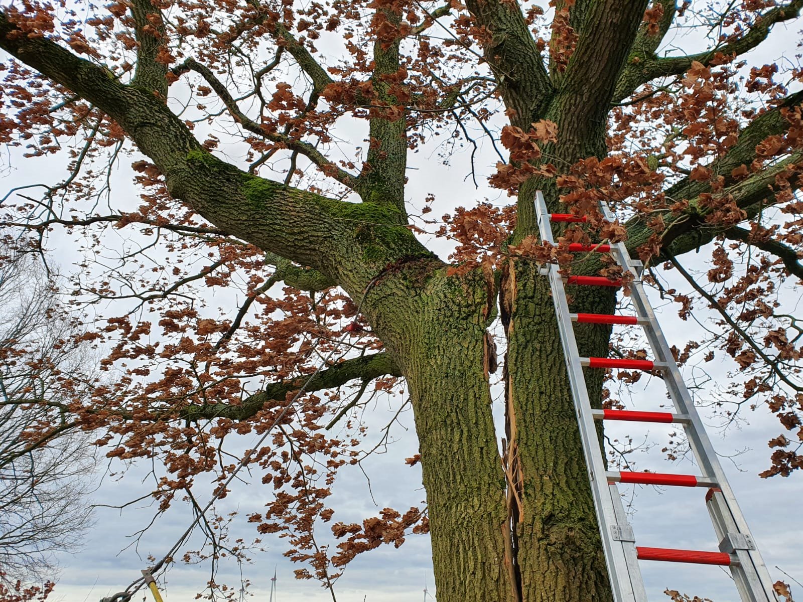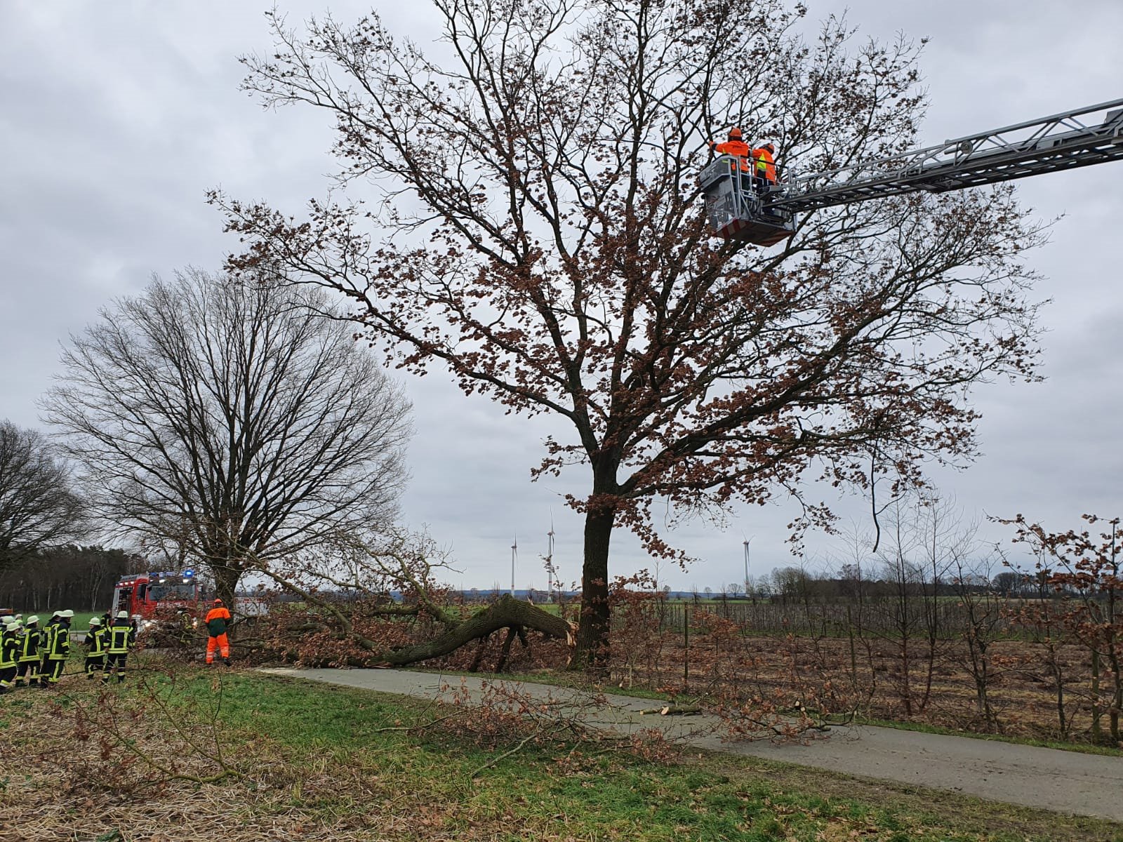 Die alarmierten Einsatzkräfte aus Daensen und vom Zug I der Ortsfeuerwehr Buxtehude erkundeten zunächst die Lage und entschieden sich dann mit dem Rüstwagen die eine Seite des gespaltenen Baumes zum Boden zu ziehen. Anschließend gingen die Einsatzkräfte von der Drehleiter aus vor und trugen die zweite Baumhälfte von oben her ab.