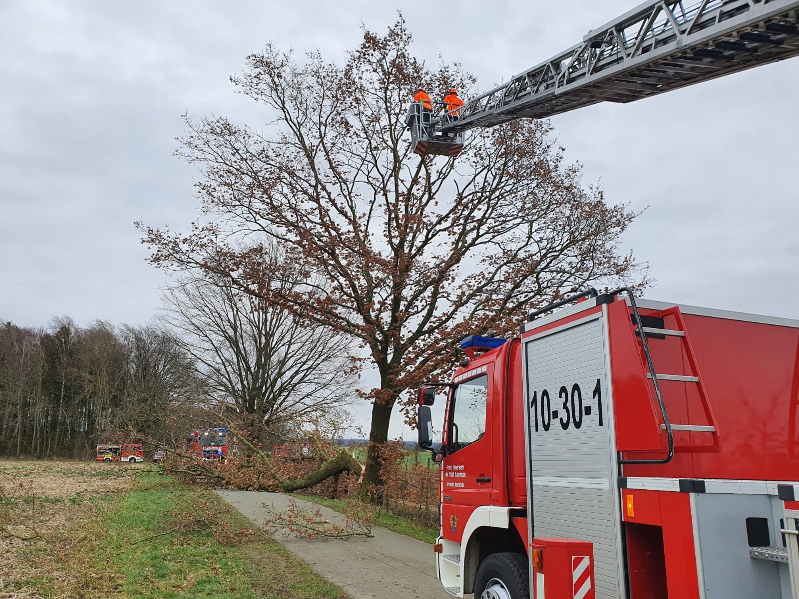 Nachdem der am Boden liegende Stamm und das Geäst von der Straße geräumt worden waren, konnten die Einsatzkräfte wieder abrücken.