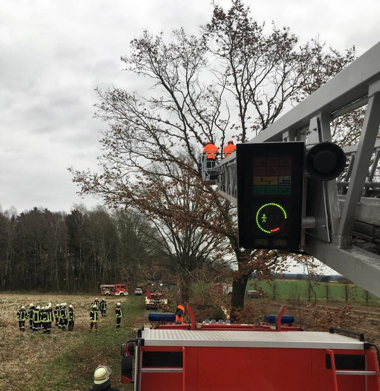 Ein etwa 25m hoher Baum drohte am Sonntagmittag in Pippensen umzufallen. Der etwa 80cm dicke Stamm des an der Straße "Auf dem Knüll" stehenden Baumes war gespalten.