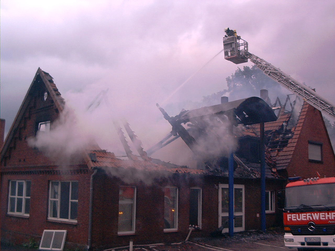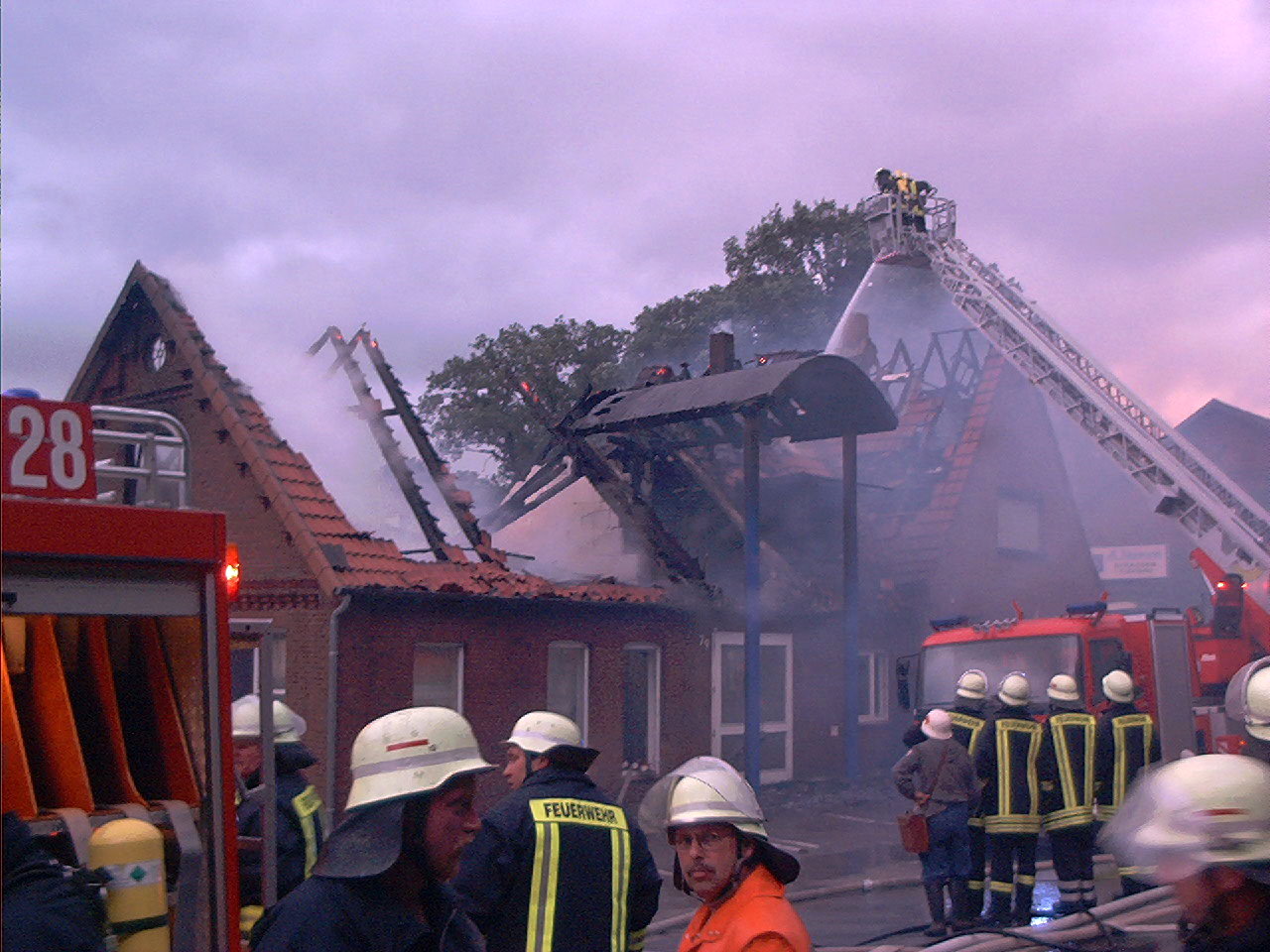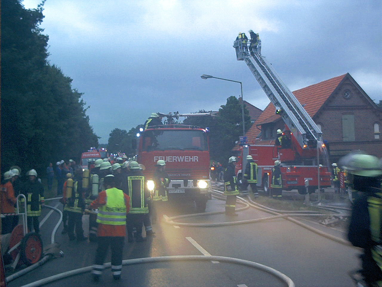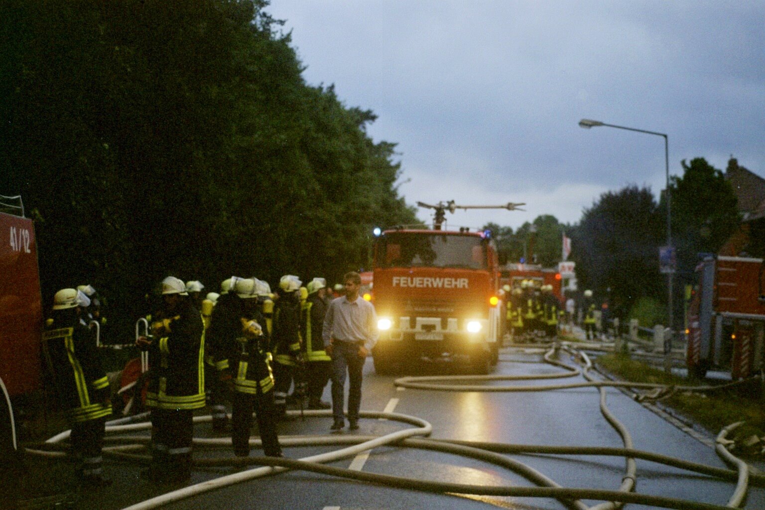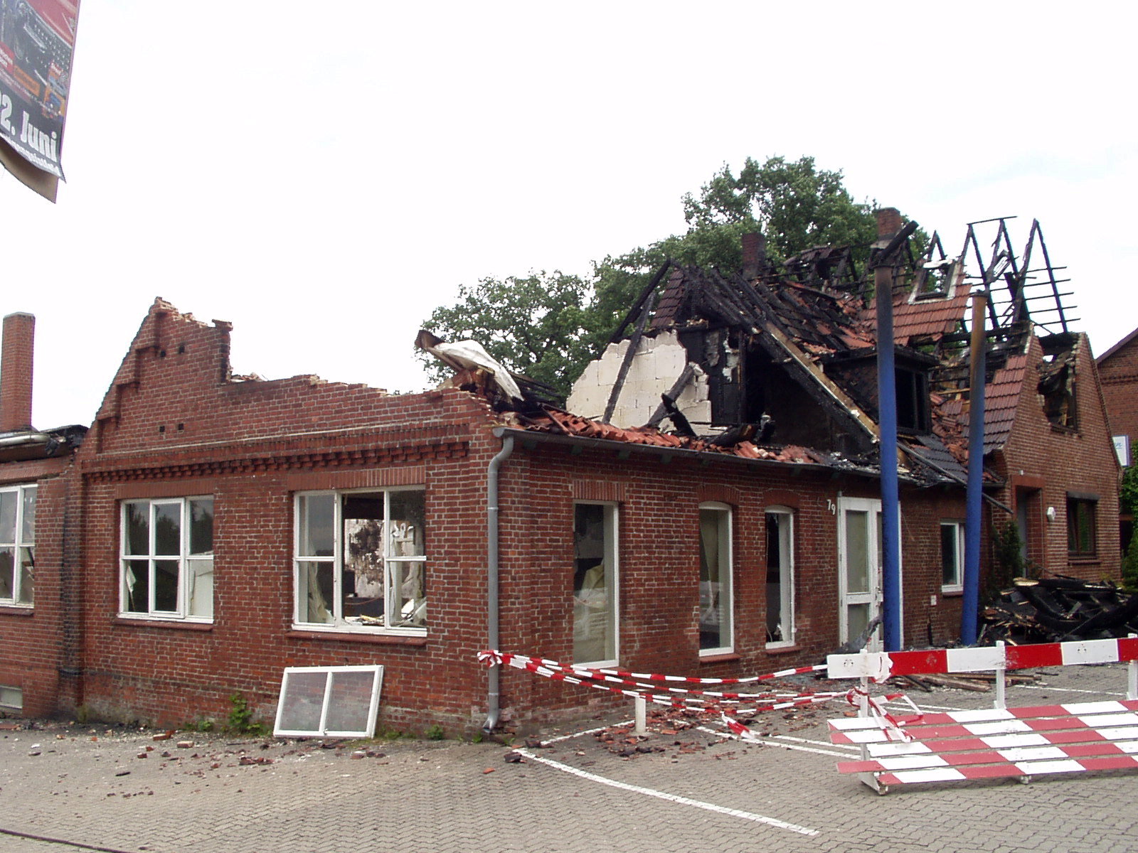 Es waren gespenstische Szenen, die sich den Einwohnern von Ovelgönne am Montagabend 23.06.2003 boten. Dichte Rauchschwaden zogen entlang der Bundesstraße 73 - eine ehemalige Tischlerei, samt Wohnräumen stand direkt an der vielbefahrenen Straße in Vollbrand. Die ausrückenden Einsatzkräfte konnten aufgrund der enormen Rauchentwicklung bereits aus Buxtehude "auf Sicht" anfahren. Alarmiert worden waren neben den örtlichen Kräften der Ortsfeuerwehr Ovelgönne / Ketzendorf auch die Züge I, II und III (Buxtehude, Daensen, Immenbeck, Ottensen), so dass letztendlich insgesamt etwa 100 Feuerwehrkräfte eingesetzt waren.