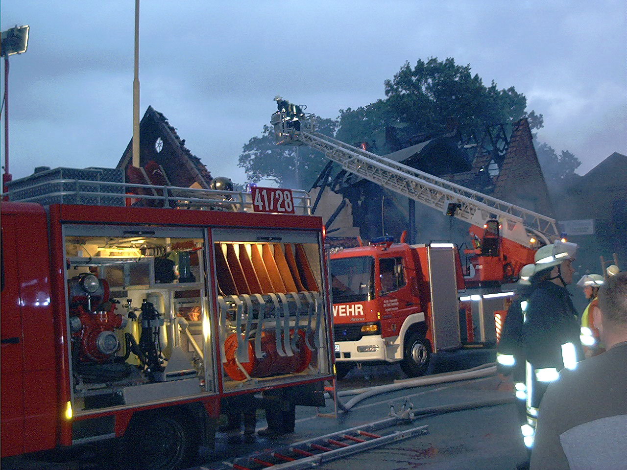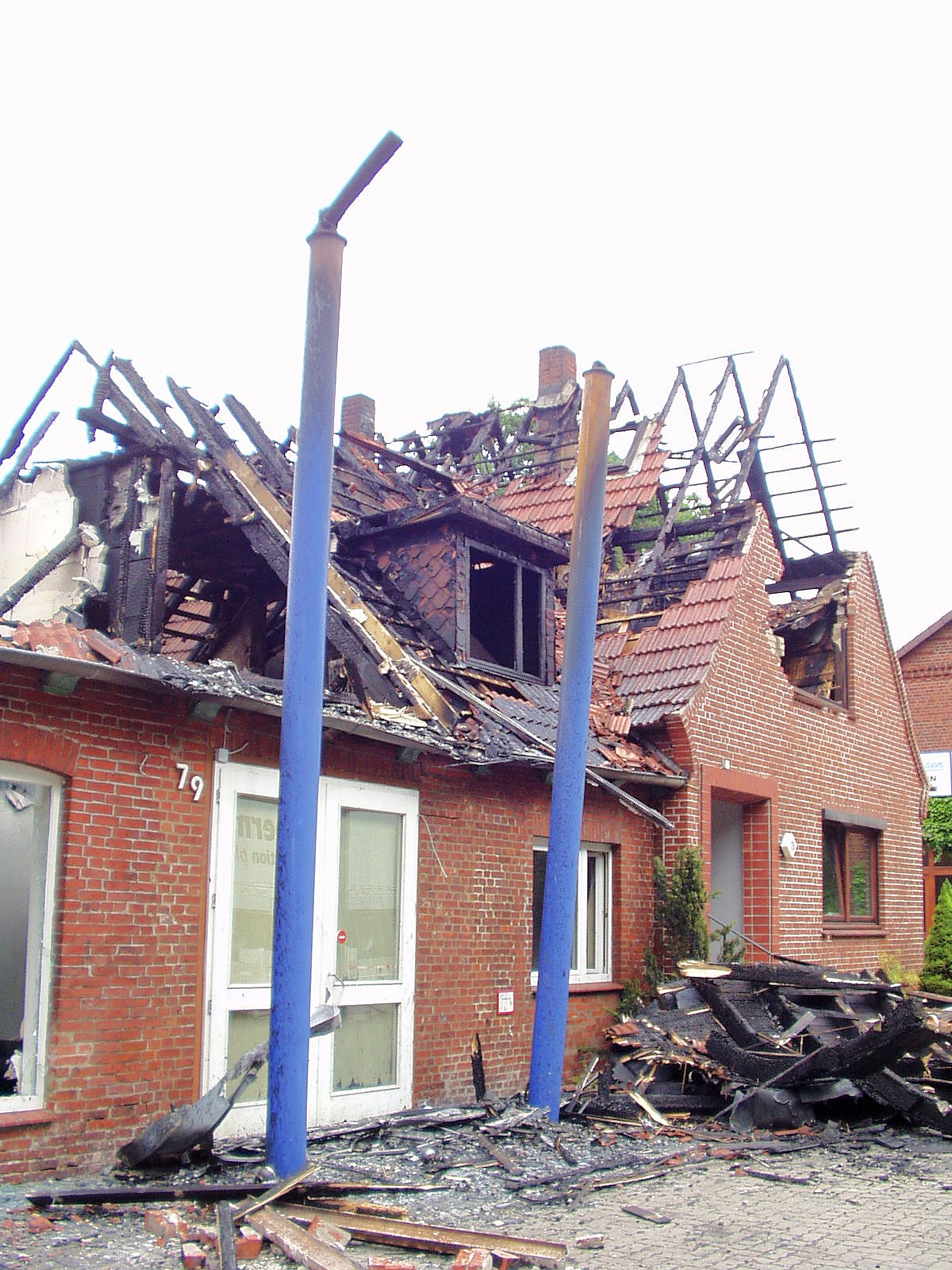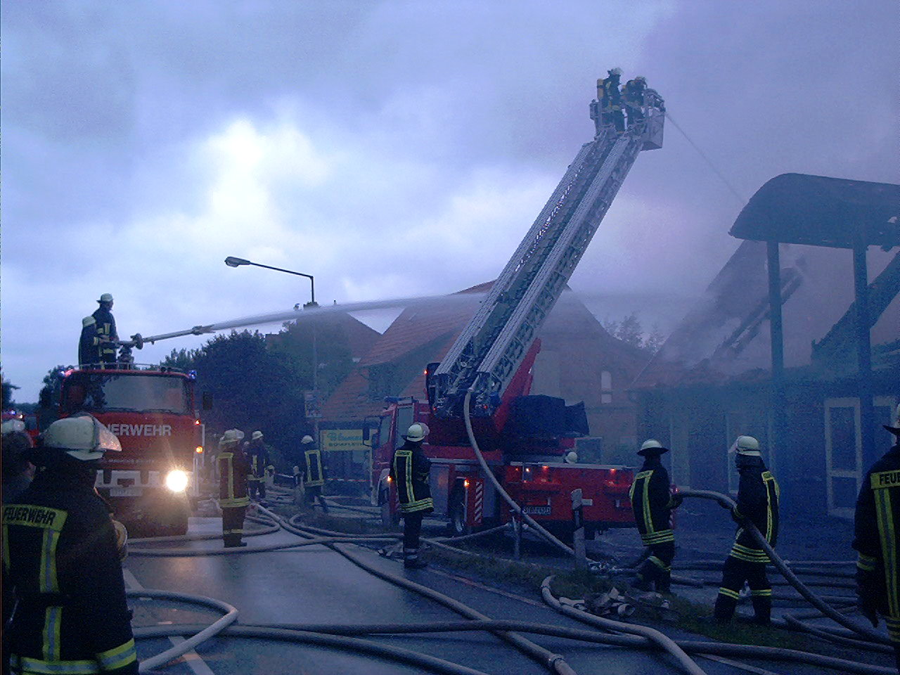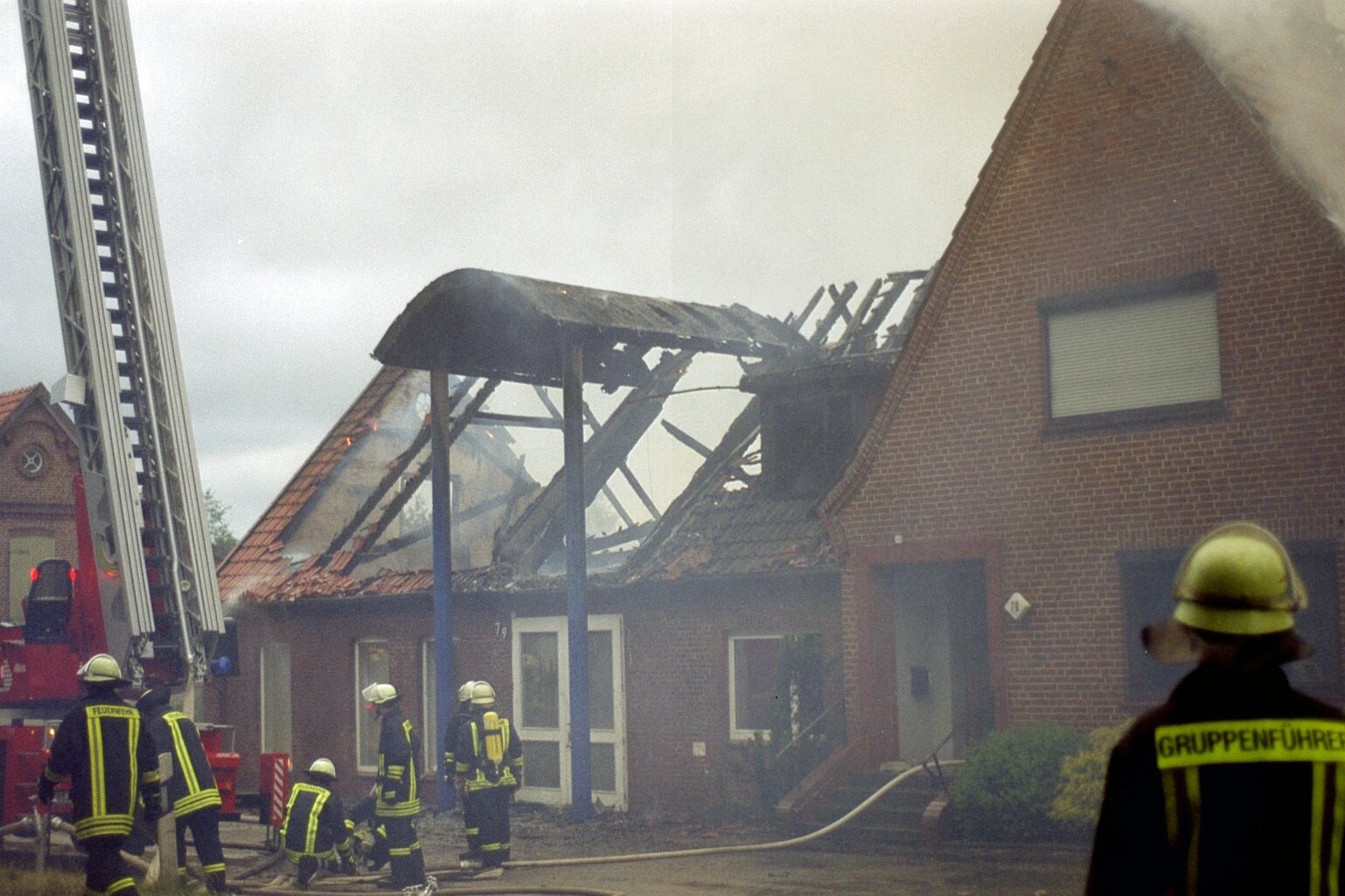 Es waren gespenstische Szenen, die sich den Einwohnern von Ovelgönne am Montagabend 23.06.2003 boten. Dichte Rauchschwaden zogen entlang der Bundesstraße 73 - eine ehemalige Tischlerei, samt Wohnräumen stand direkt an der vielbefahrenen Straße in Vollbrand. Die ausrückenden Einsatzkräfte konnten aufgrund der enormen Rauchentwicklung bereits aus Buxtehude "auf Sicht" anfahren. Alarmiert worden waren neben den örtlichen Kräften der Ortsfeuerwehr Ovelgönne / Ketzendorf auch die Züge I, II und III (Buxtehude, Daensen, Immenbeck, Ottensen), so dass letztendlich insgesamt etwa 100 Feuerwehrkräfte eingesetzt waren.