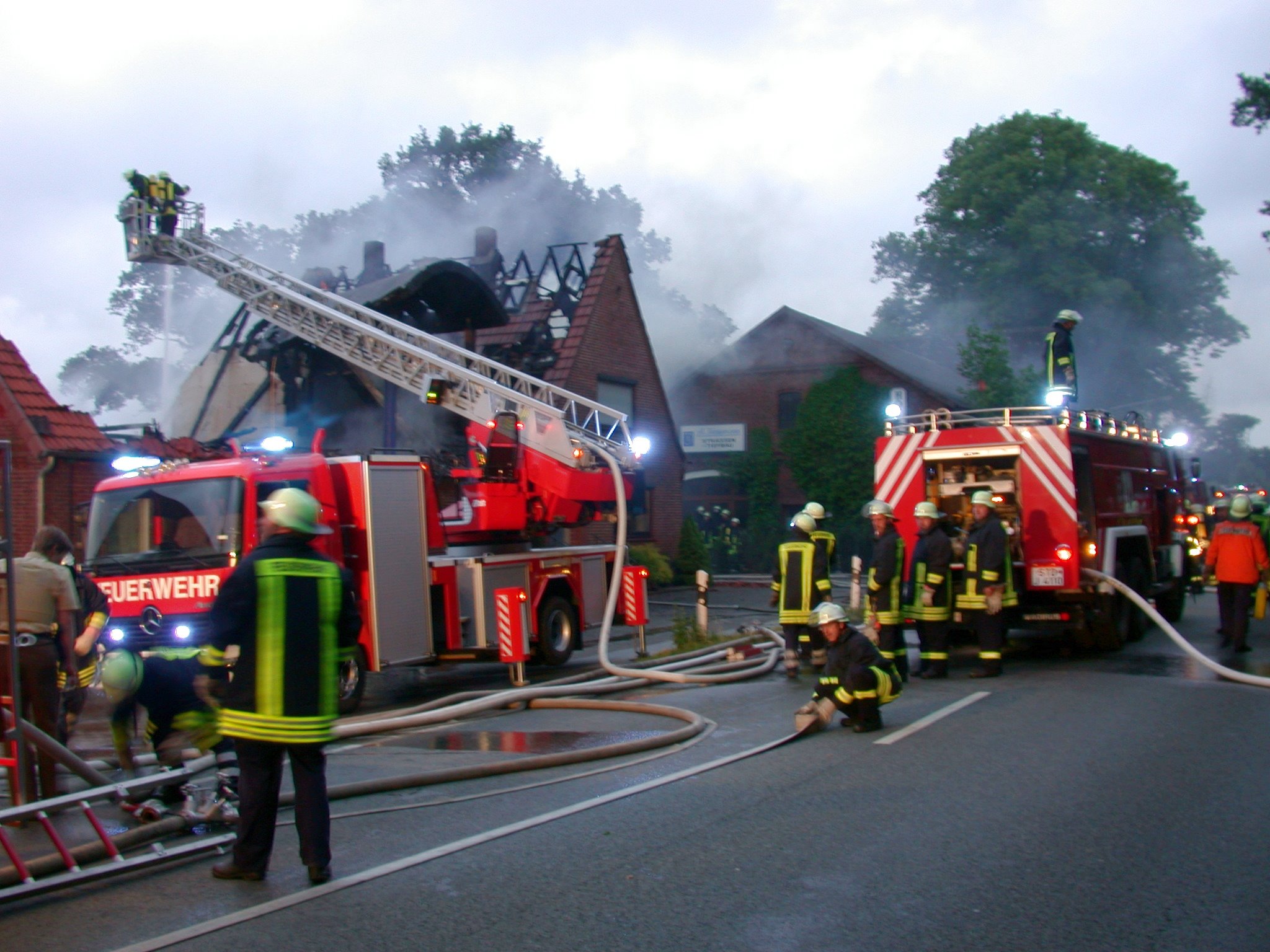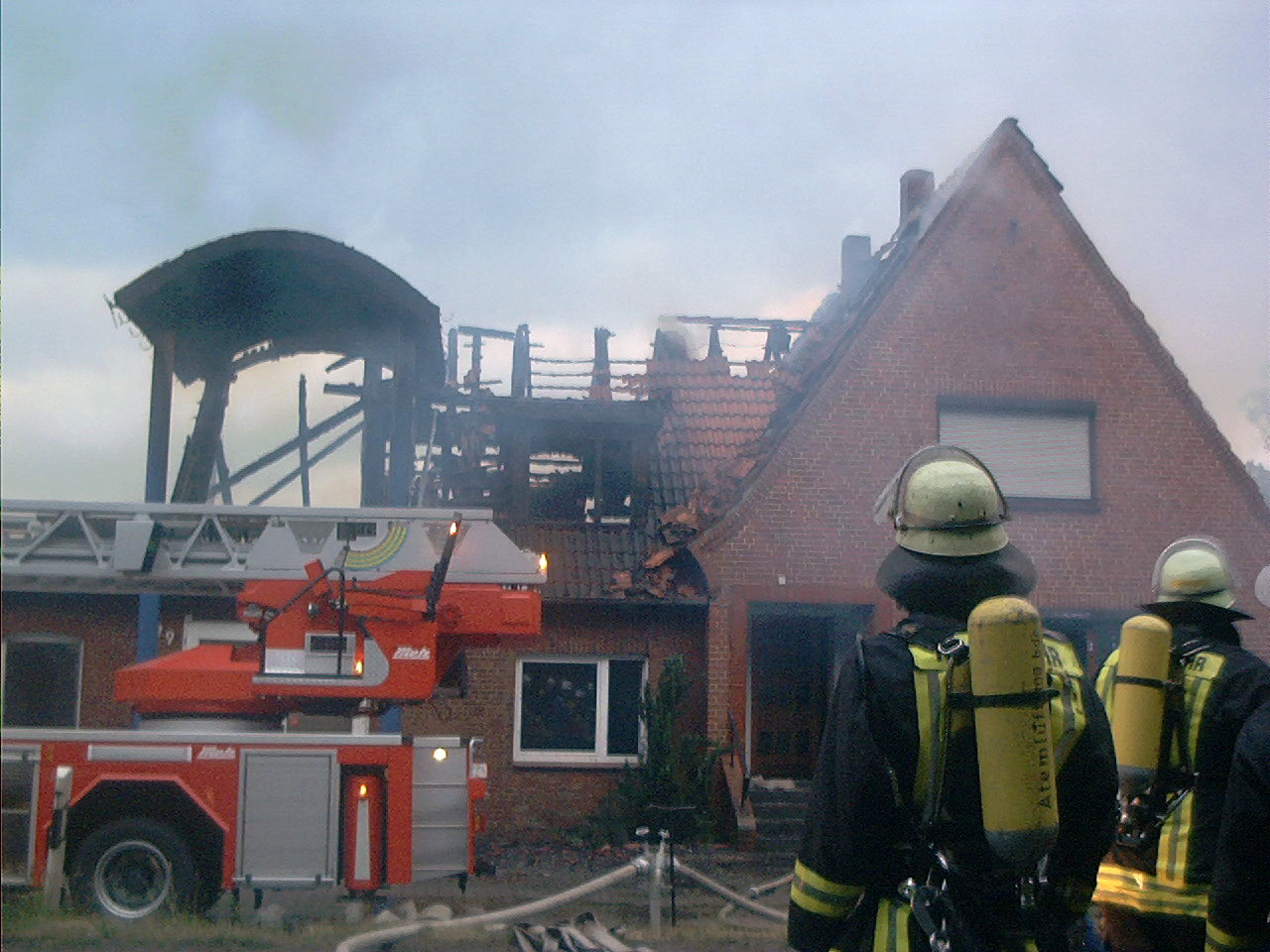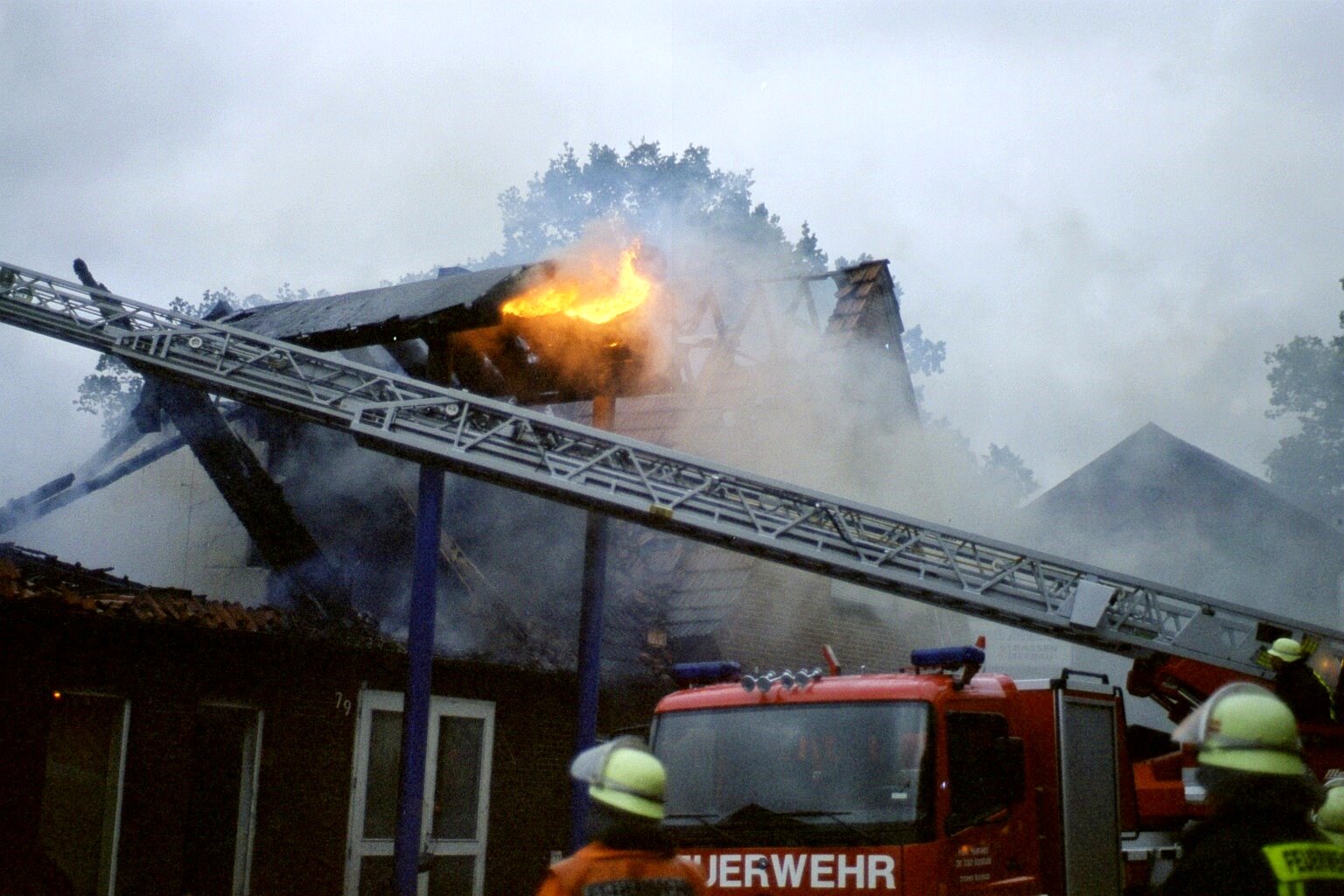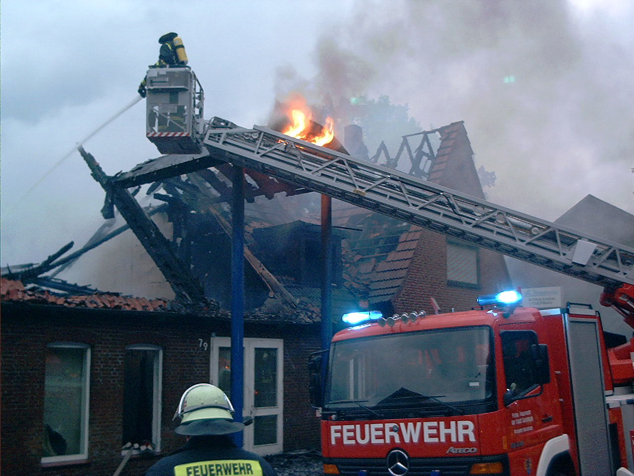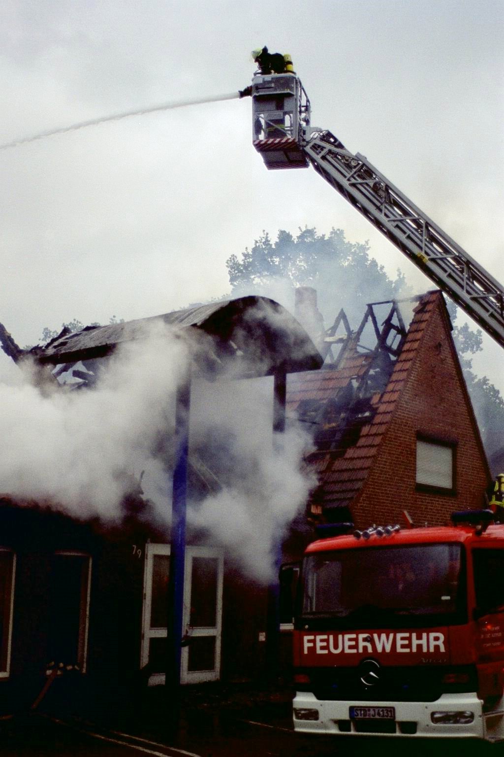 Es waren gespenstische Szenen, die sich den Einwohnern von Ovelgönne am Montagabend 23.06.2003 boten. Dichte Rauchschwaden zogen entlang der Bundesstraße 73 - eine ehemalige Tischlerei, samt Wohnräumen stand direkt an der vielbefahrenen Straße in Vollbrand. Die ausrückenden Einsatzkräfte konnten aufgrund der enormen Rauchentwicklung bereits aus Buxtehude "auf Sicht" anfahren. Alarmiert worden waren neben den örtlichen Kräften der Ortsfeuerwehr Ovelgönne / Ketzendorf auch die Züge I, II und III (Buxtehude, Daensen, Immenbeck, Ottensen), so dass letztendlich insgesamt etwa 100 Feuerwehrkräfte eingesetzt waren.
