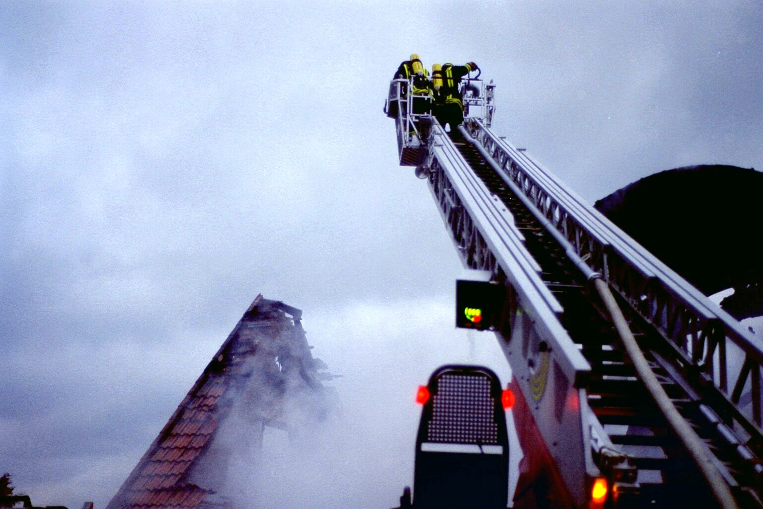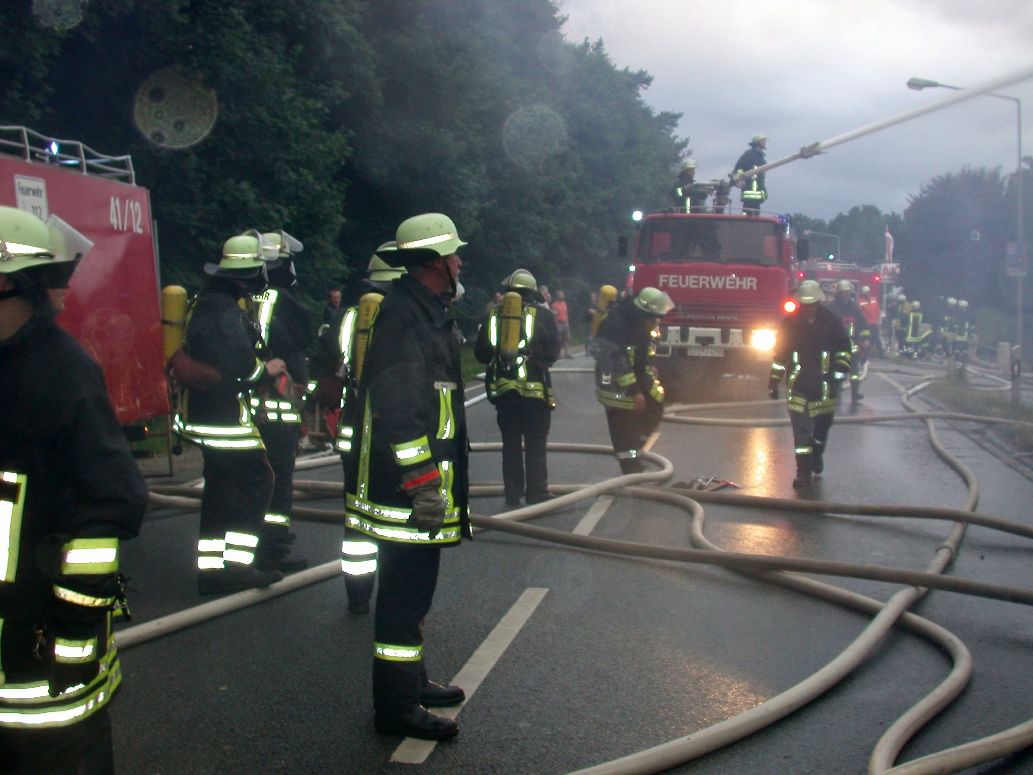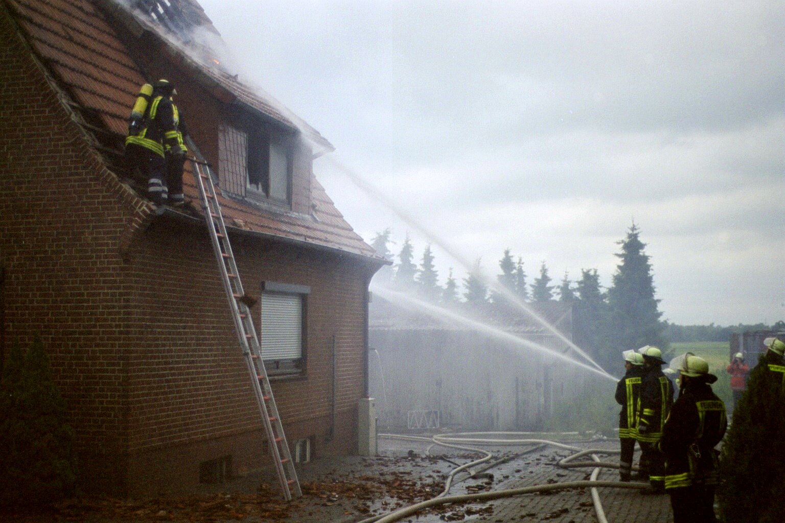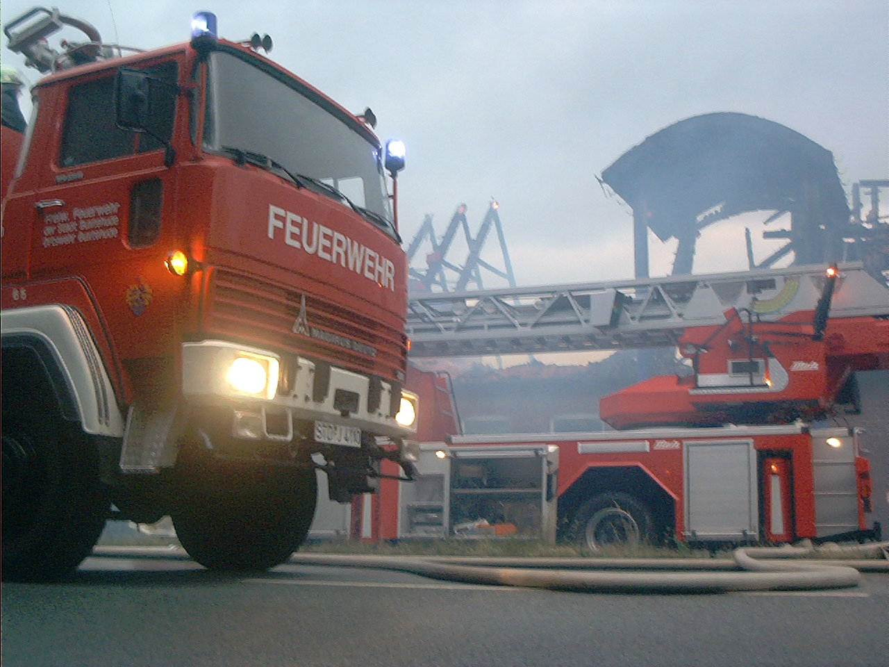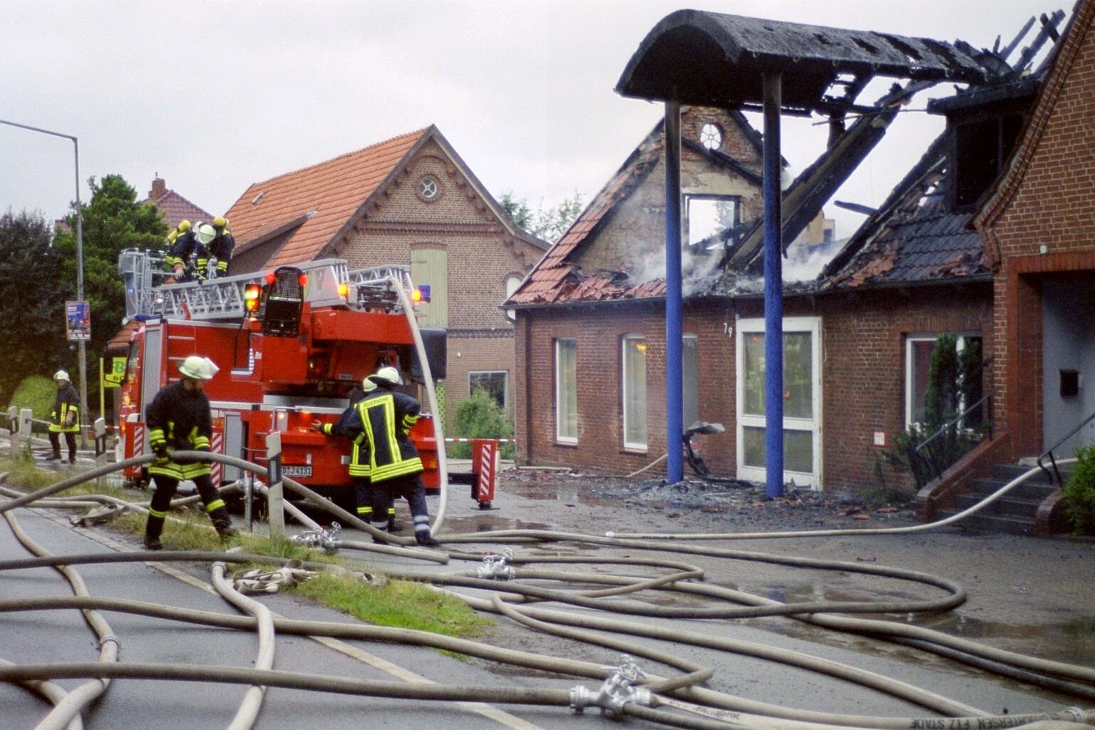 Es waren gespenstische Szenen, die sich den Einwohnern von Ovelgönne am Montagabend 23.06.2003 boten. Dichte Rauchschwaden zogen entlang der Bundesstraße 73 - eine ehemalige Tischlerei, samt Wohnräumen stand direkt an der vielbefahrenen Straße in Vollbrand. Die ausrückenden Einsatzkräfte konnten aufgrund der enormen Rauchentwicklung bereits aus Buxtehude "auf Sicht" anfahren. Alarmiert worden waren neben den örtlichen Kräften der Ortsfeuerwehr Ovelgönne / Ketzendorf auch die Züge I, II und III (Buxtehude, Daensen, Immenbeck, Ottensen), so dass letztendlich insgesamt etwa 100 Feuerwehrkräfte eingesetzt waren.