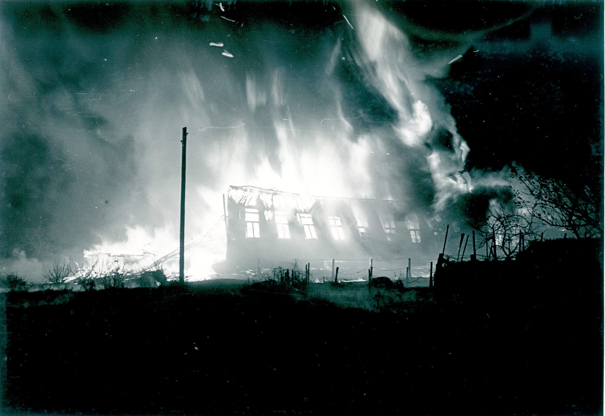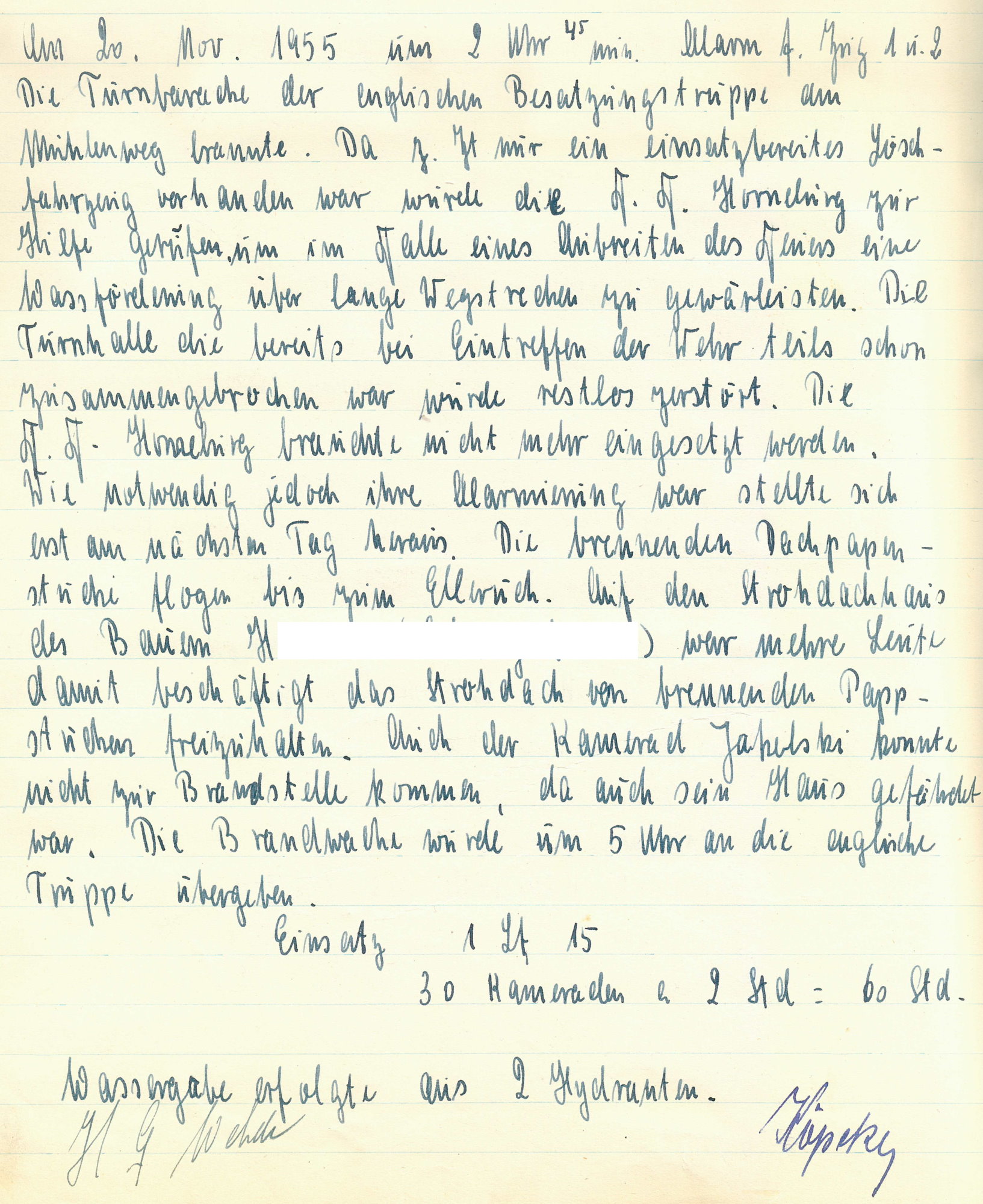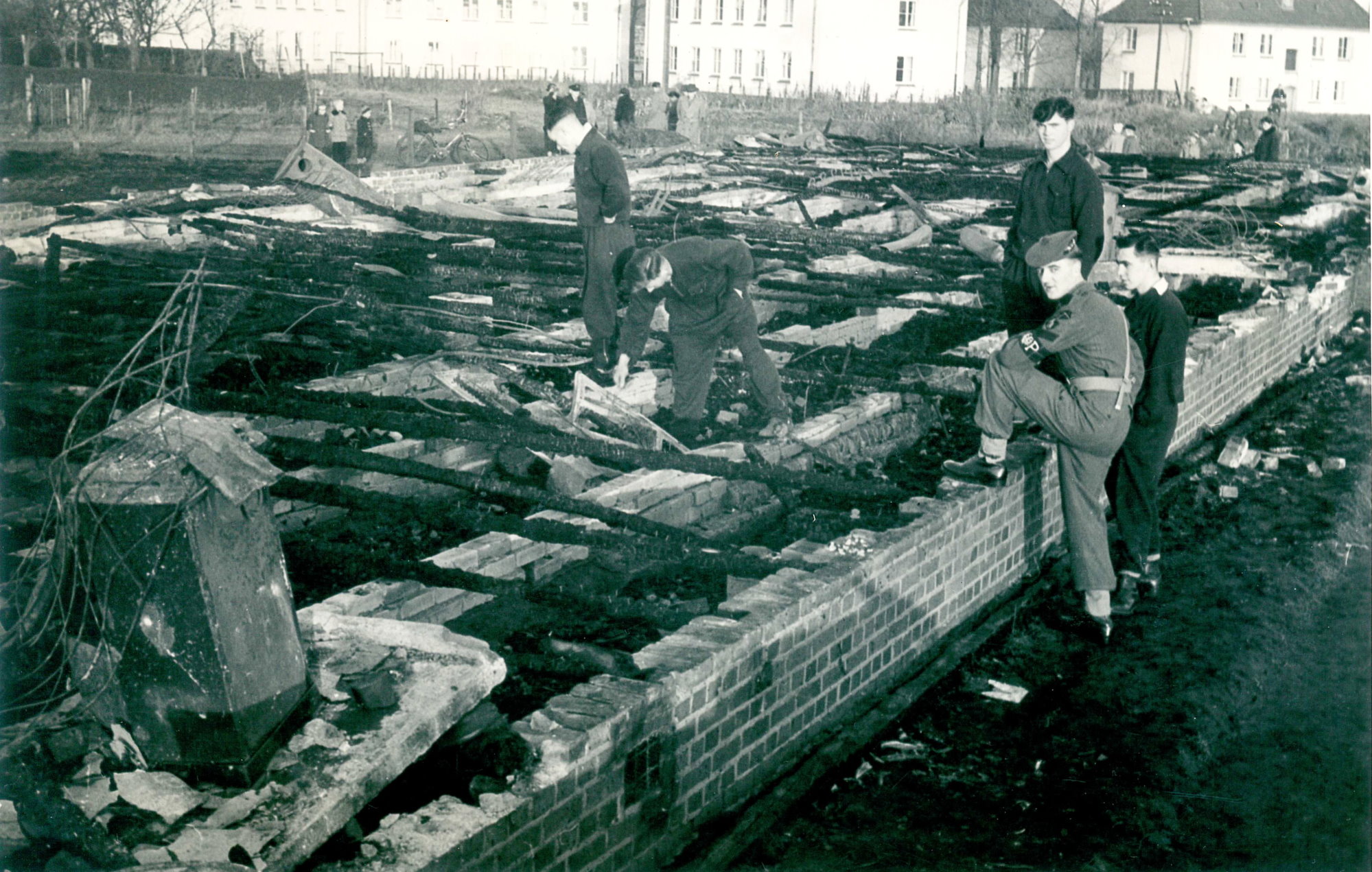 Ein Großfeuer zerstörte in der Nacht zum Sonntag 20.11.1955 die große Turnbaracke der britischen Streitkräfte am Mühlenweg. Als die um 02:45 Uhr alarmierten Einsatzkräfte beider Züge der Feuerwehr Buxtehude an der Einsatzstelle eintrafen stand die hölzerne Turnhalle bereits in Vollbrand. Die Flammen waren einige Meter hoch. Teile der Holzkonstruktion hatten dem bereits zu dem Zeitpunkt keinen Widerstand mehr leisten können und ließen das Dach einstürzen.