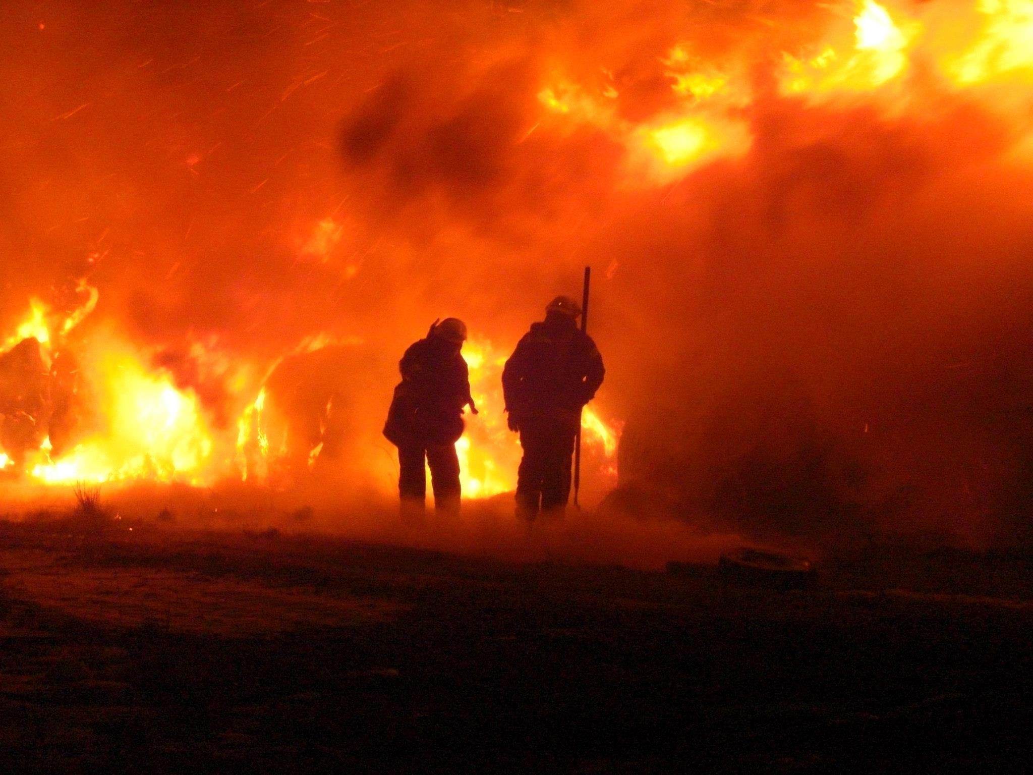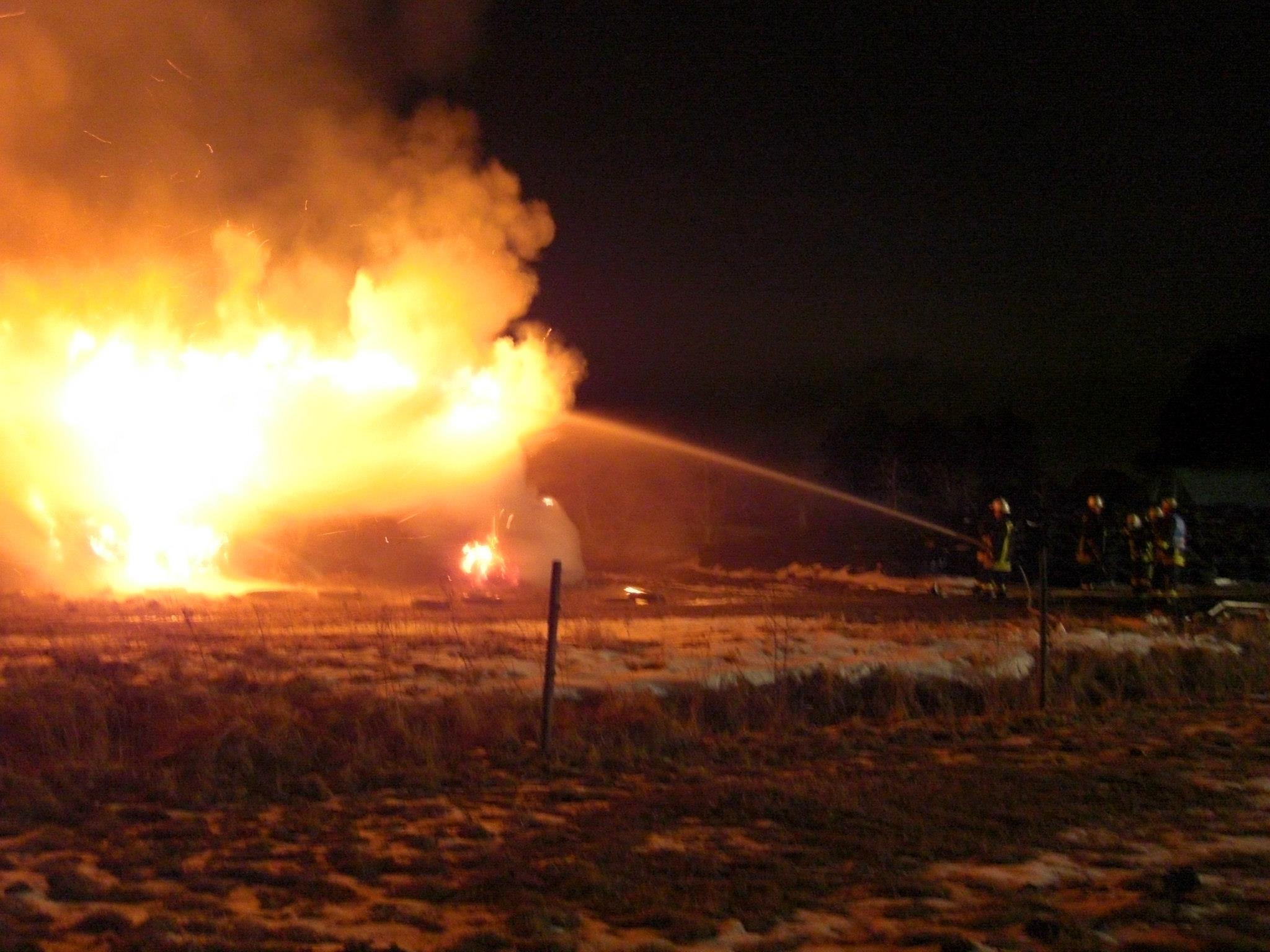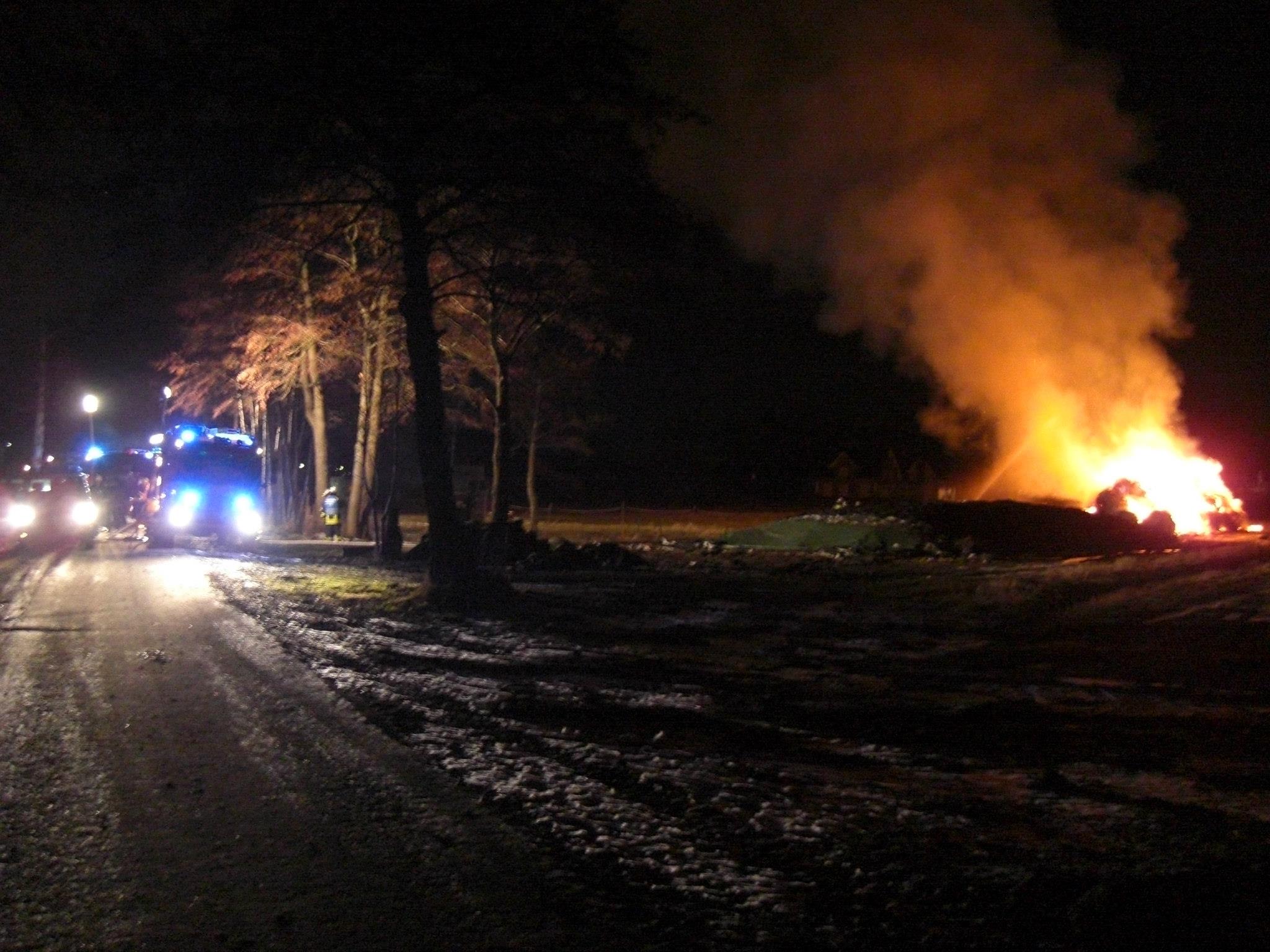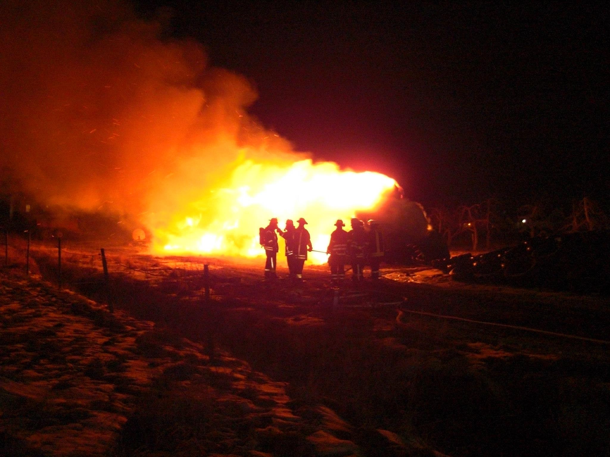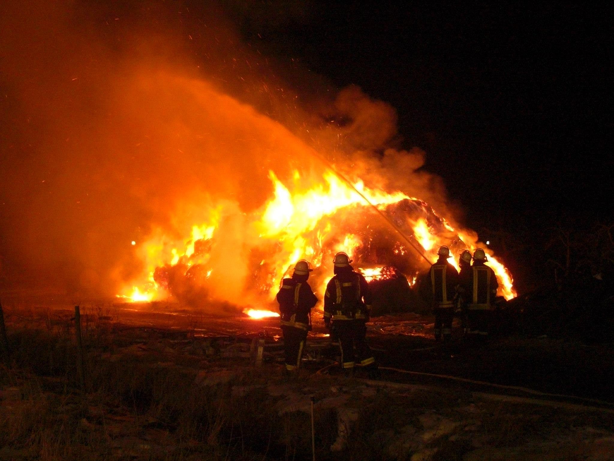 Zu einem Großfeuer mussten die Einsatzkräfte vom Zug I der Ortsfeuerwehr Buxtehude am Donnerstagabend ausrücken. Im Bereich zwischen Rübker Str und Bahnlinie sollten mehrere Heuballen brennen. Bereits auf der Anfahrt war heller Feuerschein zu erkennen. Die Anfahrt erfolgte über Stemmans Weg und Großer Moorweg. Vor Ort wurde dann das ganze Ausmaß des Schadens sichtbar. Etwa 120 gestapelte Rundballen standen in Vollbrand, an eine mögliche Rettung einiger Ballen war bereits am Einsatzbeginn nicht mehr zu denken. Aus diesem Grund wurde seitens der Einsatzleitung schnell entschieden das gesamte Brandgut am Großen Moorweg kontrolliert herunterbrennen zu lassen. Ein gezieltes Ablöschen der ca. 25m x 7m großen Fläche wäre nur mit einem immensen Personal- & Materialaufwand möglich gewesen, wodurch sich die Einsatzkosten unnötig erhöht hätten. Stattdessen entschied man sich das Einsatzpersonal vor Ort auf ein Minimum zu reduzieren, um eine Brandwache sicherzustellen.