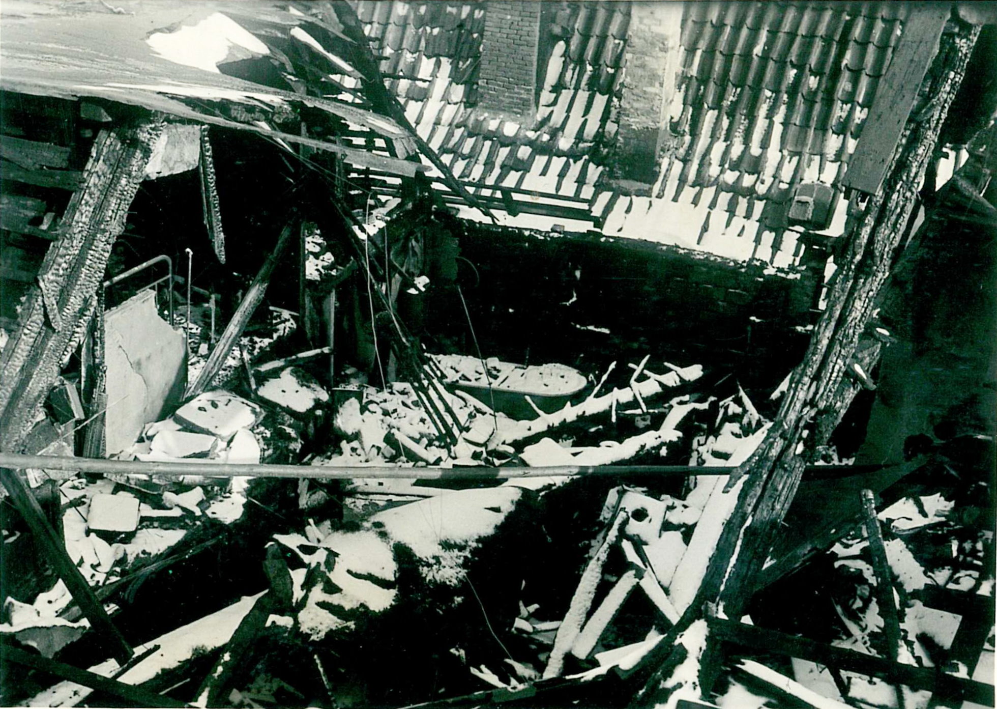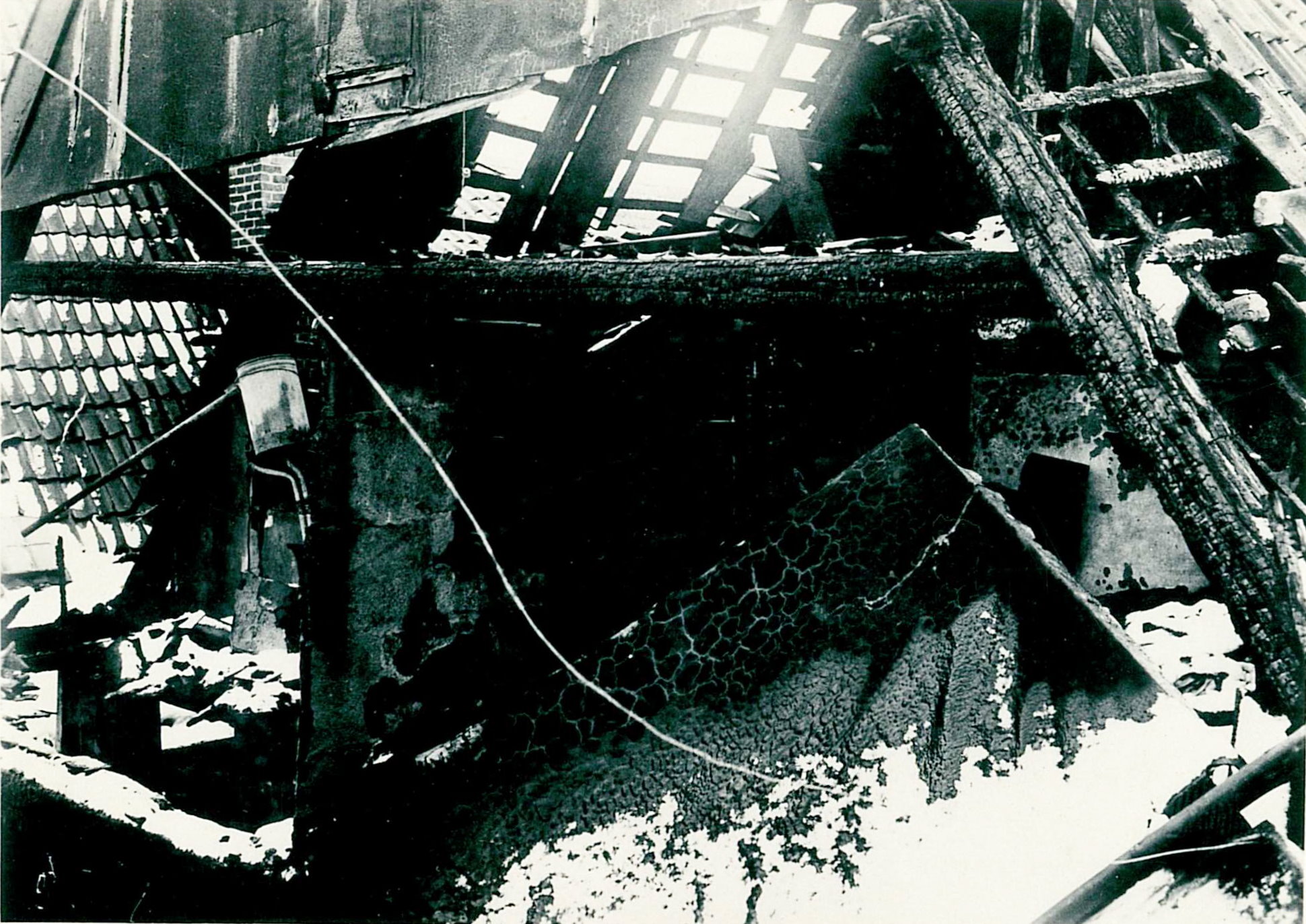 Eine andere Abteilung der Wehr hatte unterdeß den Brand tatkräftig in Angriff genommen. Die Türen wurden gesprengt und Fenster ausgehoben, um an den Brandherd herankommen zu können. Das erste Wasser wurde den Hydranten am Marktplatz und bei Gebr. Röhrs entnommen und das Feuer nach der Straßenseite zu abgeriegelt. In der Zwischenzeit hatte die Motorspritze, der bald