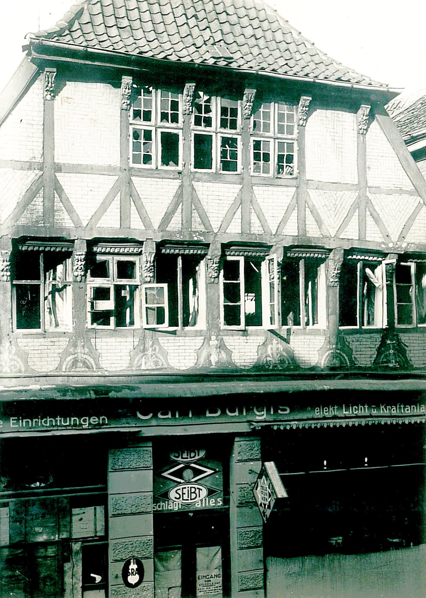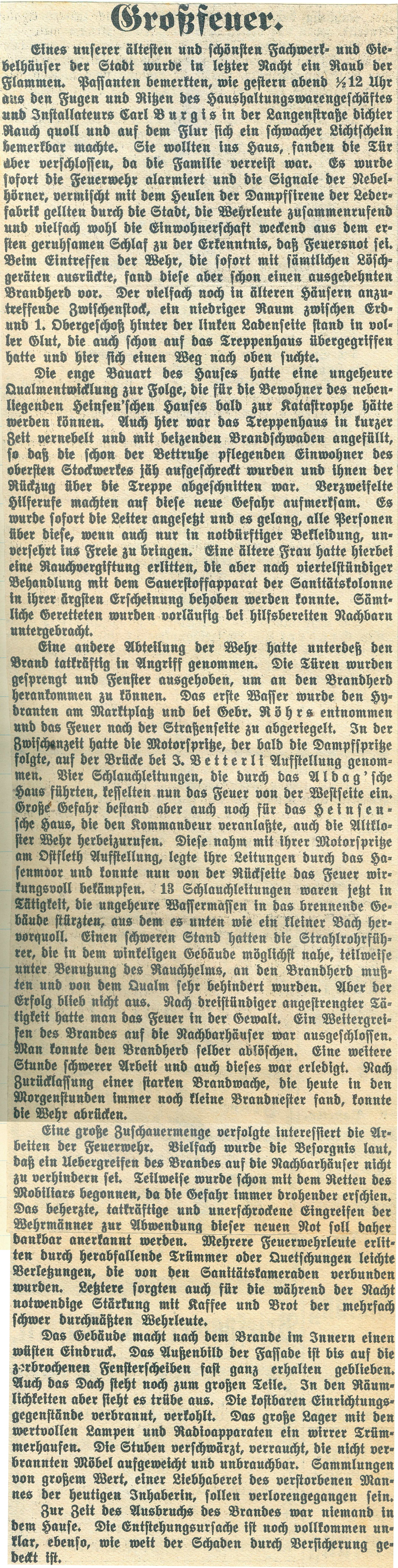Eines unserer ältesten und schönsten Fachwerk- und Giebelhäuser der Stadt wurde in letzter Nacht ein Raub der Flammen. Passanten bemerkten, wie gestern abend 1/2 12 Uhr aus den Fugen und Ritzen des Haushaltswarengeschäftes und Installateuers Carl Burgis in der Langenstraße dichter Rauch quoll und auf dem Flur sich ein schwacher Lichtschein bemerkbar machte. Sie wollten ins Haus, fanden die Tür aber verschlossen, da die Familie vereist war. Es wurde sofort die Feuerwehr alarmiert und die Signale der Nebelhörner, vermischt mit dem Heulen der Dampfsirene der Lederfabrik gellten durch die Stadt, die Wehrleute zusammenrufend und vielfach wohl die Einwohnerschaft weckend aus dem ersten geruhsamen Schlaf zu der Erkenntnis, daß Feuersnot sei. Beim Eintreffen der Wehr, die sofort mit sämtlichen Löschgeräten ausrückte, fand diese aber schon einen ausgedehnten Brandherd vor. Der vielfach noch in älteren Häusern anzutreffende Zwischenstock, ein niedriger Raum zwischen Erd- und 1. Obergeschoß hinter der linken Ladenseite stand in voller Glut, die auch schon auf das Treppenhaus übergegriffen hatte und hier sich einen Weg nach oben suchte.