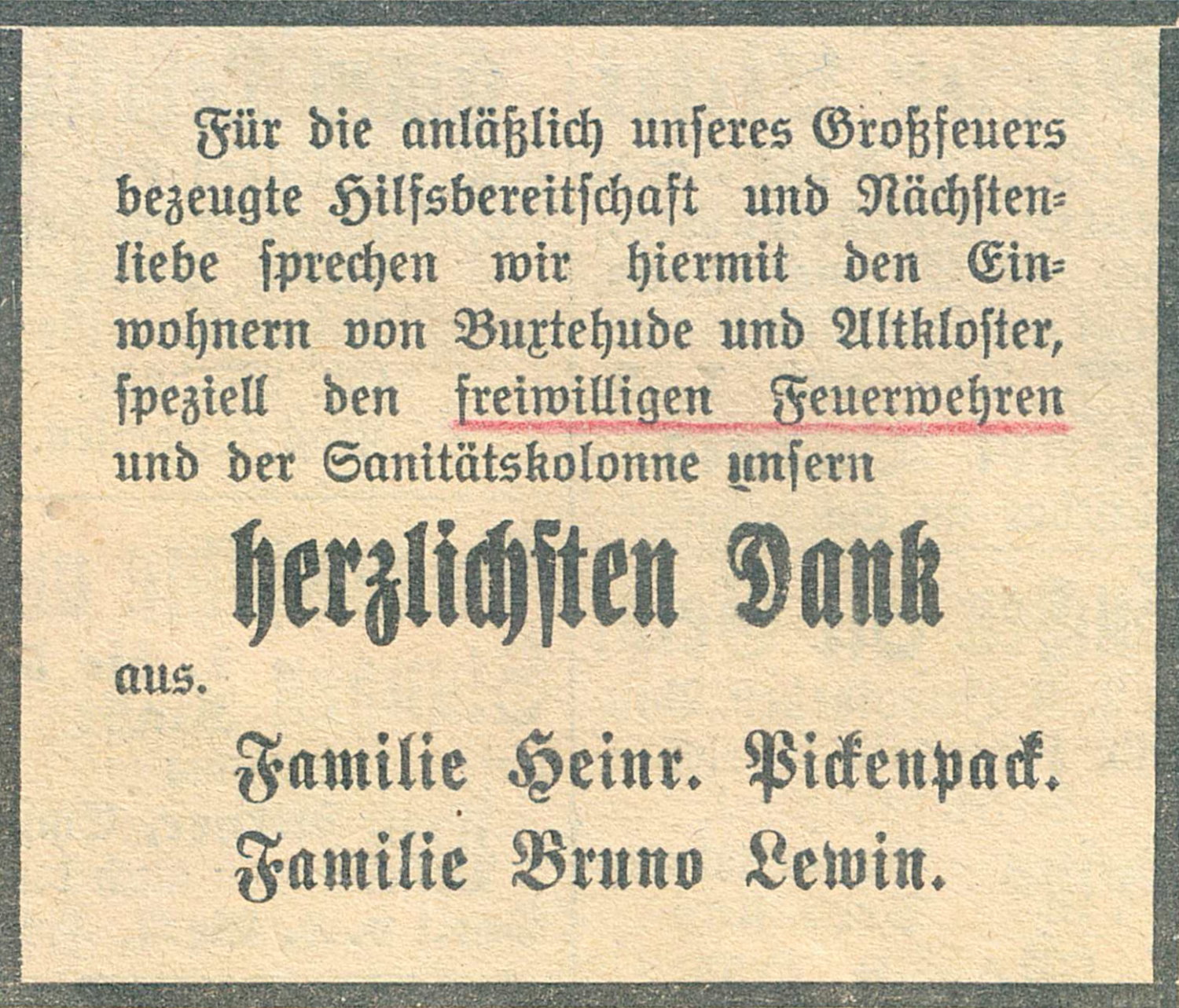 Für die anläßlich unseres Großfeuers bezeugte Hilfsbereitschaft und Nächstenliebe sprechen wir hiermit den Einwohnern von Buxtehude und Altkloster, speziell den freiwilligen Feuerwehren und der Sanitätskolonne unseren herzlichen Dank aus. Familie Heinr. Pickenpack, Familie Bruno Lewin.