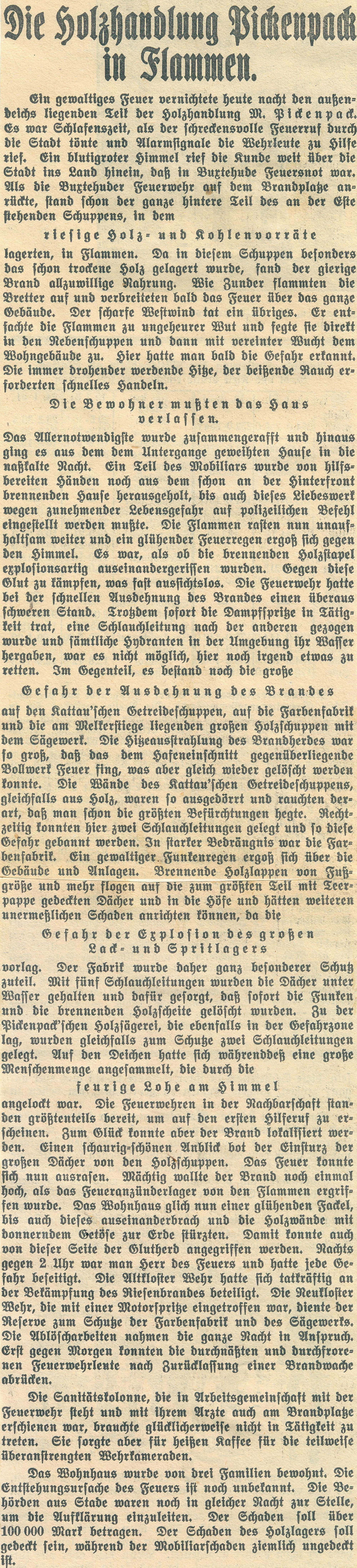 Ein gewaltiges Feuer vernichtete heute Nacht den außendeichs liegenden Teil der Holzhandlung Pickenpack. Es war Schlafenszeit, als der schreckensvolle Feuerruf durch die Stadt tönte und Alarmsignale die Wehrleute zu Hilfe rief. Ein blutigroter Himmel rief die Kunde weit über die Stadt ins Land hinein, daß in Buxtehude Feuersnot war. Als die Buxtehuder Feuerwehr auf dem Brandplatze anrückte, stand schon der ganze hintere Teil des an der Este stehende Schuppens, in dem riesige Holz- und Kohlenvorräte lagerten, in Flammen. Da in diesem Schuppen besonders das schon trockene Holz gelagert wurde, fand der gierige Brand allzuwillige Nahrung. Wie Zunder flammten die Bretter auf und verbreiteten bald das Feuer über das ganze Gebäude. Der scharfe Westwind tat ein übriges. Er entfachte die Flammen zu ungeheurer Wut und fegt sie direkt in den Nebenschuppen und dann mit vereinter Wucht dem Wohngebäude zu. Hier hatte man bald die Gefahr erkannt. Die immer drohender werdende Hitze, der beißende Rauch erforderten schnelles Handeln. Die Bewohner mußten das Haus verlassen. Das Allernotwendigste wurde zusammengerafft und hinaus ging es aus dem dem Untergange geweihten Hause in die naßkalte Nacht. Ein Teil des Mobiliars wurde von hilfsbereiten Händen noch aus dem schon an der Hinterfront brennenden Hause herausgeholt, bis auch dieses Liebeswerk wegen zunehmender Lebensgefahr auf polizeilichem Befehl eingestellt werden mußte. Die Flammen rasten nun unaufhaltsam weiter und ein glühender Feuerregen ergoß sich gegen den Himmel. Es war, als ob die brennenden Holzstapel explosionsartig auseinandergerissen wurden. Gegen diese Glut zu kämpfen, war fast aussichtslos. Die Feuerwehr hatte bei der schnellen Ausdehnung des Brandes einen überaus schweren Stand. Trotzdem sofort die Dampfspritze in Tätigkeit trat, eine Schlauchleitung nach der anderen gezogen wurde und sämtliche Hydranten in der Umgebung ihr Wasser hergaben, war es nicht möglich, hier noch irgend etwas zu retten. Im Gegenteil, es bestand noch die große Gefahr der Ausdehnung des Brandes auf den Kattau`schen Getreideschuppen, auf die Farbenfabrik und die am Melkerstiege liegenden großen Holzschuppen mit Sägewerk. Die Wände des Kattau`schen Getreideschuppens, gleichfalls aus Holz, waren so ausgedörrt und rauchten derart, daß man schon die größten Befürchtungen hegte. Rechtzeitig konnten hier zwei Schlauchleitungen gelegt und so diese Gefahr gebannt werden. In starker Bedrängnis war die Farbenfabrik. Ein gewaltiger Funkenregen ergoß sich über die Gebäude und Anlagen. Brennende Holzlappen von Fußgröße und mehr flogen auf die zum größten Teil mit Teerpappe gedeckten Dächer und hätten weiteren unermeßlichen Schaden anrichten können, da die Gefahr der Explosion des großen Lack- und Spritlagers vorlag. Der Fabrik wurde daher ganz besonderer Schutz zuteil. Mit fünf Schlauchleitungen wurden die Dächer unter Wasser gehalten. Auf den Deichen hatte sich währenddessen eine große Menschenmenge angesammelt, die durch die feurige Lohe am Himmel angelockt war. Die Feuerwehren in der Nachbarschaft standen größtenteils bereit, um auf den ersten Hilferuf zu erscheinen. Zum Glück konnte aber der Brand lokalisiert werden. Einen schaurig-schönen Anblick bot der Einsturz der großen Dächer von den Holzschuppen. Das Wohnhaus glich nun einer glühenden Fackel, bis auch dieses auseinanderbrach und die Holzwände mit donnerndem Getöse zur Erde stürzten. Damit konnte auch von dieser Seite der Glutherd angegriffen werden. Nachts um 2 Uhr war man Herr des Feuers und hatte jede Gefahr beseitigt. Die Altkloster Wehr hatte sich tatkräftig an der Bekämpfung des Riesenbrandes beteiligt. Die Neukloster Wehr, die mit einer Motorspritze eingetroffen war, diente der Reserve zum Schutze der Farbenfabrik und des Sägewerks. Die Behörden aus Stade waren noch in gleicher Nacht zur Stelle, um die Aufklärung einzuleiten. Der Schaden soll über 100 000 Mark betragen.