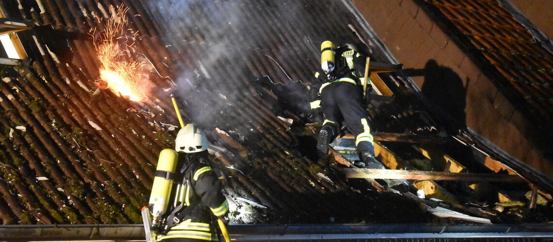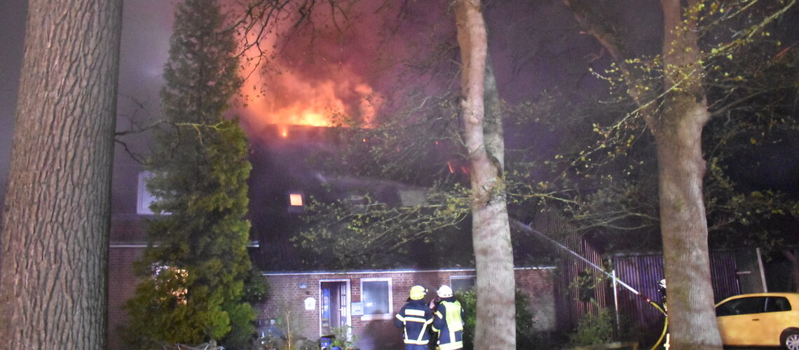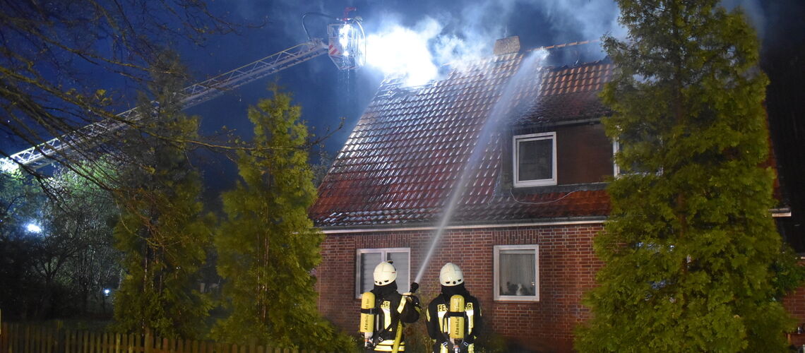 Beim Eintreffen der Feuerwehr schlugen bereits Flammen im Bereich des Giebels und Firstes aus dem rückwärtigen Teil des Gebäudes. Das Feuer fraß sich - vom Anbau bis zum Hauptgebäude - durch das Dach, so Gemeindebrandmeister Christian Taschendorf. Unter Atemschutz drangen die Löschtrupps ins Gebäude vor, aufgrund der "enormen Hitze" durch das Feuer mussten sich die Kräfte zu Beginn des Einsatzes aus dem verrauchten Gebäudekörper zurückziehen und den Brand von außen bekämpfen - unterstützt durch die Drehleiter aus Harsefeld. Diese hatte sich an der Sittenser Straße (L130) positioniert.