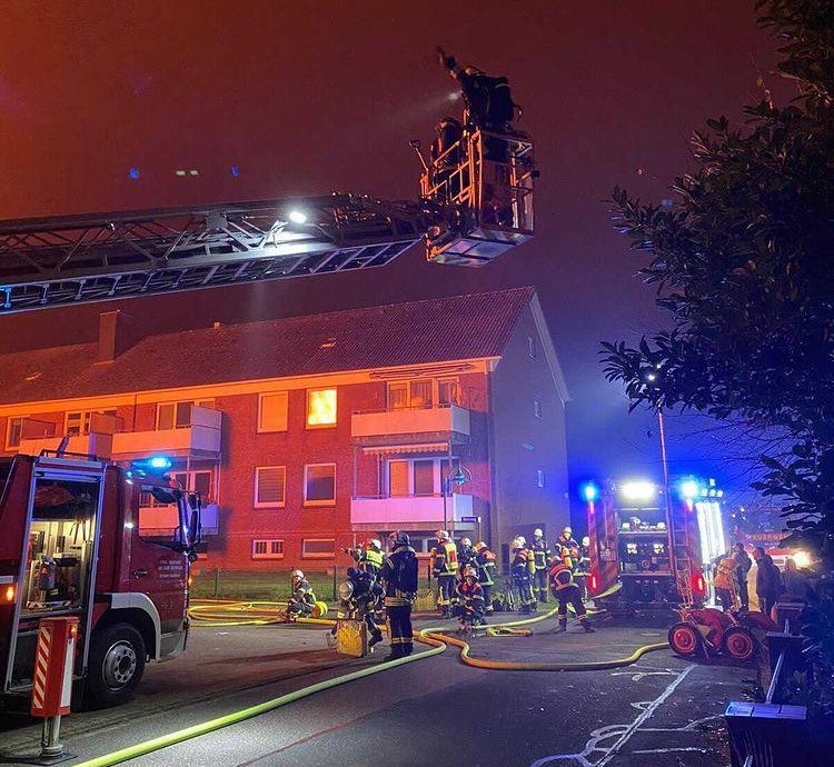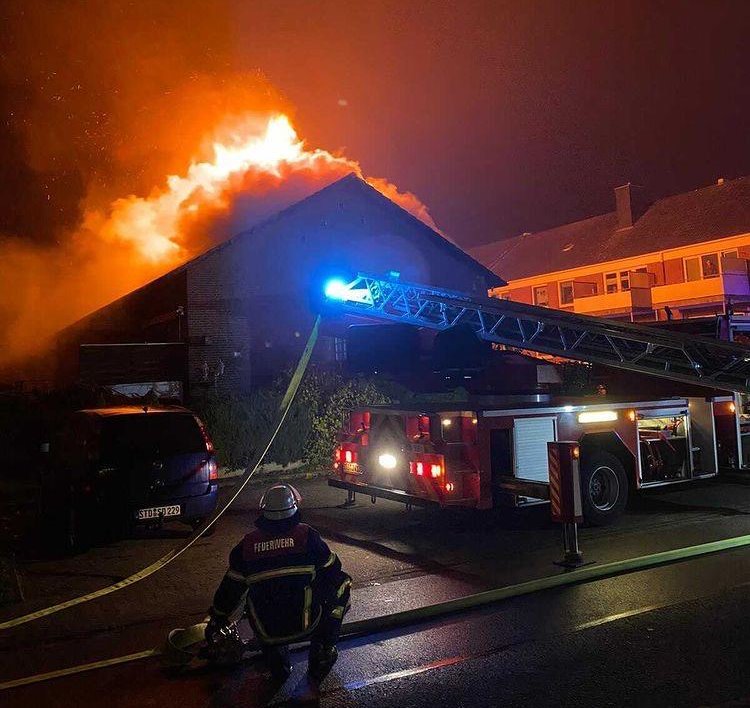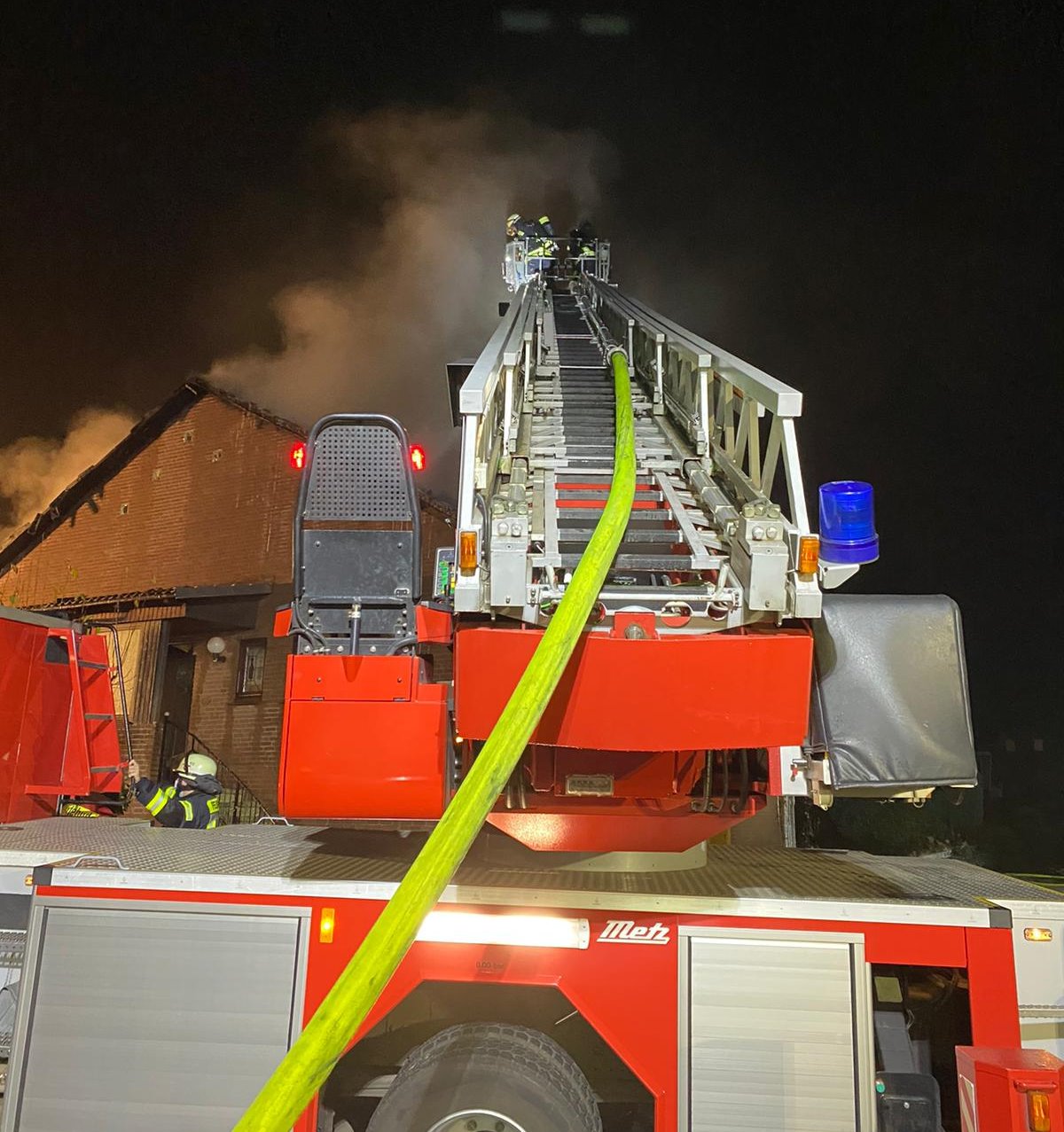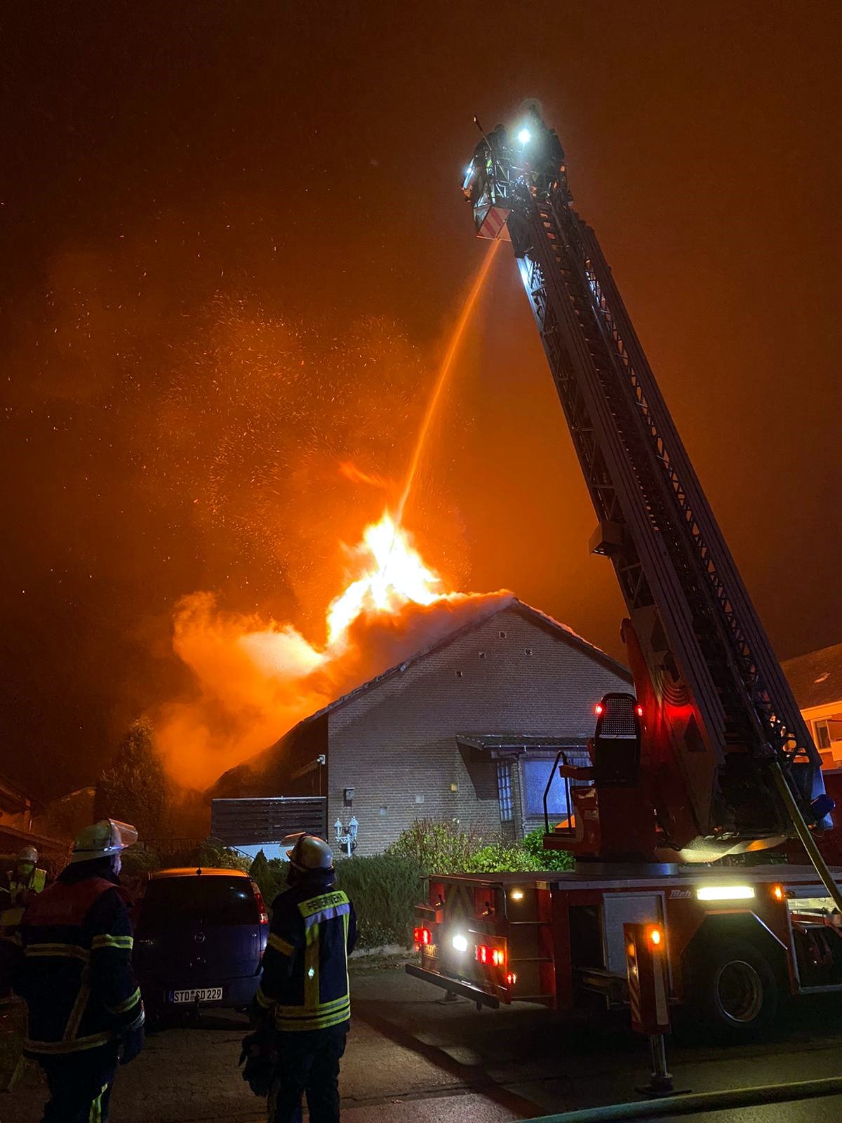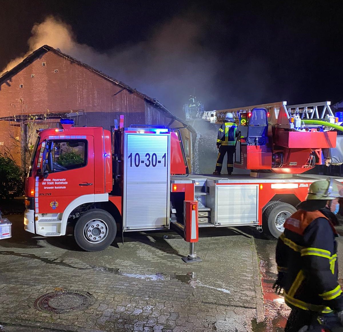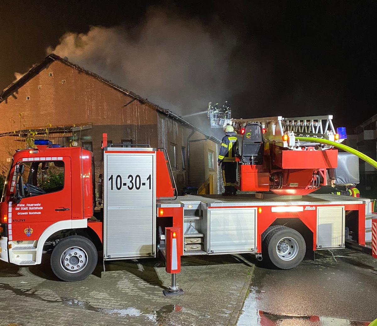 Bereits beim Eintreffen der alarmierten Einsatzkräfte aus Königreich, Estebrügge, Hove und Moorende stand der Dachstuhl des Gebäudes in Vollbrand. Die Bewohner hatten sich rechtzeitig in Sicherheit bringen können und blieben unverletzt. Die ebenfalls alarmierte Drehleiter vom Zug I der Ortsfeuerwehr Buxtehude wurde vor dem Gebäude in Stellung gebracht. Die Feuerwehr bekämpfte den Dachstuhlbrand mit mehreren Trupps unter schwerem Atemschutz, unter anderem auch aus dem Korb der Drehleiter.