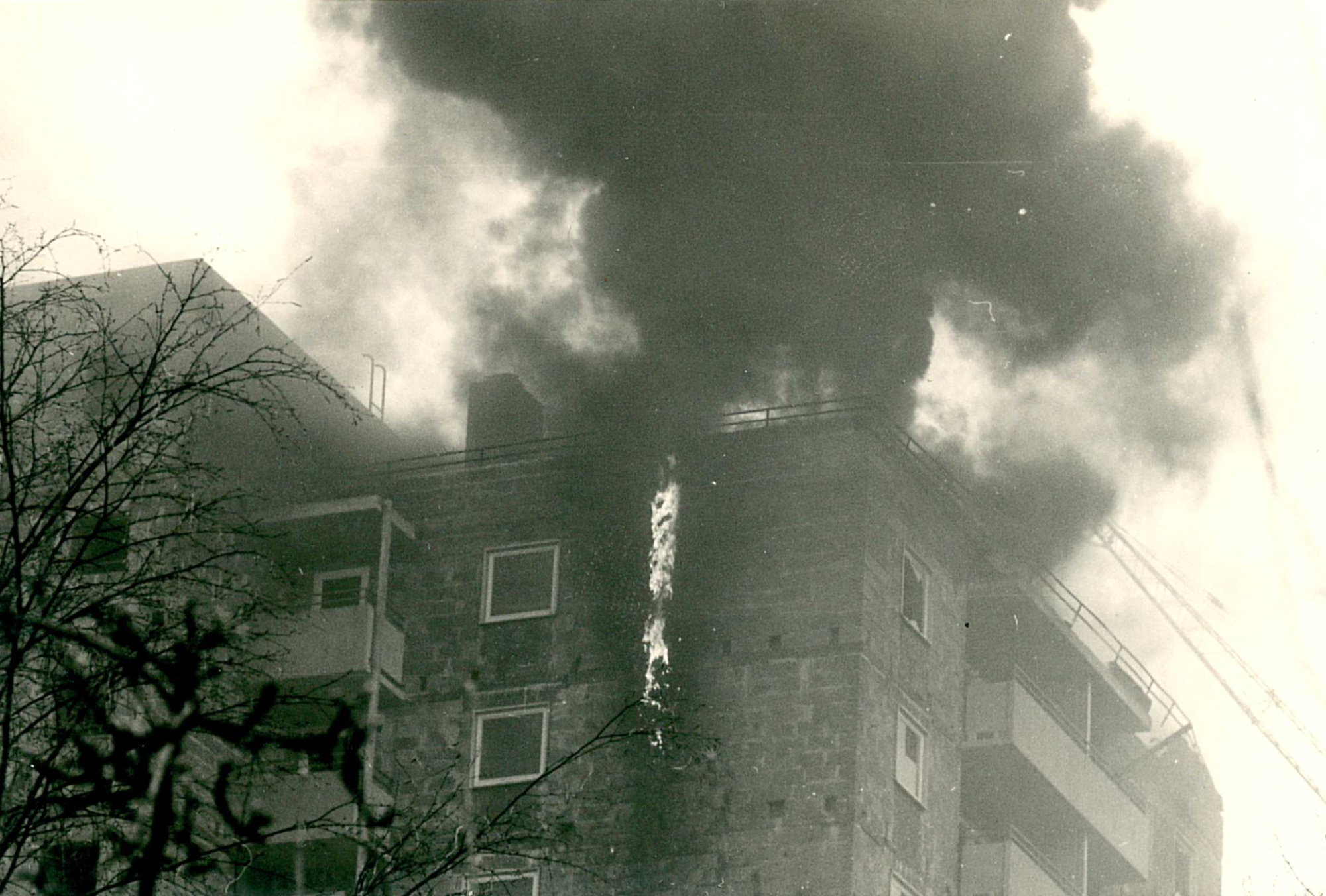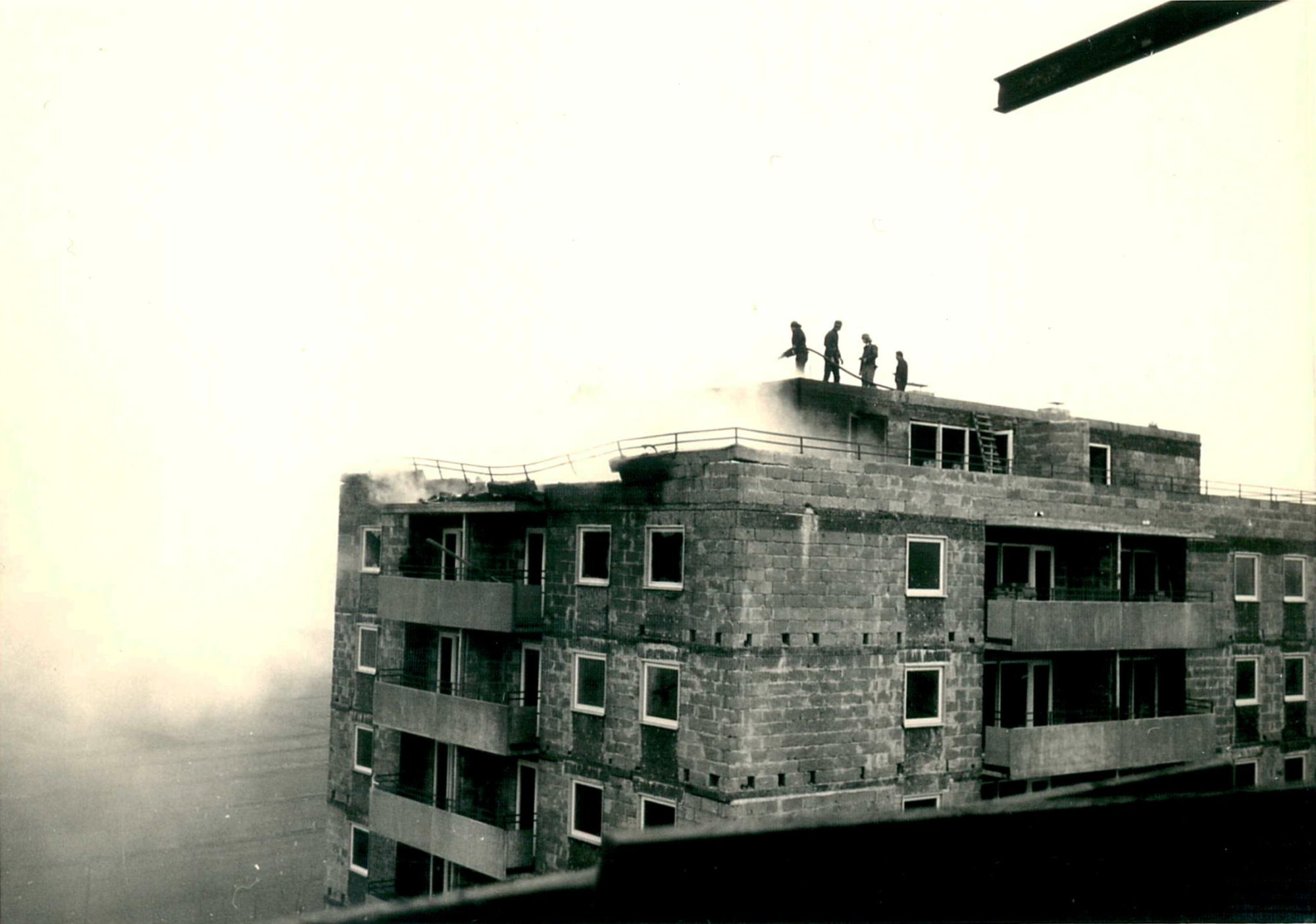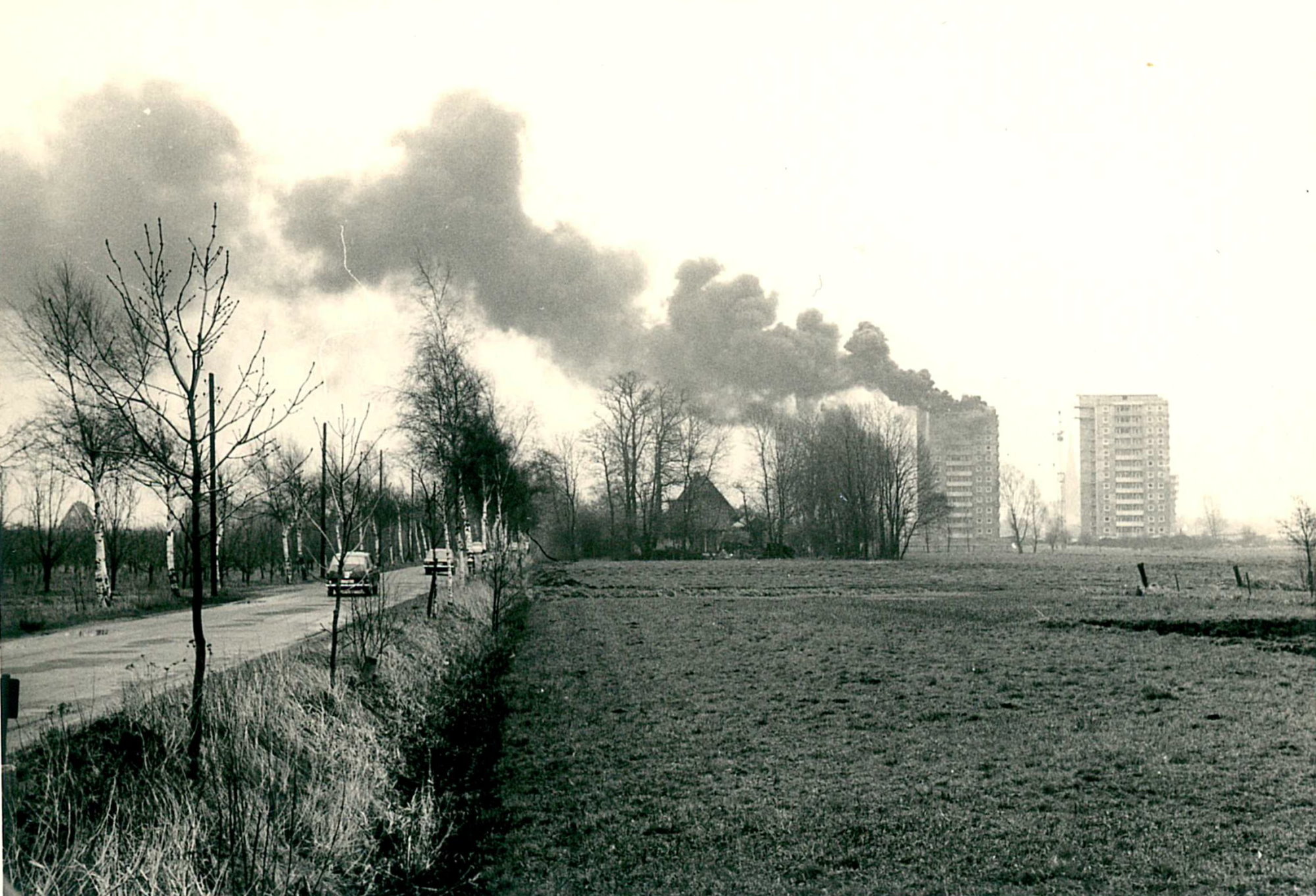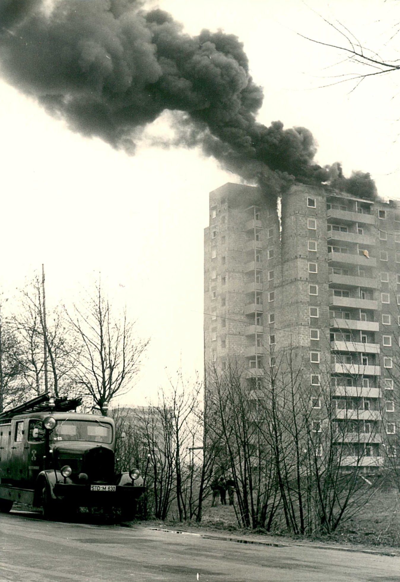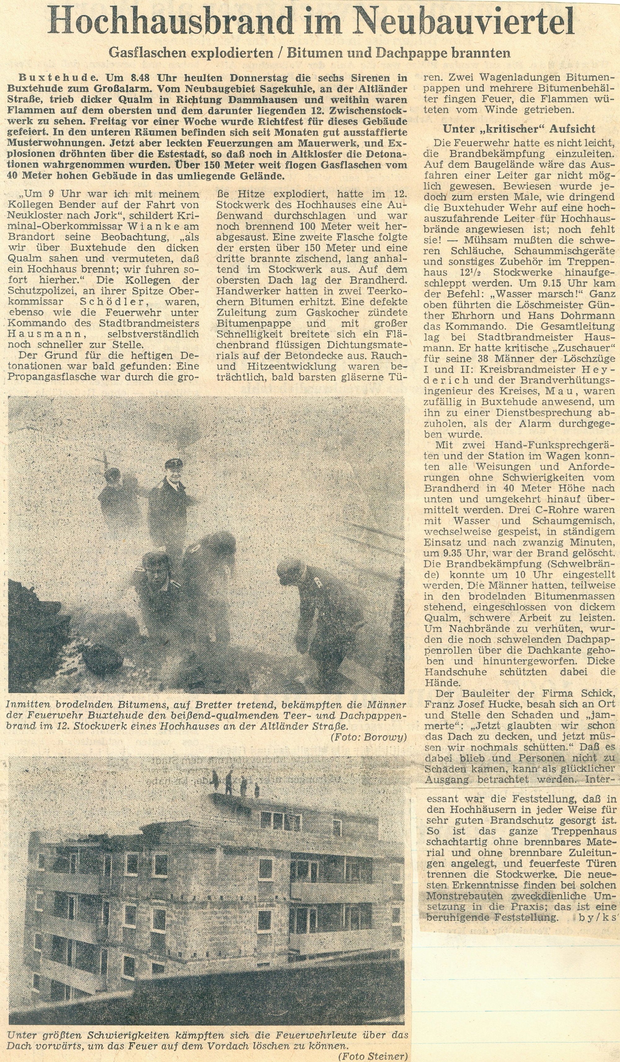 In ganz neue Dimensionen mussten die Einsatzkräfte beider Züge der Ortsfeuerwehr Buxtehude am Donnerstagmorgen 30.03.1967 vordringen. Der Dachstuhl des Neubaus Schröderstraße 11 stand in Flammen. Dichter Rauch stieg von dem 12 1/2 stöckigen Hochhaus auf, welches sich noch zu großen Teilen im Rohbau befand. Durch einen defekten Gasanschluss war es bei Dachdeckerarbeiten zu einer schnellen Brandausbreitung gekommen. Gasflaschen explodierten und flogen bis zu 150m weit vom Gebäude, eine weitere brannte zischend auf dem Dach. Die Explosionen waren im ganzen Stadtgebiet zu hören.
