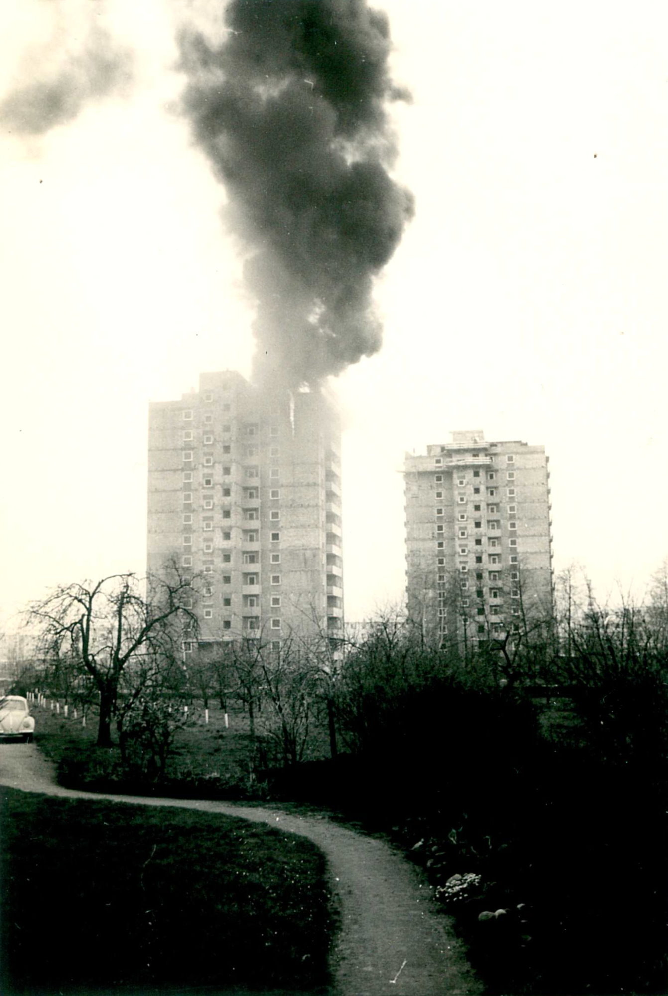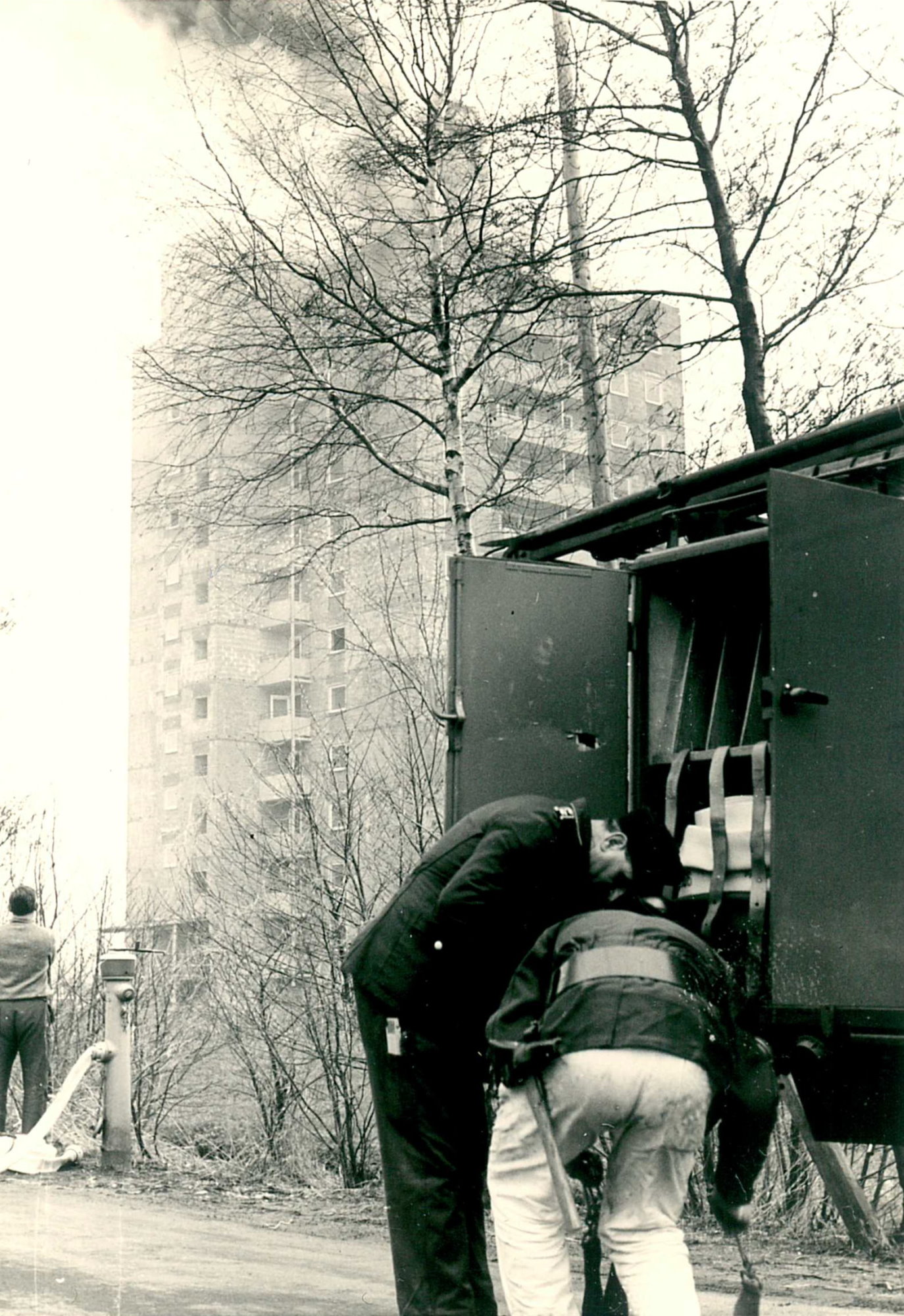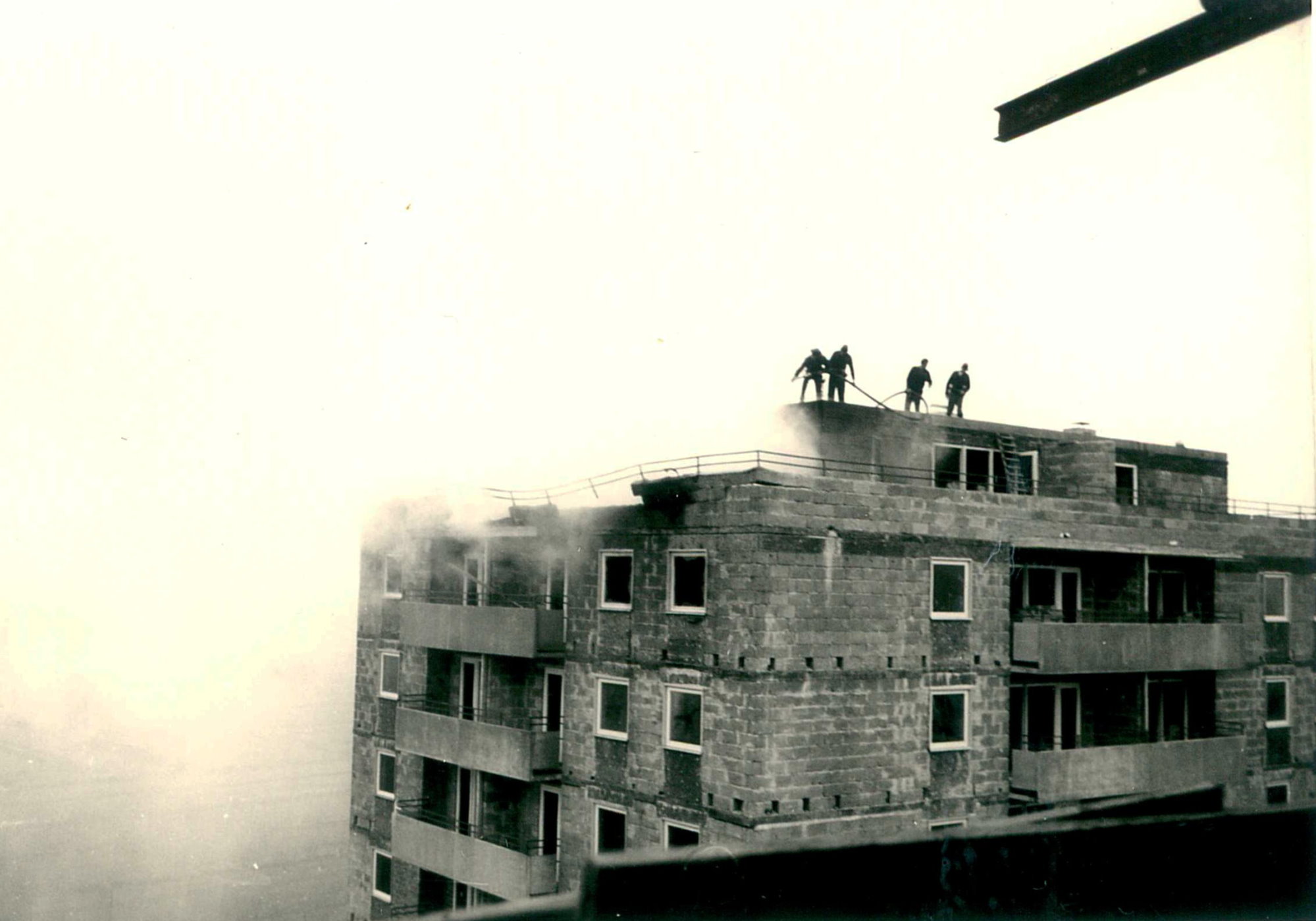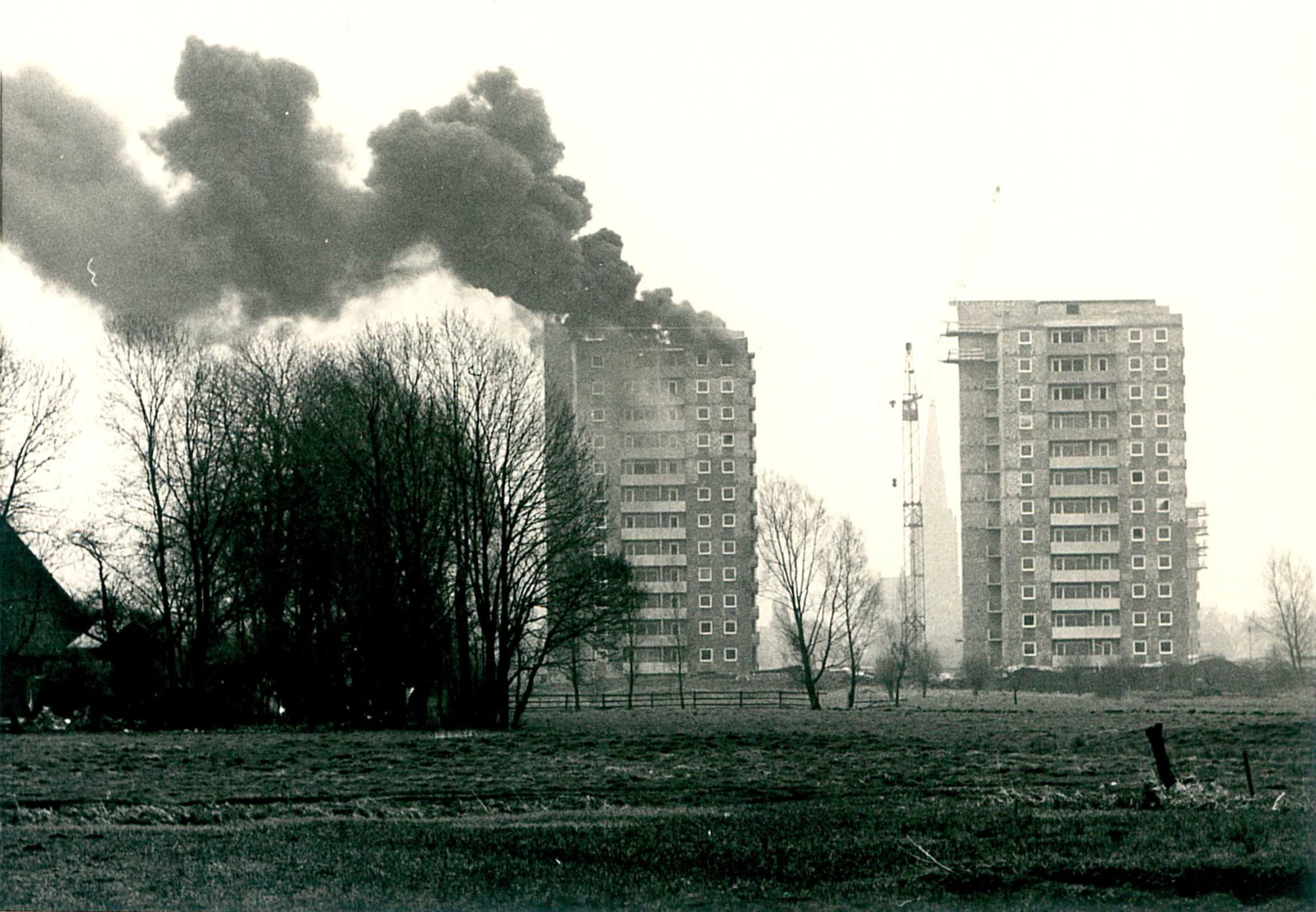 In ganz neue Dimensionen mussten die Einsatzkräfte beider Züge der Ortsfeuerwehr Buxtehude am Donnerstagmorgen 30.03.1967 vordringen. Der Dachstuhl des Neubaus Schröderstraße 11 stand in Flammen. Dichter Rauch stieg von dem 12 1/2 stöckigen Hochhaus auf, welches sich noch zu großen Teilen im Rohbau befand. Durch einen defekten Gasanschluss war es bei Dachdeckerarbeiten zu einer schnellen Brandausbreitung gekommen. Gasflaschen explodierten und flogen bis zu 150m weit vom Gebäude, eine weitere brannte zischend auf dem Dach. Die Explosionen waren im ganzen Stadtgebiet zu hören.