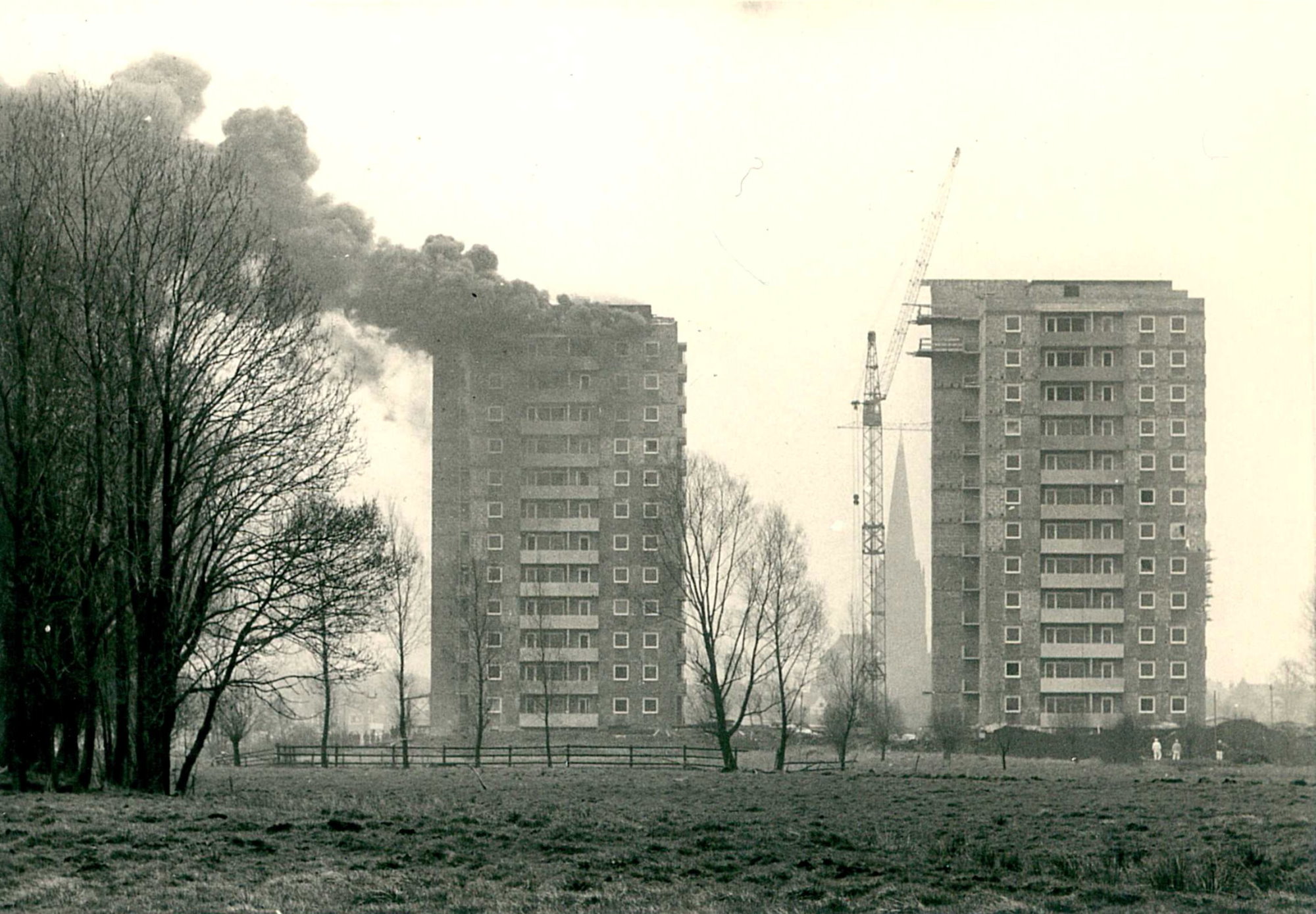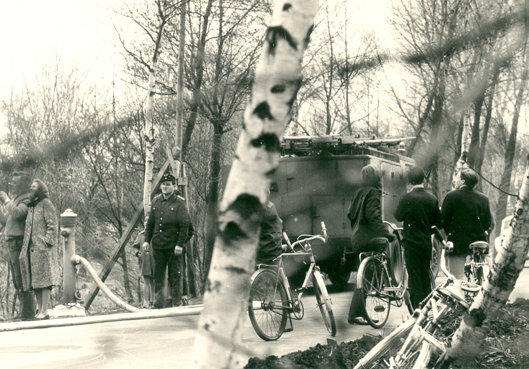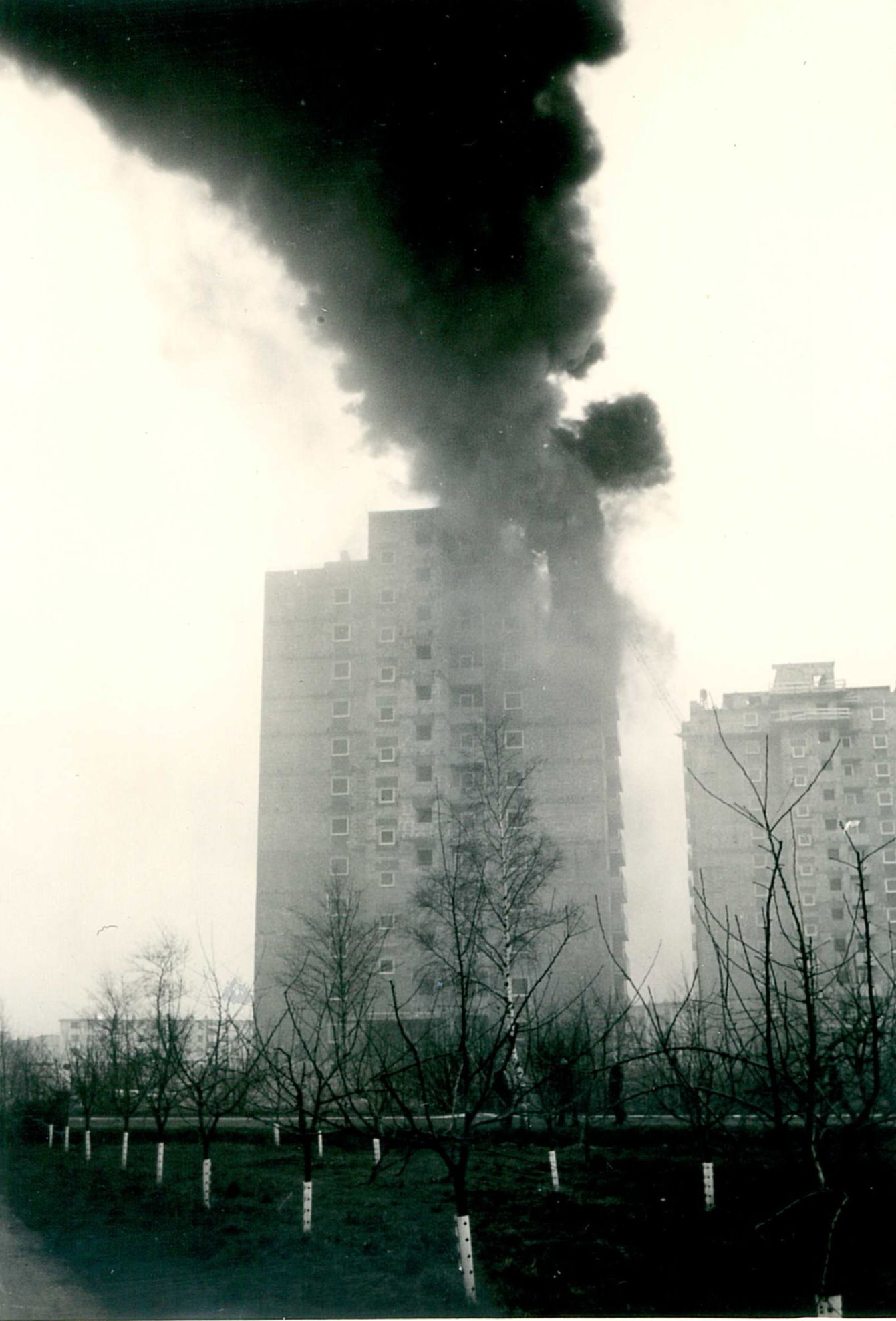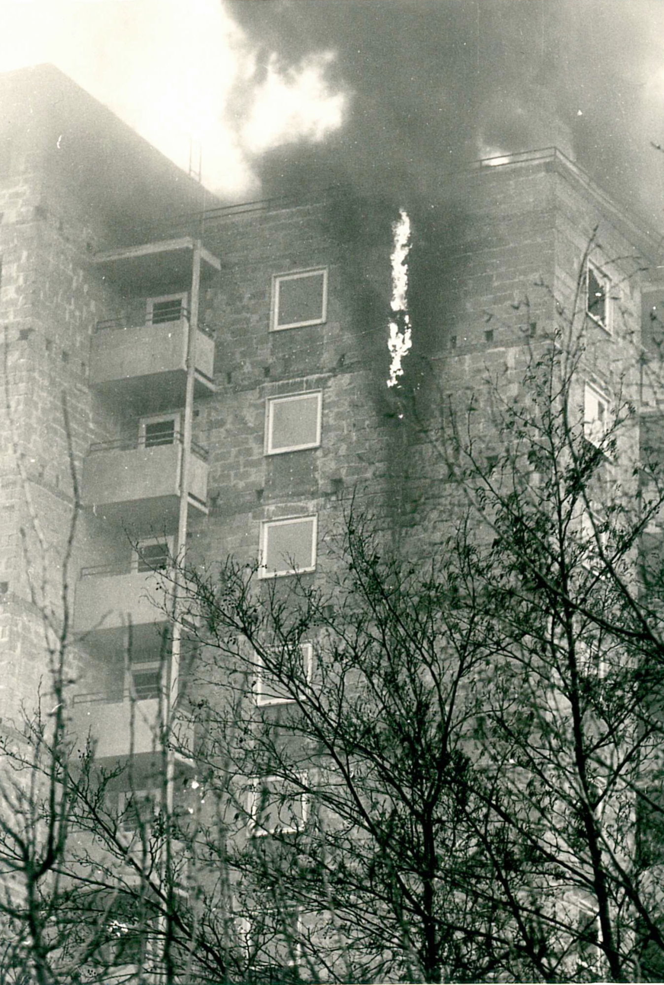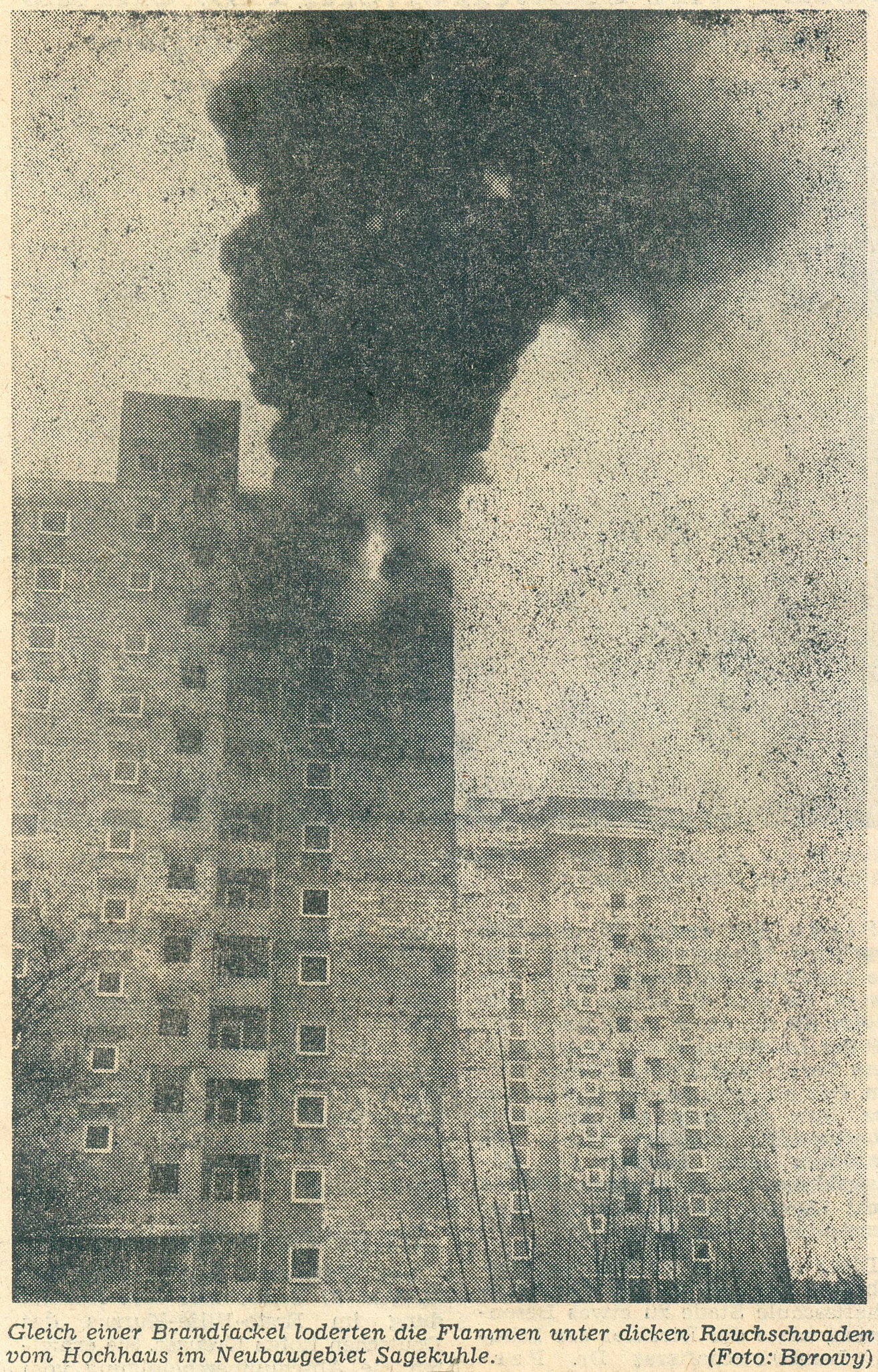In ganz neue Dimensionen mussten die Einsatzkräfte beider Züge der Ortsfeuerwehr Buxtehude am Donnerstagmorgen 30.03.1967 vordringen. Der Dachstuhl des Neubaus Schröderstraße 11 stand in Flammen. Dichter Rauch stieg von dem 12 1/2 stöckigen Hochhaus auf, welches sich noch zu großen Teilen im Rohbau befand. Durch einen defekten Gasanschluss war es bei Dachdeckerarbeiten zu einer schnellen Brandausbreitung gekommen. Gasflaschen explodierten und flogen bis zu 150m weit vom Gebäude, eine weitere brannte zischend auf dem Dach. Die Explosionen waren im ganzen Stadtgebiet zu hören.