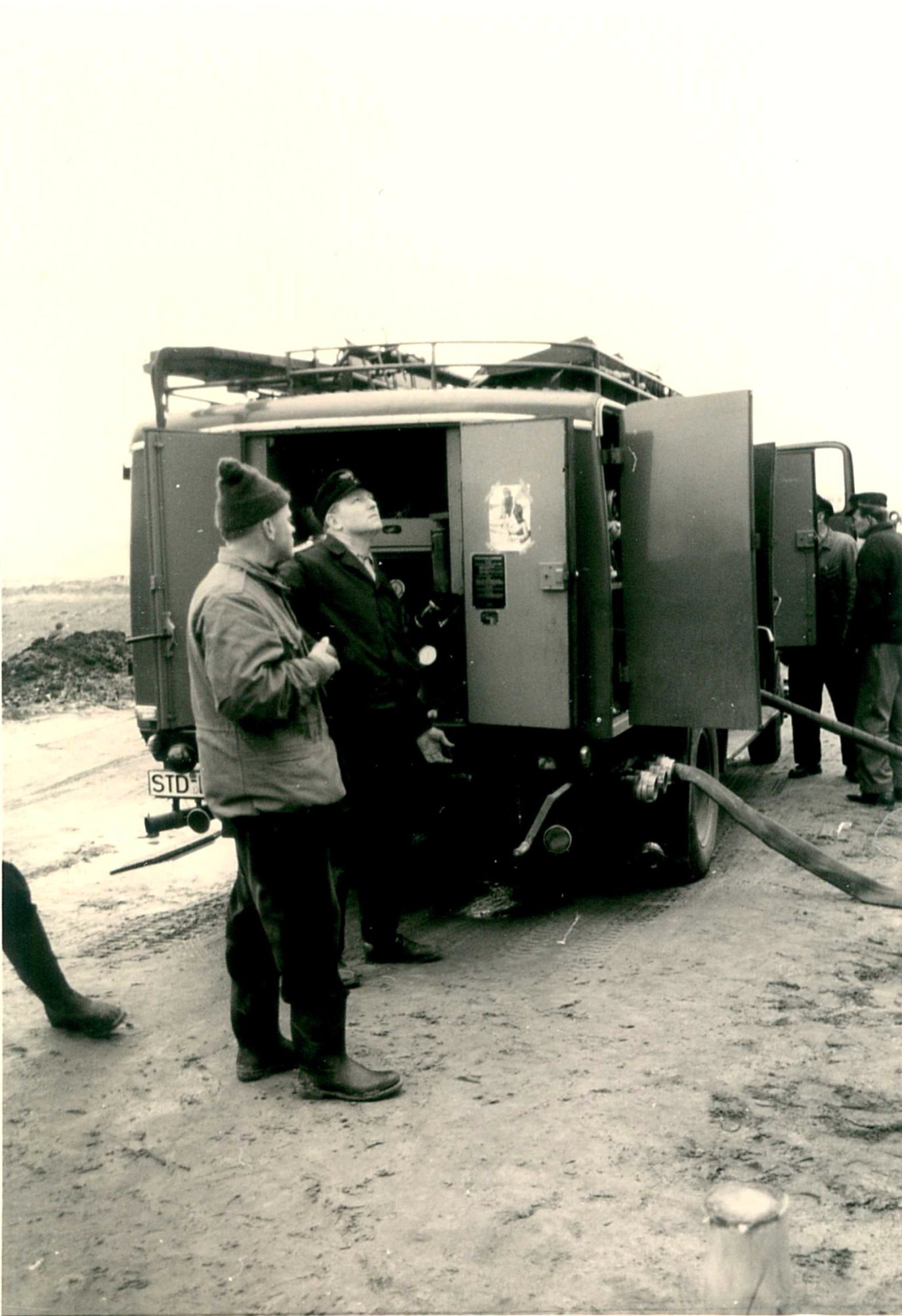Die Feuerwehr hatte es nicht leicht, die Brandbekämpfung einzuleiten. Auf dem Baugelände wäre das Ausfahren einer Leiter gar nicht möglich gewesen. Bewiesen wurde jedoch zum ersten Male, wie dringend die Buxtehuder Wehr auf eine hochauszufahrende Leiter für Hochhausbrände angewiesen ist; noch fehlt sie! - Mühsam mußten die schweren Schläuche, Schaummischgeräte und sonstiges Zubehör im Treppenhaus 12b1/2 Stockwerke hinaufgeschleppt werden. Um 9.15 Uhr kam der Befehl: „Wasser marsch!" Ganz oben führten die Löschmeister Günther Ehrhorn und Hans Dohrmann das Kommando. Die Gesamtleitung lag bei Stadtbrandmeister Hausmann. Er hatte kritische „Zuschauer" für seine 38 Männer der Löschzüge I und II: Kreisbrandmeister Heyderich und der Brandverhütungsingenieur des Kreises, Mau , waren zufällig in Buxtehude anwesend, um ihn zu einer Dienstbesprechung ab-zuholen, als der Alarm durchgegeben wurde.
