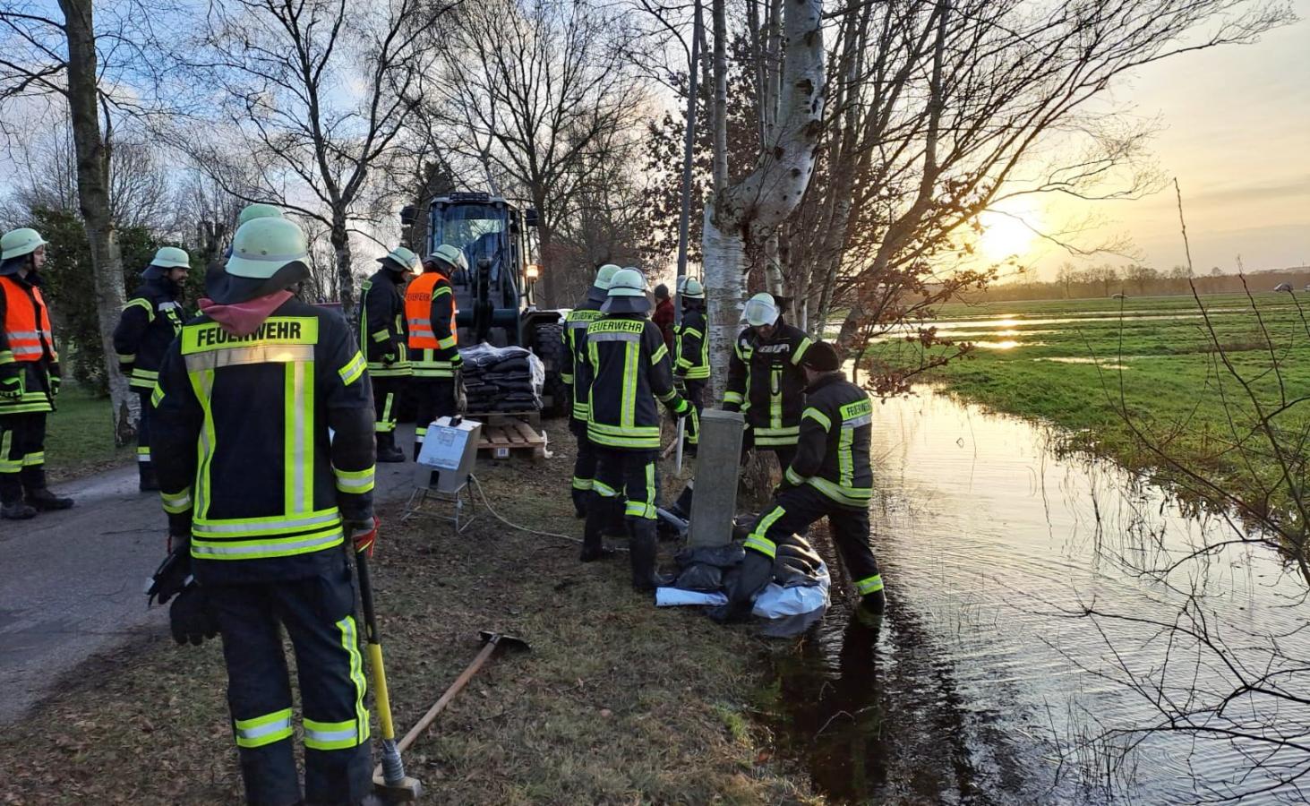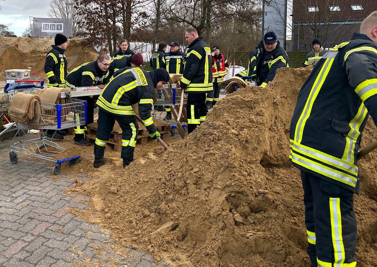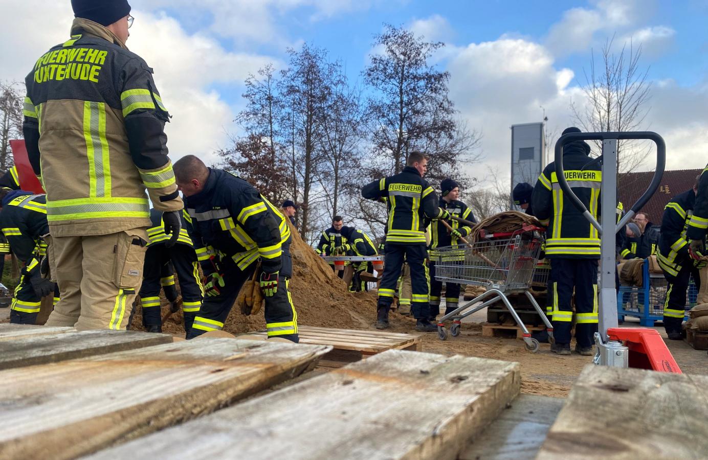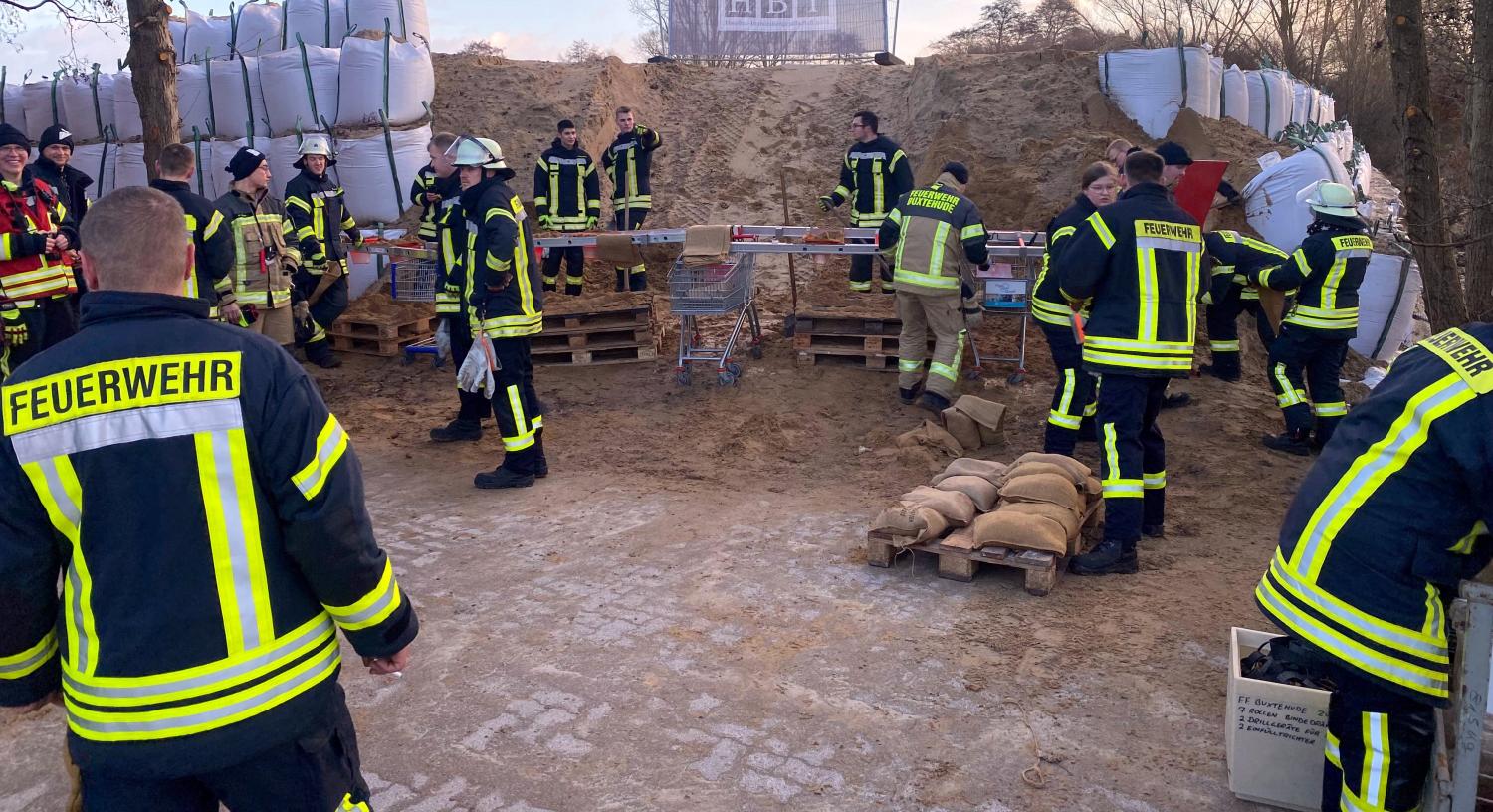 Zur Bereitstellung weiterer Sandsäcke wurden um kurz vor 9 Uhr die Ortsfeuerwehren Hedendorf und Neukloster zum Sandsackfüllen am Verbrauchermarktzentrum Westmoor alarmiert. Auch Einsatzkräfte vom THW Buxtehude unterstützten die Arbeiten. Insgesamt wurden 1500 Sandsäcke auf Paletten vorbereitet.