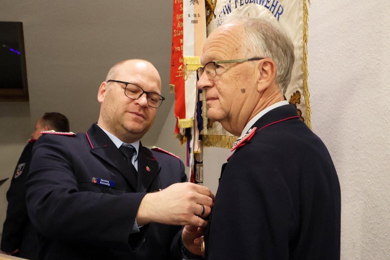 Eine ganz besondere Ehrung ging an Rainer Krusche vom Zug II für die 50-jährige Mitgliedschaft, die durch den Kreisbrandmeister Henning Klensang überreicht wurde.