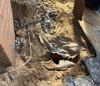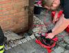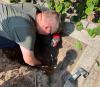 Um den genauen Leitungsverlauf herauszufinden wurde ein wenig Wasser in das Rohr geleitet und von oben abgemessen auf welcher Höhe das Tier ungefähr festsaß. Dazu mussten insgesamt drei Löcher gegraben werden und die Pflasterung der Terrasse aufgenommen werden. Das Rohr wurde dann unter Zuhilfenahme eines kleinen Winkelschleifers geöffnet.