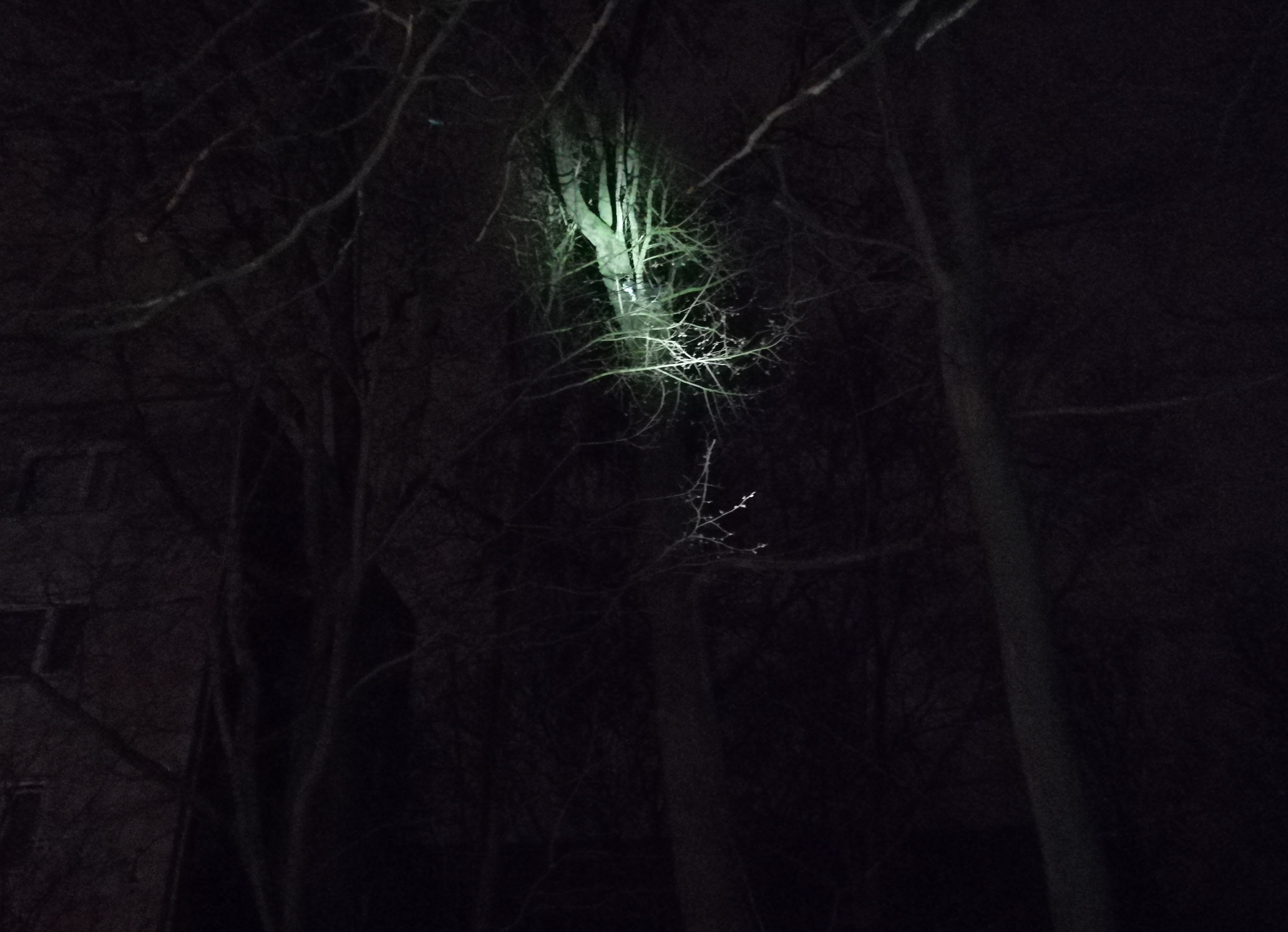 Nach dem Aufstellen der Drehleiter konnte nur der leichteste Feuerwehrmann mit dem Drehleiterkorb zu dem immer noch recht weit entfernten Baum fahren, ohne die Belastungsgrenze zu erreichen. Kurz vor dem Erreichen der Katze, die sehr aufgeregt schien, machte diese den Versuch zu flüchten. Glücklicherweise nicht nach oben, sondern kopfüber kletternd zum Boden, die letzten Meter im Sprung. Ohne sich für den Aufwand zu bedanken, verschwand das Tier in der Nacht.