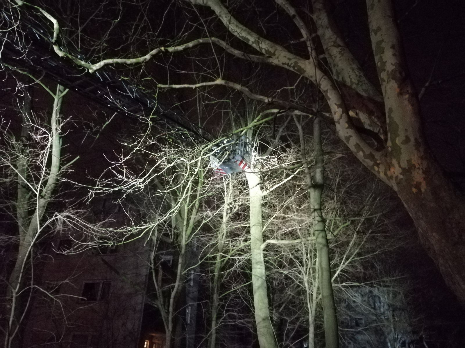 Vor Ort wurden die Kräfte vom Anrufer in Empfang genommen und in die Lage eingewiesen. Der betroffene Baum lag in dritter Reihe direkt auf dem Spielplatz und war von der Straße aus nicht mit der Drehleiter zu erreichen. Nach kurzer Beratung ob eine weitere Möglichkeit mittels tragbarer Leiter bestand, um die in etwa neun Metern Höhe sitzende Katze zu erreichen. Aufgrund des weichen Untergrundes musste diese Idee verworfen werden. Auch ein Aufstellen der Drehleiter auf der Zuwegung zum Spielplatz kam nicht in Betracht. Einzig ein angrenzender Parkplatz eines Mehrfamilienhauses kam in Frage. Zur Aufstellung der Leiter mussten zunächst die Hausbewohner geweckt werden, um parkende Fahrzeuge zu entfernen.