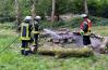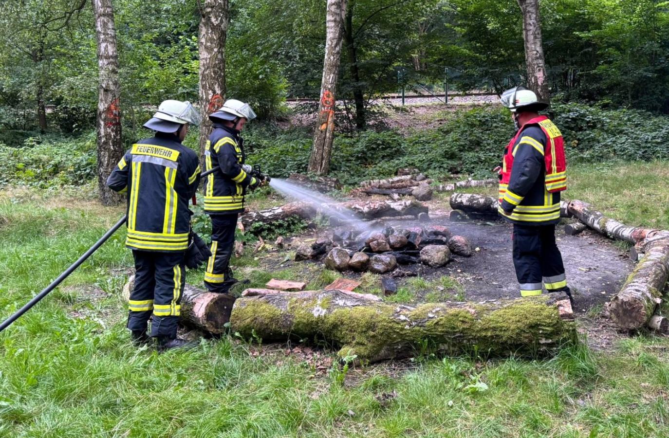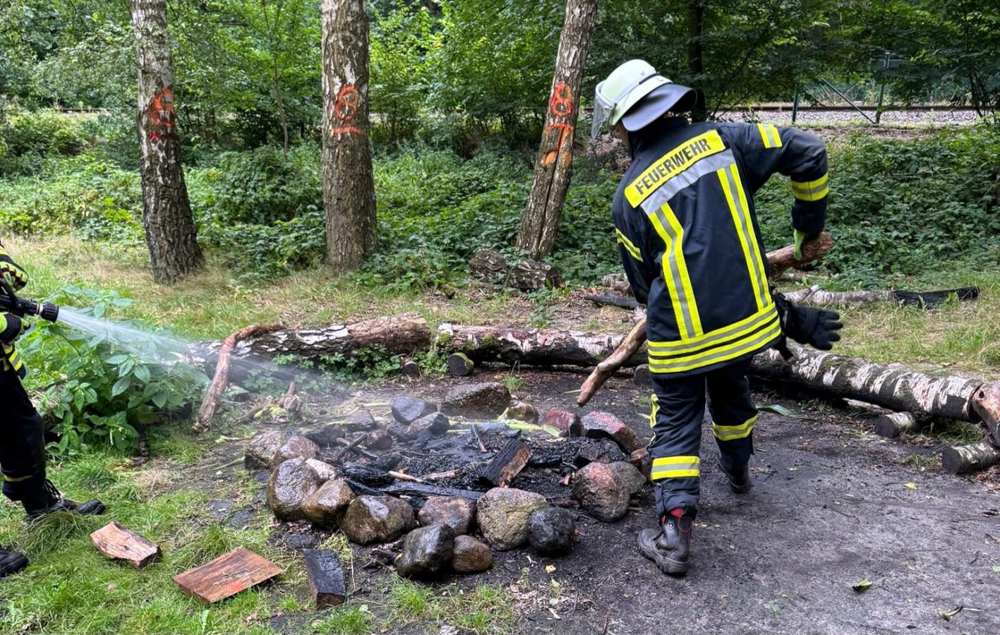 Wie in der Alarmierung gemeldet, qualmten Reste eines Lagerfeuers an der Feuerstelle. Da kein Verursacher oder Verantwortlicher mehr vor Ort war, löschten die Einsatzkräfte das Brandgut einmal mit dem Schnellangriffsschlauch ab.