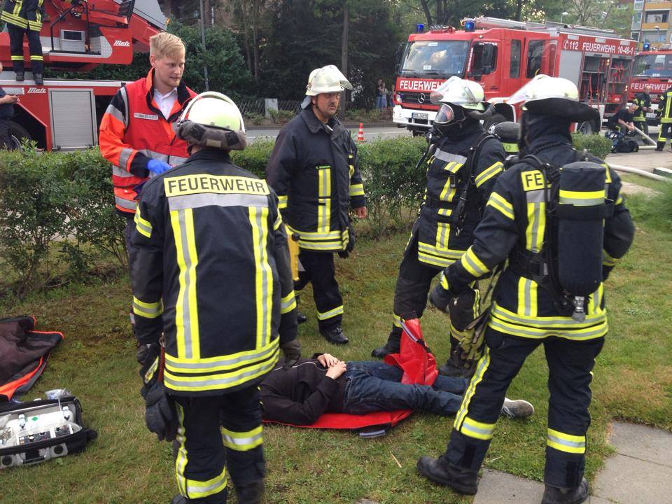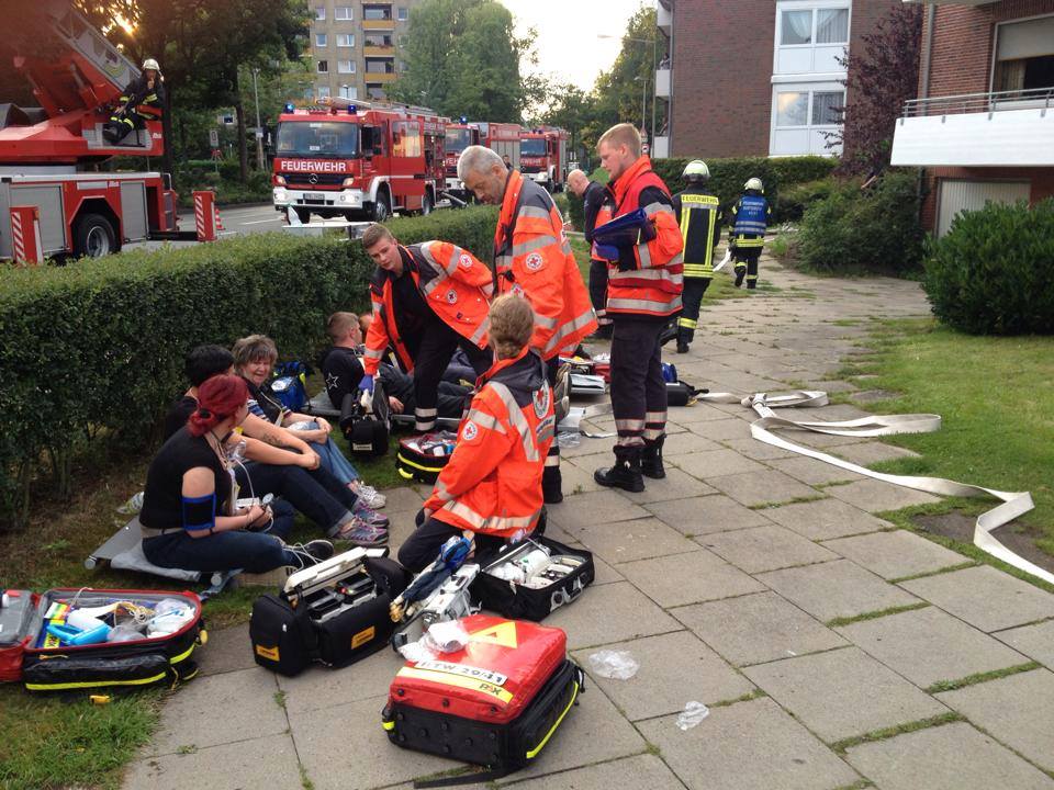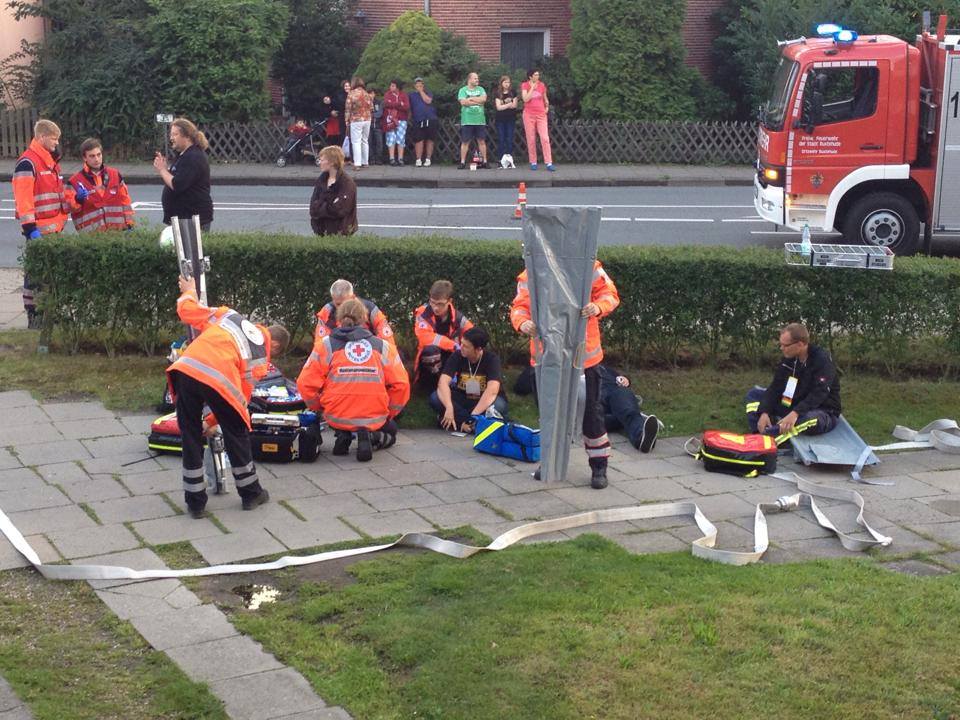 Beim Eintreffen des zunächst alarmierten Rettungsdienstes löste an der Eingangstür des Wohnhauses der mitgeführte CO-Warner aus. Zum Eigenschutz, für weitere Messungen und eventuelle Evakuierungsmaßnahmen wurden durch die Rettungskräfte daraufhin umgehend die Feuerwehr und die DRK Bereitschaft Buxtehude mit den Stichworten "CO-Austritt in Wohnhaus" und "MANV" (Massenfall von Verletzten) alarmiert.