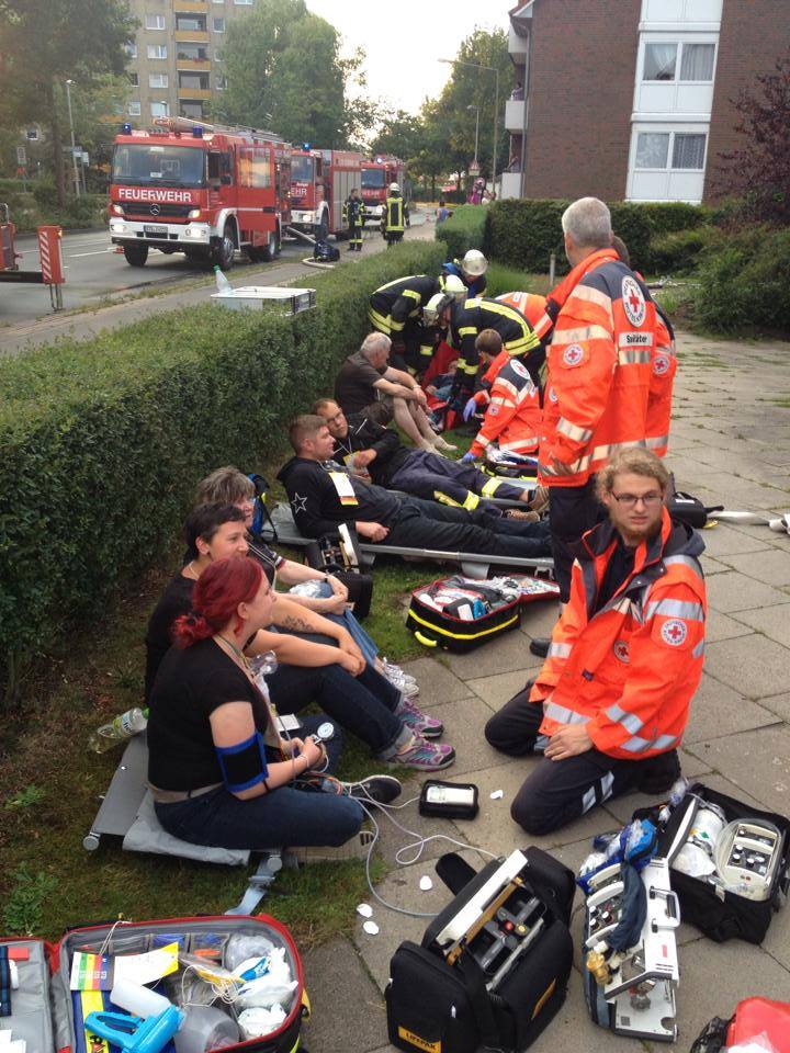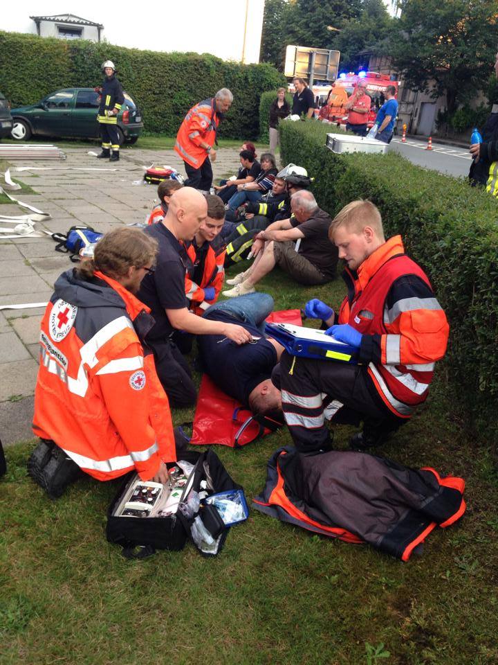 Zeitgleich wurden durch die hauptamtlichen Kräfte vom Rettungsdienst und die DRK Bereitschaft eine Verletztensammelstelle eingerichtet, an der die elf betroffenen Personen betreut und versorgt wurden.