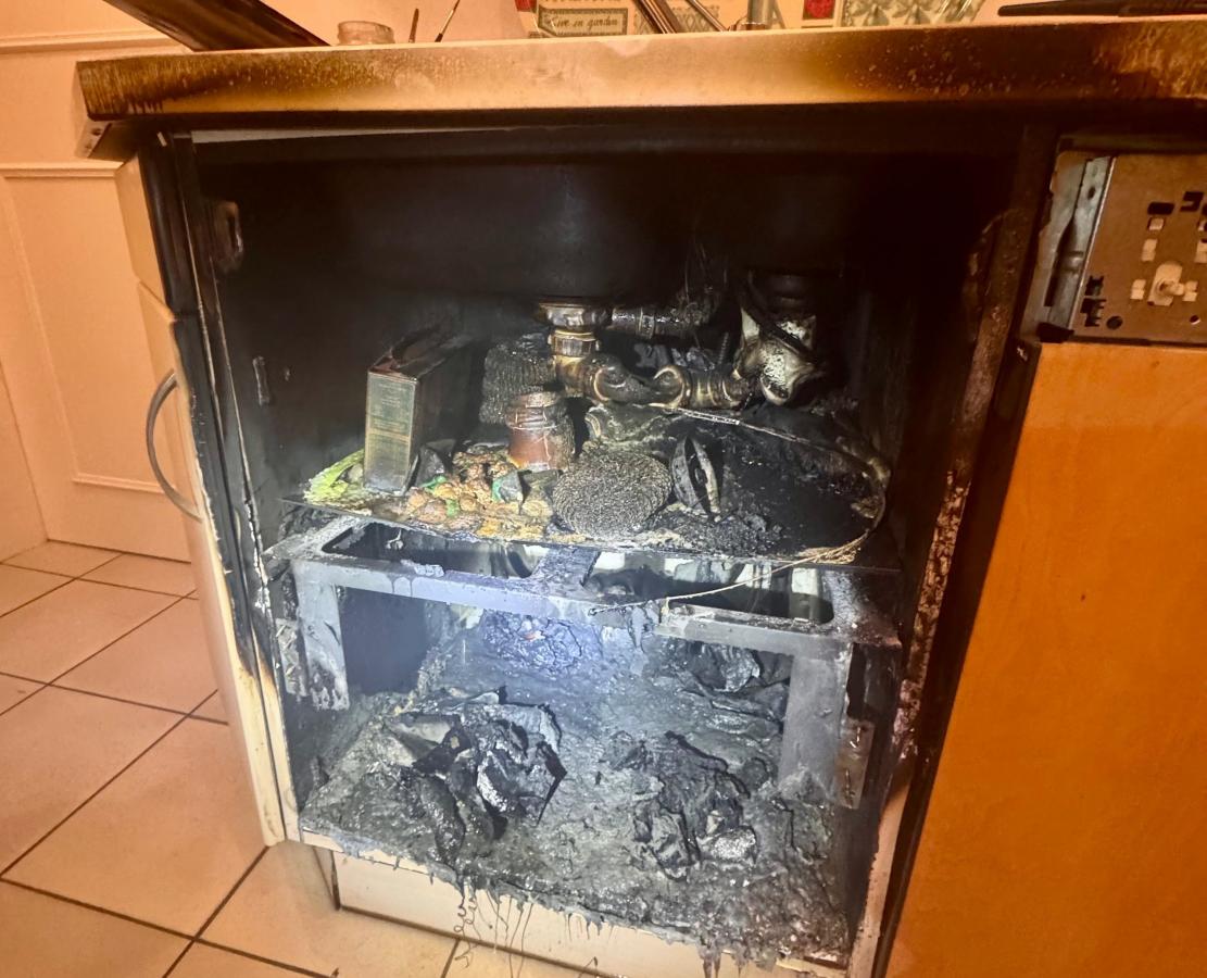 Der Schwelbrand im Bereich eines Schrankes unterhalb der Küchenspüle konnte rasch gelöscht werden. Glücklicherweise hatte sich das Feuer nicht weiter ausgebreitet. Durch den Brand war dann auch der Grund für den Wasseraustritt zu erklären - die Hitzeentwicklung hatte einen Schlauch zur Armatur zum Platzen gebracht. Wasser trat unkontrolliert aus, hatte aber so auch ungeplant beim Ablöschen des Feuers geholfen. Mit der Wärmebildkamera wurden die angrenzenden Bereiche kontrolliert.
