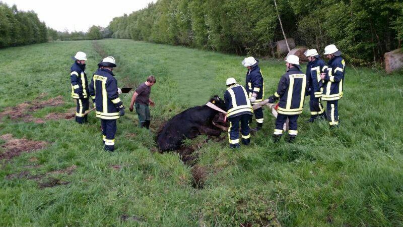 Parallel zum Feuer in der Rübker Straße heulten am frühen Abend in Dammhausen am Dienstabend die Sirenen. Der Stader Feuerwehr-und Rettungsleitstelle war eine Kuh gemeldet worden, die im Bereich der Gurkenallee in einem Graben gefangen war und sich nicht mehr selbst retten konnte.