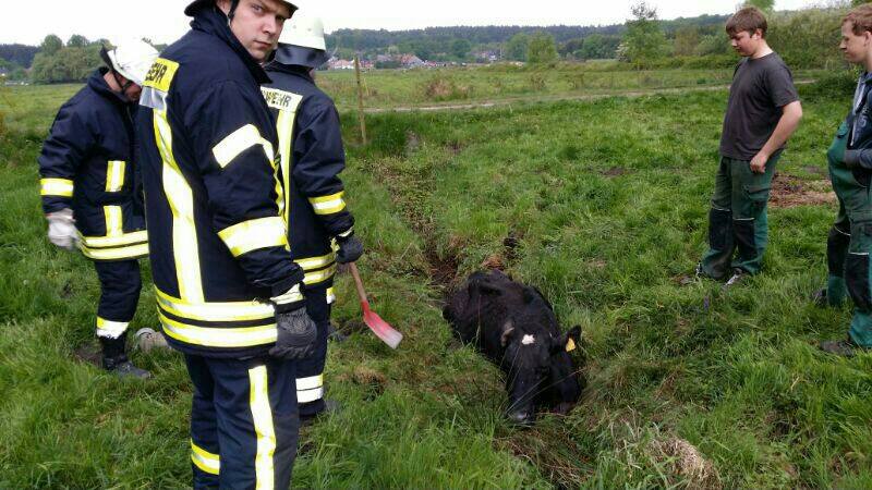 Die angerückten Einsatzkräfte der Ortsfeuerwehr Dammhausen legten zunächst den vorderen Teil des Tieres frei, um es anschließend seitlich aus dem Graben ziehen zu können. Dies gelang auch recht problemlos, so dass der Einsatz nach einer halben Stunde beendet werden konnte.