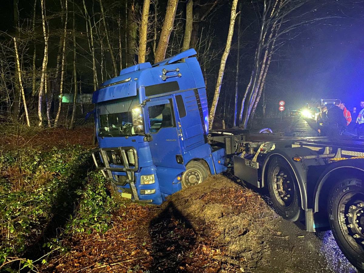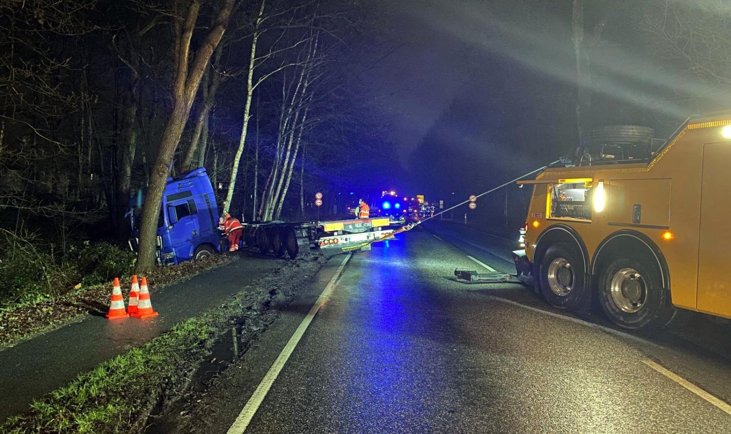 Am Mittwochmorgen ist ein Sattelzug auf der Bundesstraße 73 von der Straße abgekommen. Hinter dem EVB-Bahnübergang sei der in Richtung Hamburg fahrende Lkw plötzlich auf die Gegenfahrbahn und schließlich in den Wald geraten. Dort prallte er mit der Seite gegen einen Baum. Bei dem Unfall blieb der Fahrer unverletzt. Um 5:17 Uhr wurden die Ortsfeuerwehren Neukloster, Hedendorf, sowie Buxtehude (Zug I) alarmiert. Nach einer kurzen Erkundung verblieb nur die Ortsfeuerwehr Neukloster an der Einsatzstelle, um dort den Brandschutz sicherzustellen, die Einsatzstelle auszuleuchten und die Polizei bei Absperrmaßnahmen zu unterstützen. Das verunfallte Fahrzeug wurde durch eine Fachfirma geborgen und wieder fahrbereit gemacht. So konnte der Lastkraftwagen dann selbstständig in die nächste Werkstatt gefahren werden. Die Cuxhavener Straße (B73) war zeitweise für die Bergung komplett gesperrt, die ab 8:00 Uhr wieder komplett freigegeben wurde.