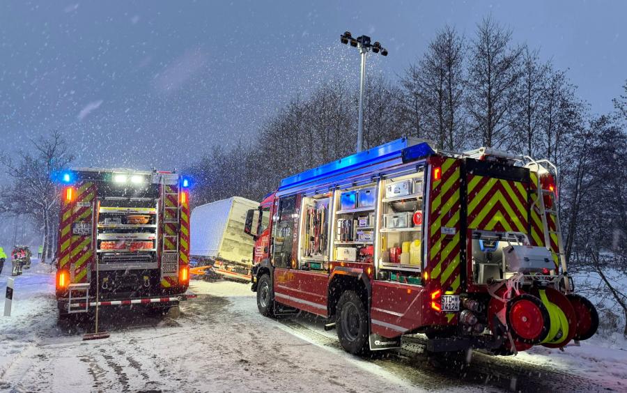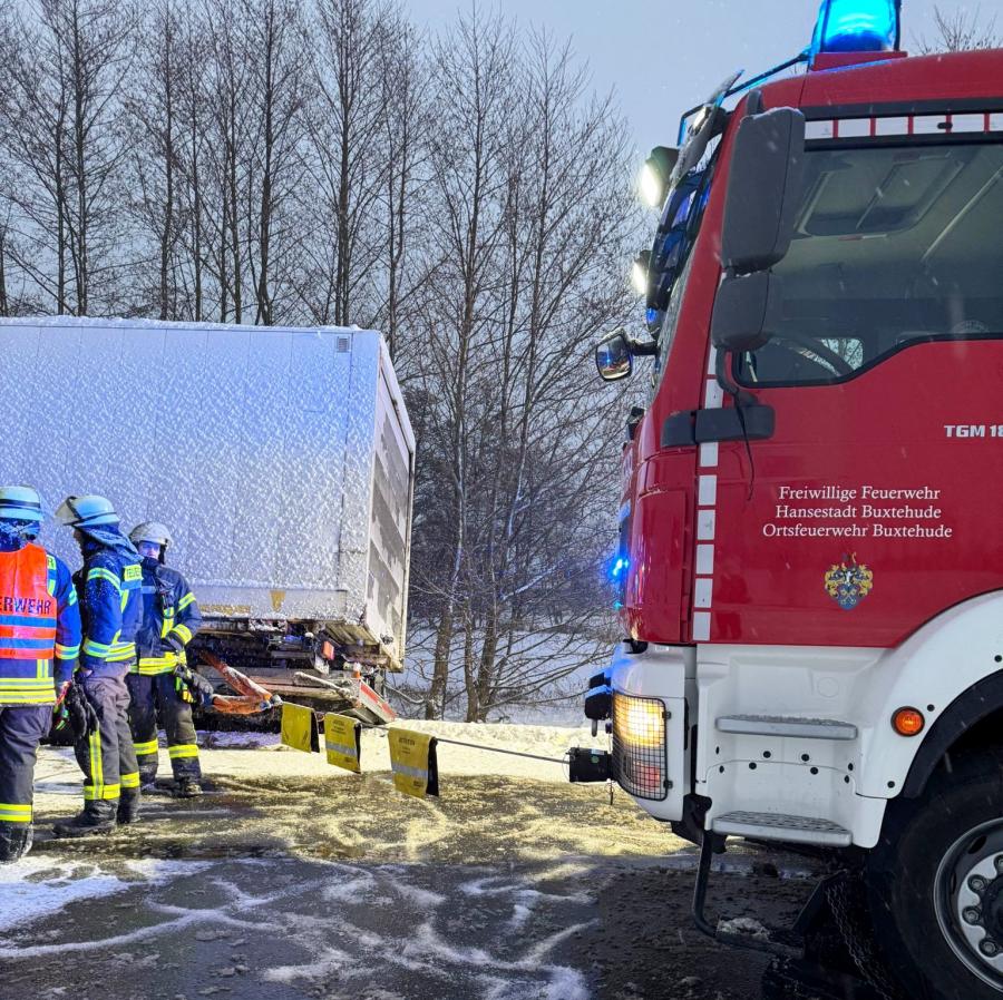 Bei schneeglatter Fahrbahn geriet am Donnerstagmorgen ein mit Textilien beladener LKW auf der K26 kurz vor der Autobahnauffahrt Jork in den Seitenraum, sackte ein und drohte in Schieflage weiter in den dortigen Straßengraben zu rutschen. Der Fahrer blieb unverletzt und konnte sich selbst in Sicherheit bringen.