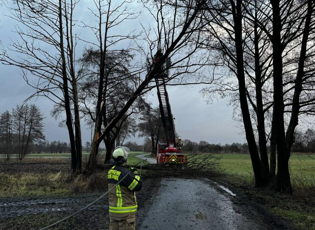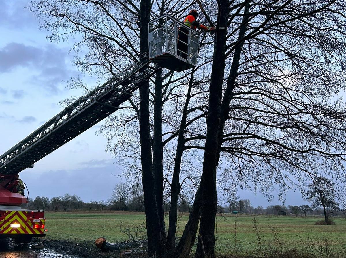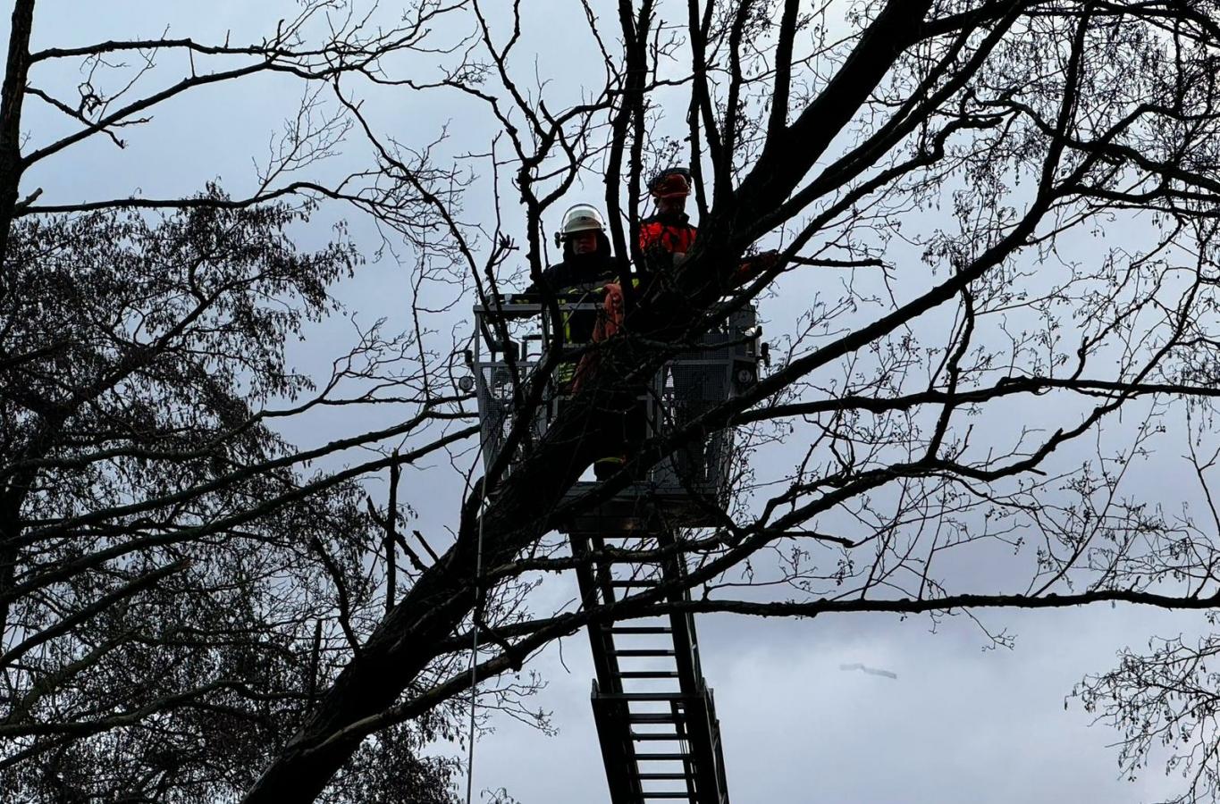 Die alarmierten Einsatzkräfte vom Zug I der Ortsfeuerwehr Buxtehude konnten mit Hilfe der Drehleiter eine Schlinge am Baum anschlagen und diesen mit Hilfe der Seilwinde des Rüstwagens aus sicherer Entfernung umziehen.