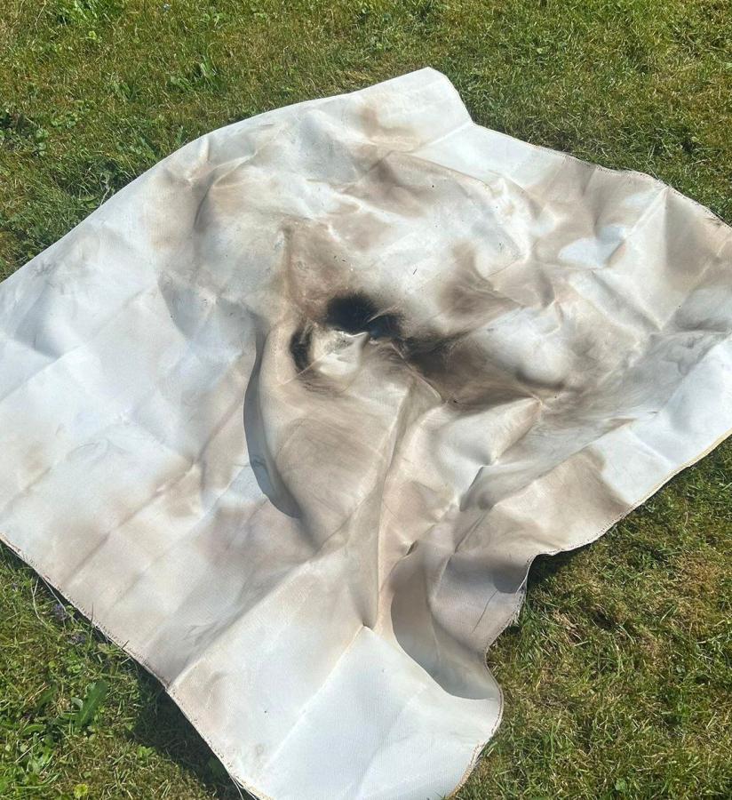Aufgrund der schnellen Flammenausbreitung erschrak der Bediener und warf das Gerät vor Schreck weg, in Richtung einer Hecke und einer angrenzenden Scheune.