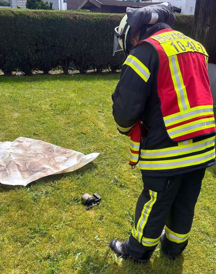 Beim Eintreffen der alarmierten Einsatzkräfte beider Züge der Ortsfeuerwehr Buxtehude war das Feuer bereits mit einer Löschdecke erstickt worden. Glücklicherweise beschränkte sich der Schaden nur auf das Gerät und eine leicht verkohlte Rasenfläche. Hecke und Scheune hatten kein Feuer gefangen.