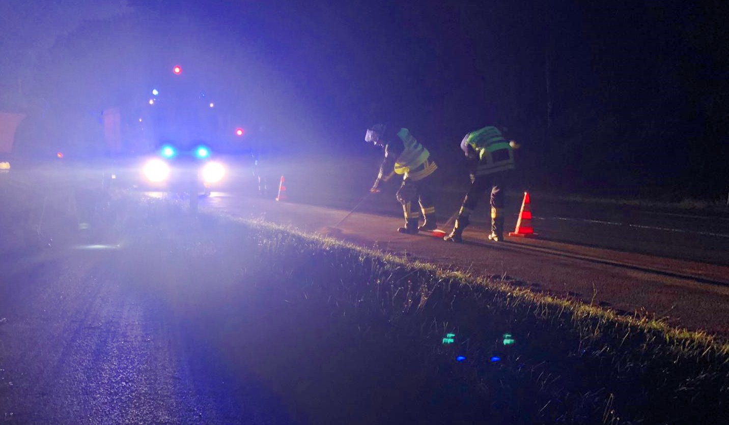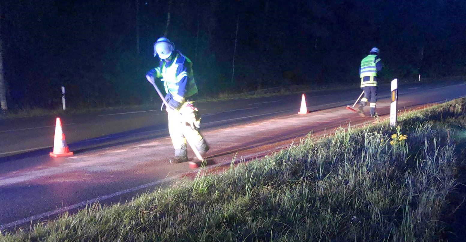 Nach der Absicherung der Einsatzstelle übernahmen die Kräfte das Abstreuen der Ölspur und übergaben die abgestreute Fläche anschließend an die Polizei. Kräfte vom Bauhof kümmerten sich um das Aufnehmen des Bindemittels und das Aufstellen von Warnschildern.