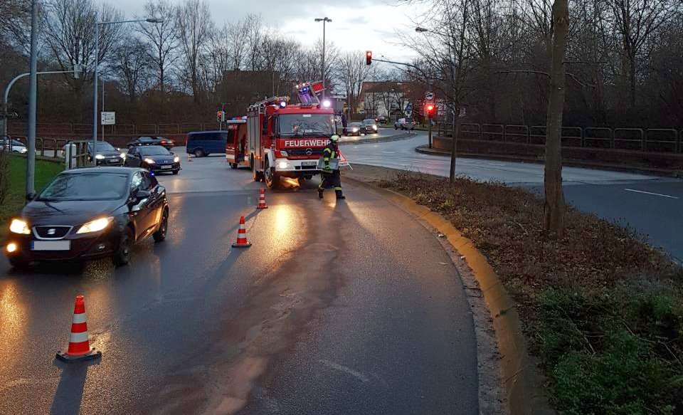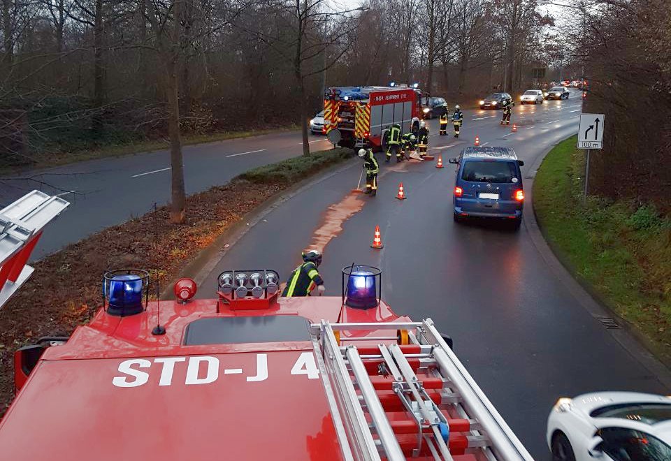Die alarmierten Einsatzkräfte vom Zug I der Ortsfeuerwehr Buxtehude streuten den betroffenen, etwa 50m langen Bereich ab. Es kam zu Beeinträchtigungen im Feierabendverkehr. Nachdem die Gefahr beseitigt war, konnten die Kräfte der drei eingesetzten Fahrzeuge wieder einrücken.