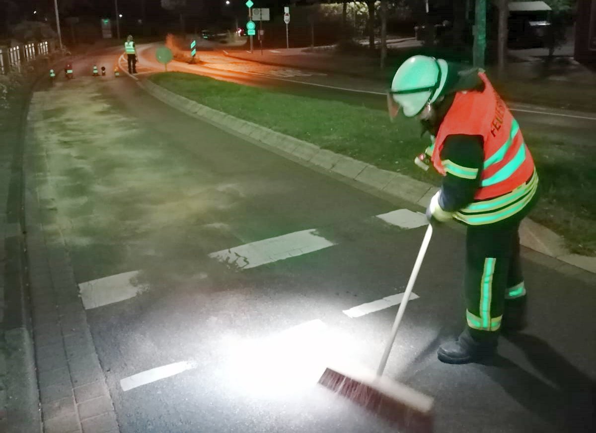 Das Hilfeleistungslöschfahrzeug vom Zug II rückte mit drei Feuerwehrkräften aus, die die Ölspur abstreuten.