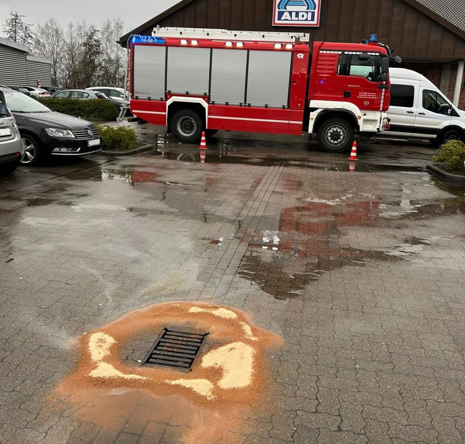 Nach dem Tanken eines Feuerwehrfahrzeugs fiel dem Fahrer am Freitagmittag auf dem Schützenhofweg eine schimmernde Ölspur auf, die sich bis auf den Parkplatz am Verbrauchermarktzentrum Westmoor zog. Vor Ort stellte sich die Spur als austretendes Benzin dar, welches aus einem defekten PKW gelaufen war.