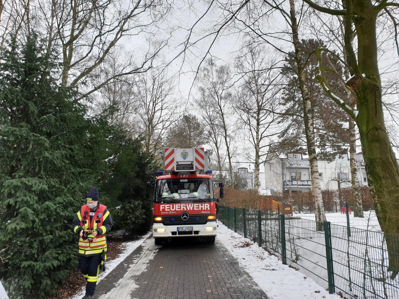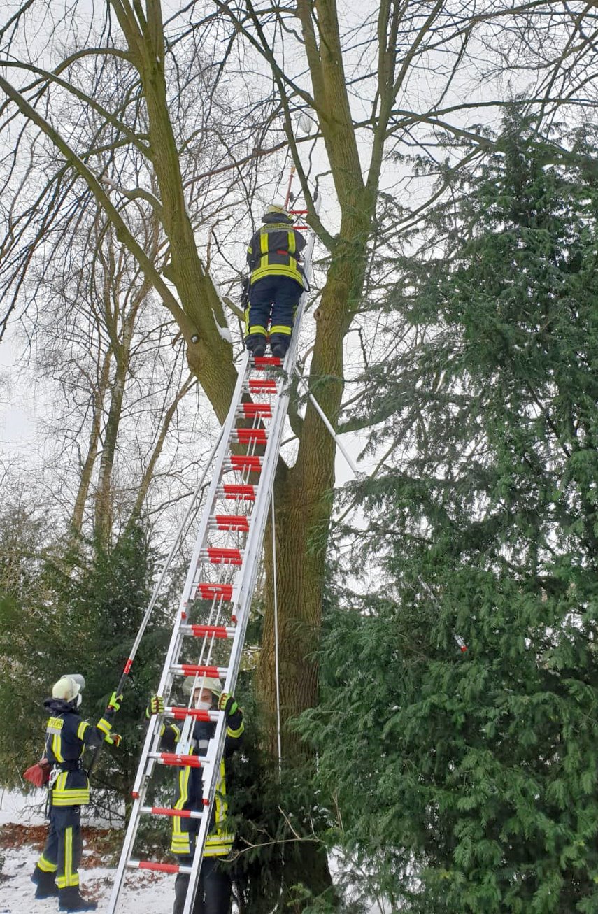 Mit allen zur Verfügung stehenden Mitteln versuchten die eintreffenden Einsatzkräfte über tragbare Leitern und die Drehleiter den Vogel einzufangen. Leider wollte das Tier jedoch seine Freiheit weiter genießen, so dass es den Feuerwehrkräften immer wieder entwischte und in einem anderen Baum landete. Irgendwann hatte der Vogel dann das Sichtfeld der Einsatzkräfte ganz verlassen, so dass der Einsatz leider erfolglos abgebrochen werden musste.