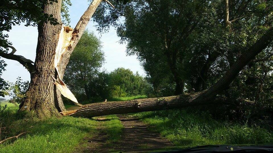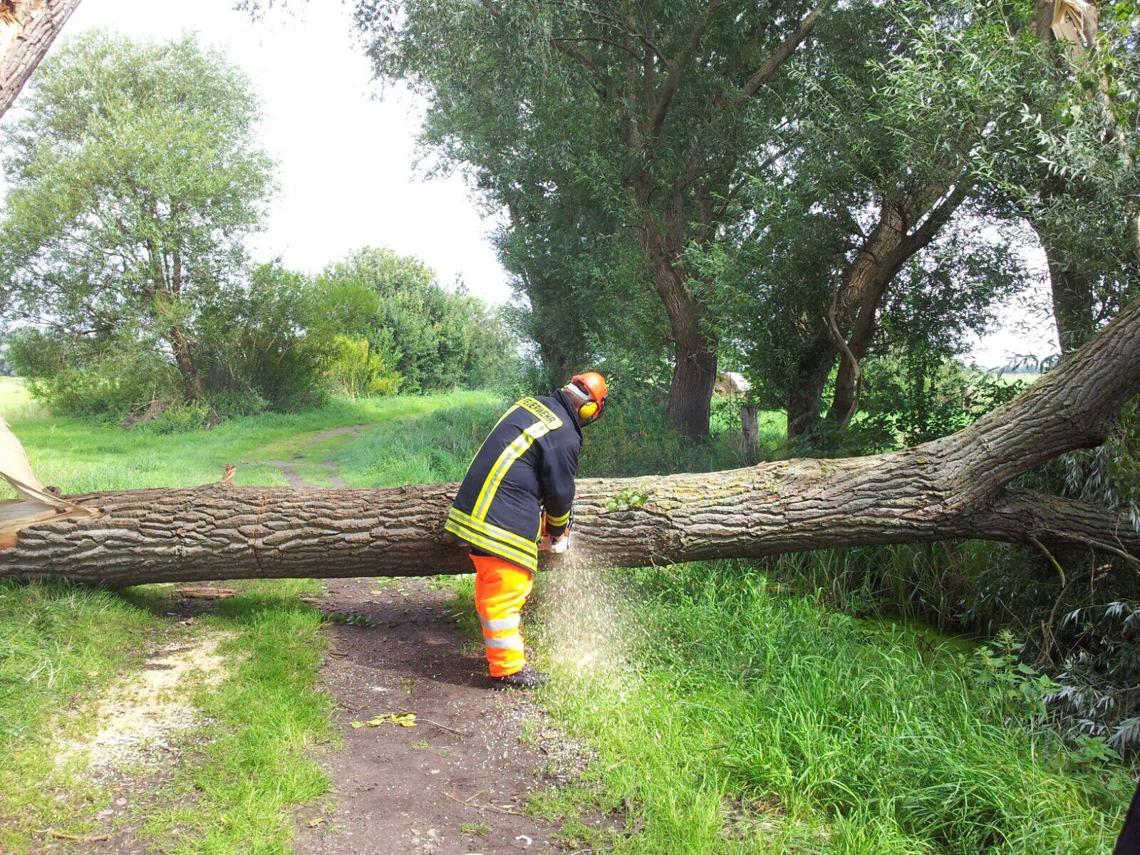 Parallel dazu wurde ein weiteres Fahrzeug zur Erkundung in den Bollweg geschickt. In Verlängerung der Straße ins Moor sollte ein Baum auf dem Feldweg liegen. Vor Ort stellte sich der Baum als etwa 60 Zentimeter dicker Ast heraus, der aus einem Baum herausgebrochen war und nun quer über dem Weg lag. Durch die Kräfte von Rüstwagen und Hilfeleistungslöschfahrzeug wurde das Hindernis zersägt und der Weg geräumt.